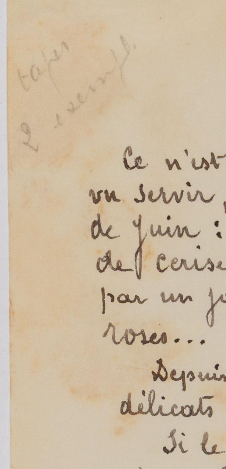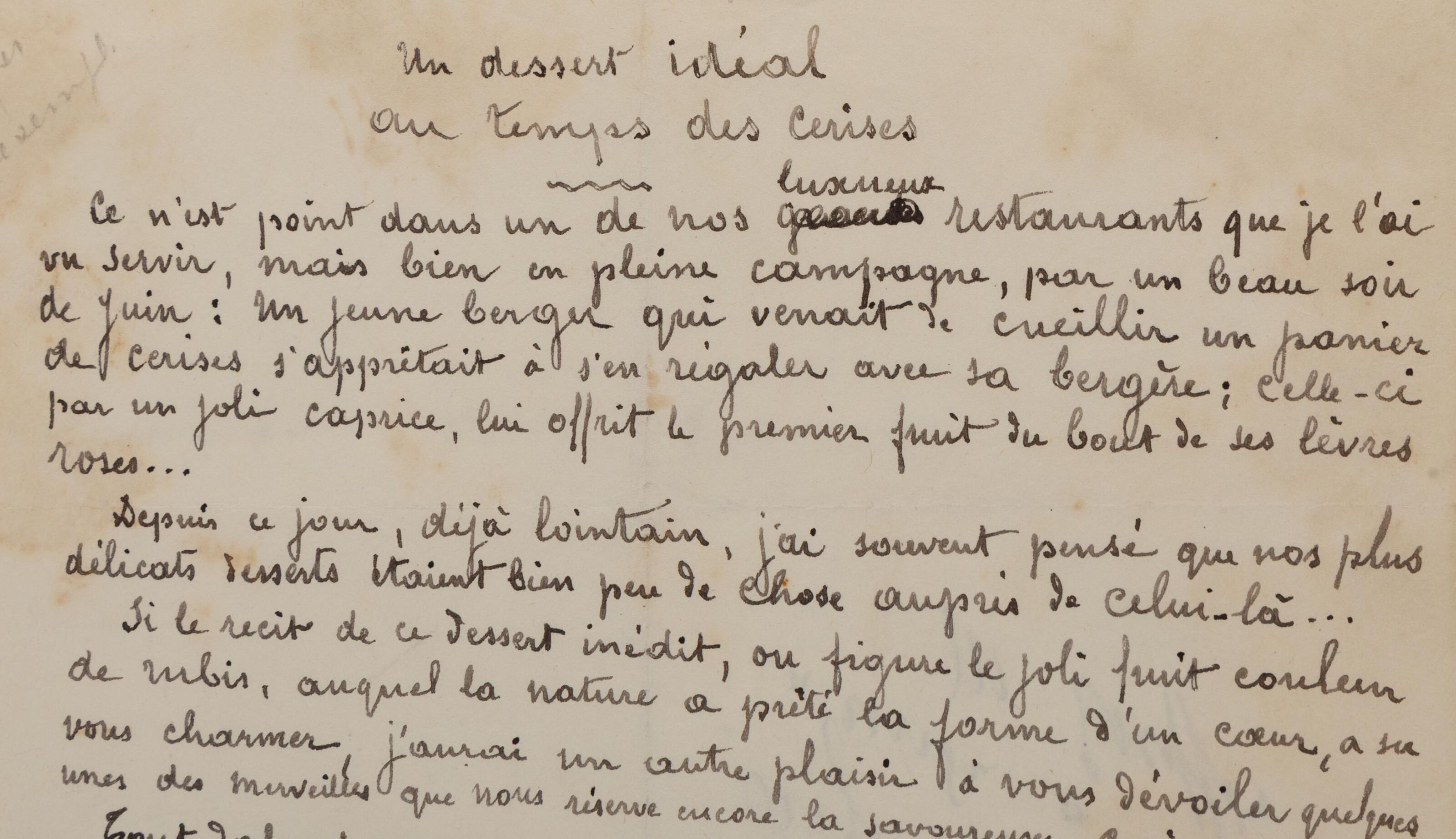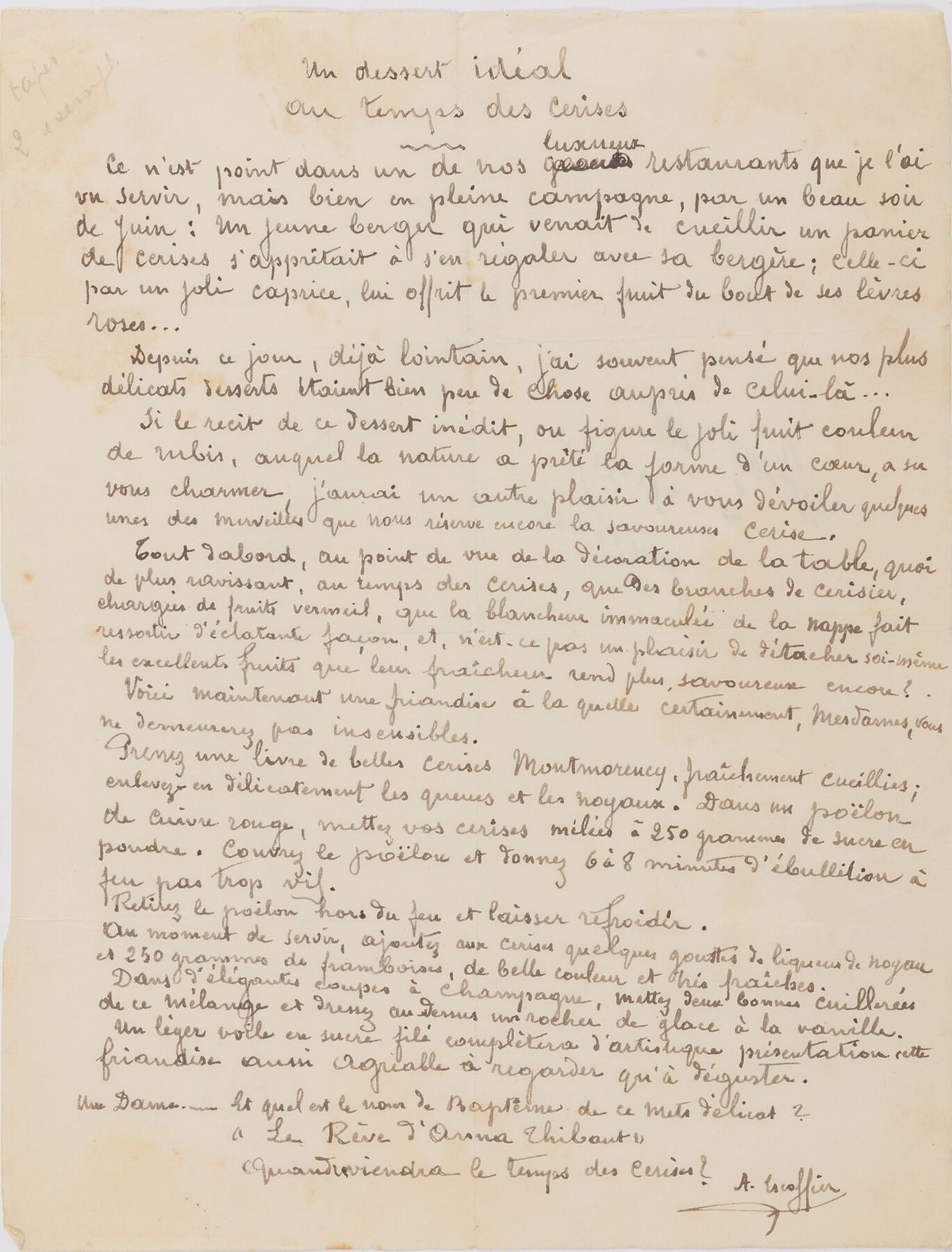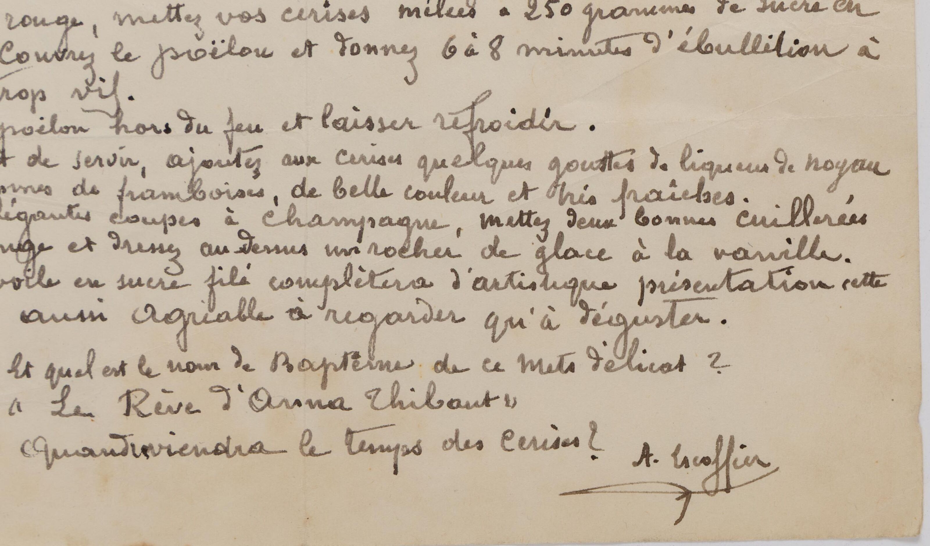 Pièce autographe signée décrivant la recette de Cerises confites au sucre et à la liqueur de noyau, à servir avec "un rocher de glace à la vanille". "Et quel est le nom de baptême de ce met délicat ? 'Le Rêve d'Anna Thibaud' [célèbre chanteuse française du début du XXème siècle]".