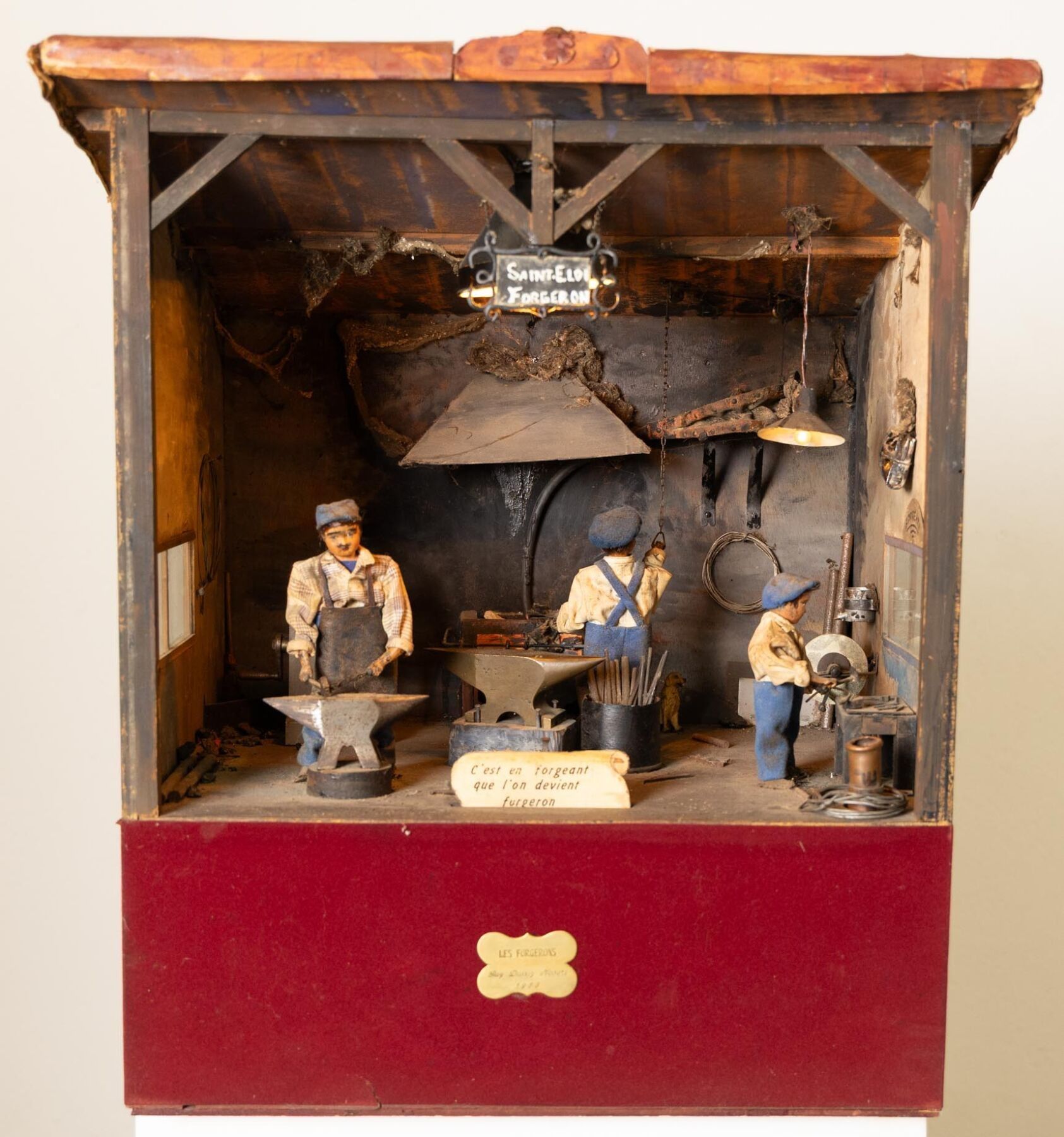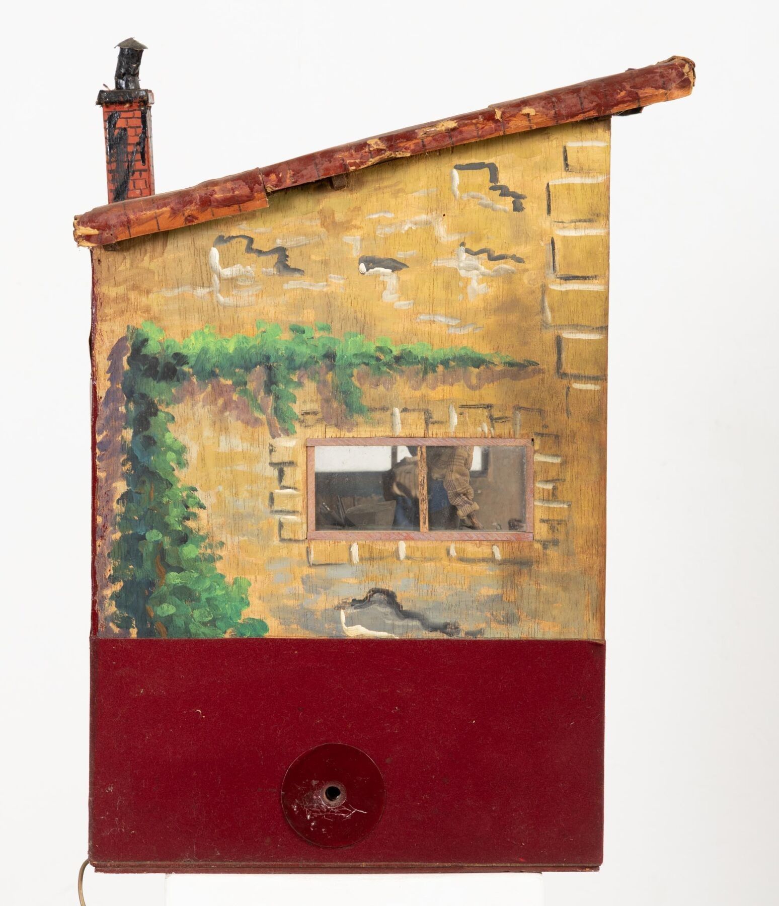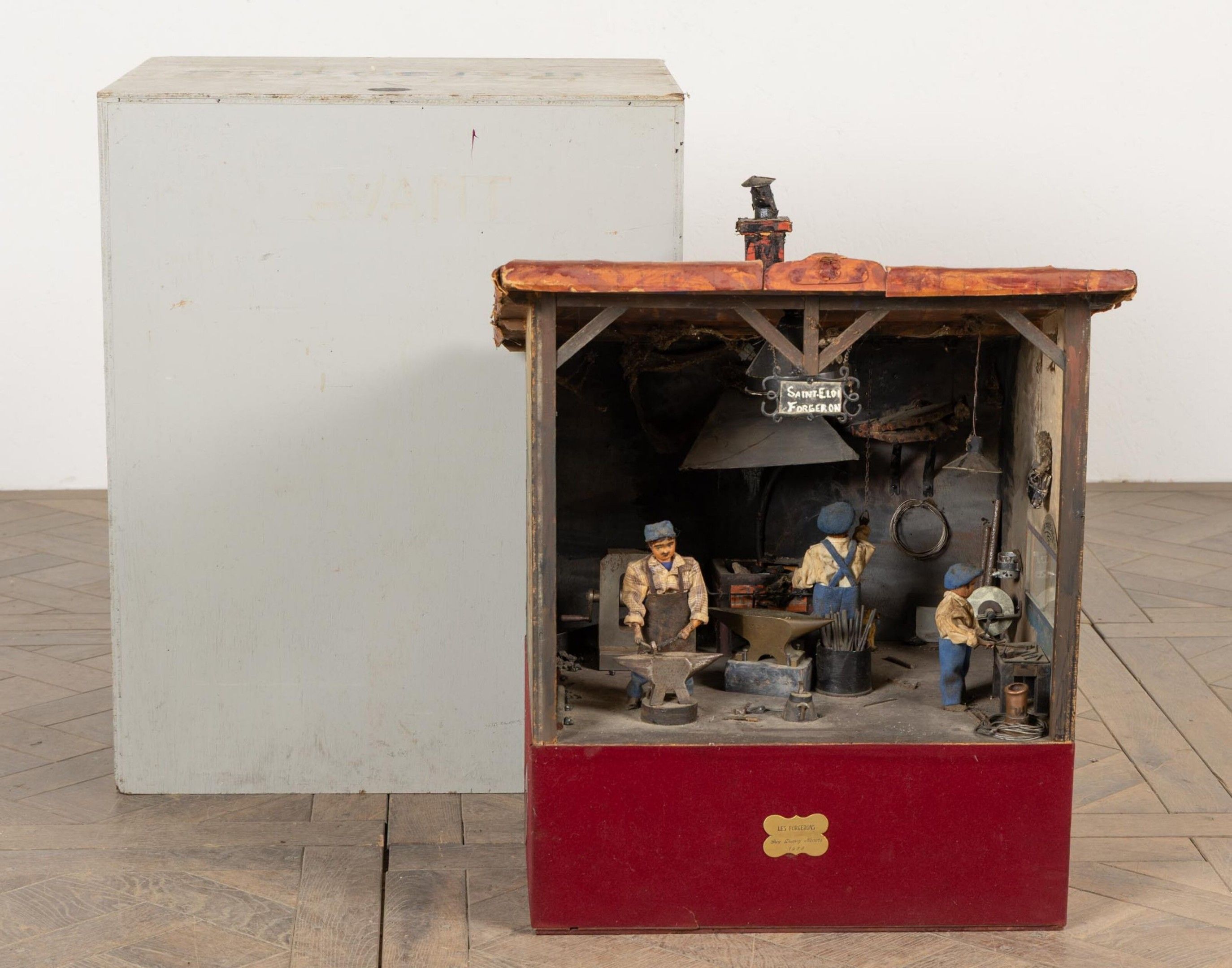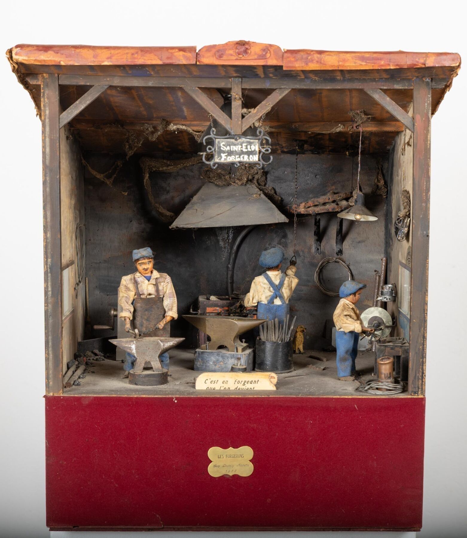 Automate en composition et éléments métalliques dans une structure en bois et carton peints, avec cartouche de laiton titré et daté.