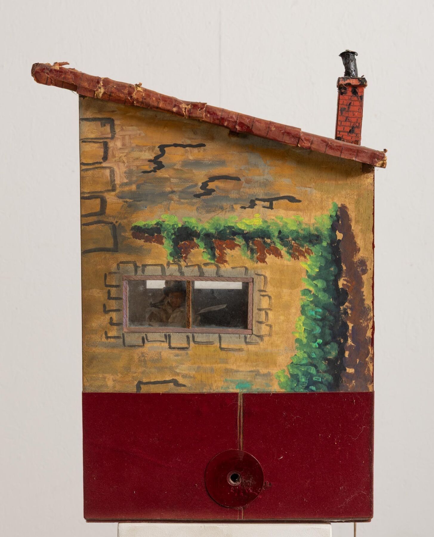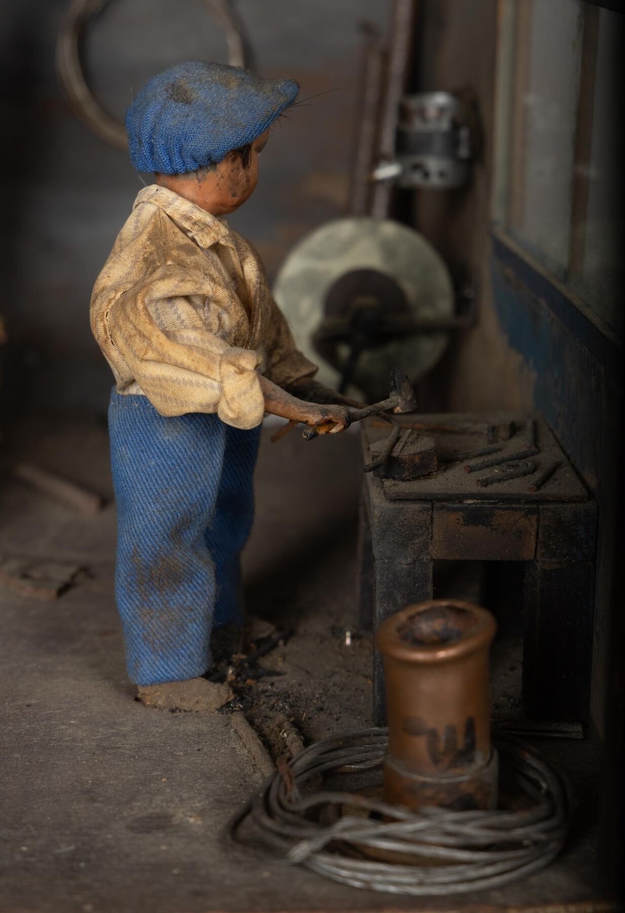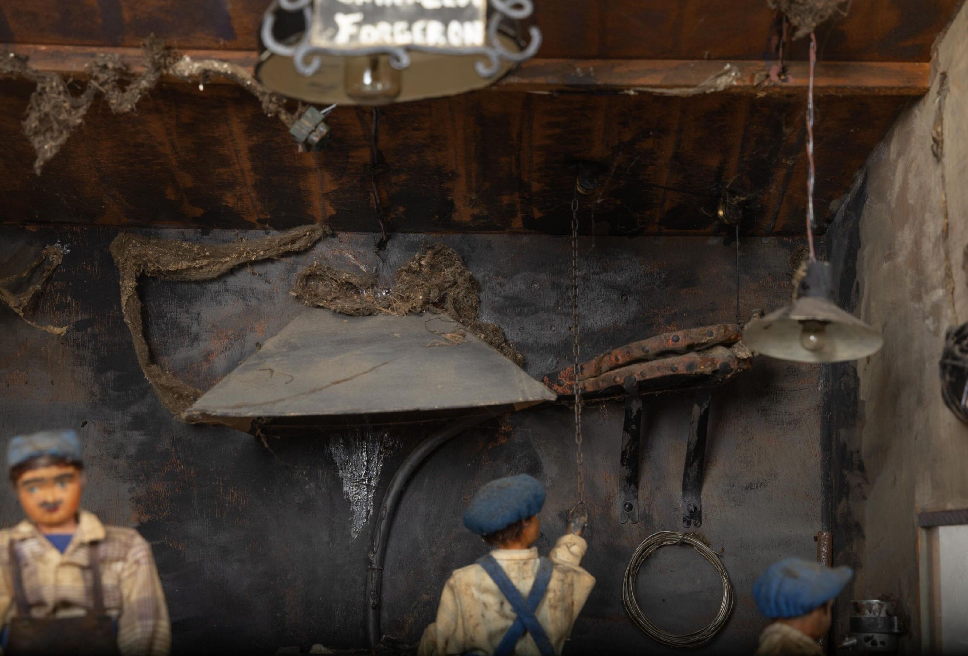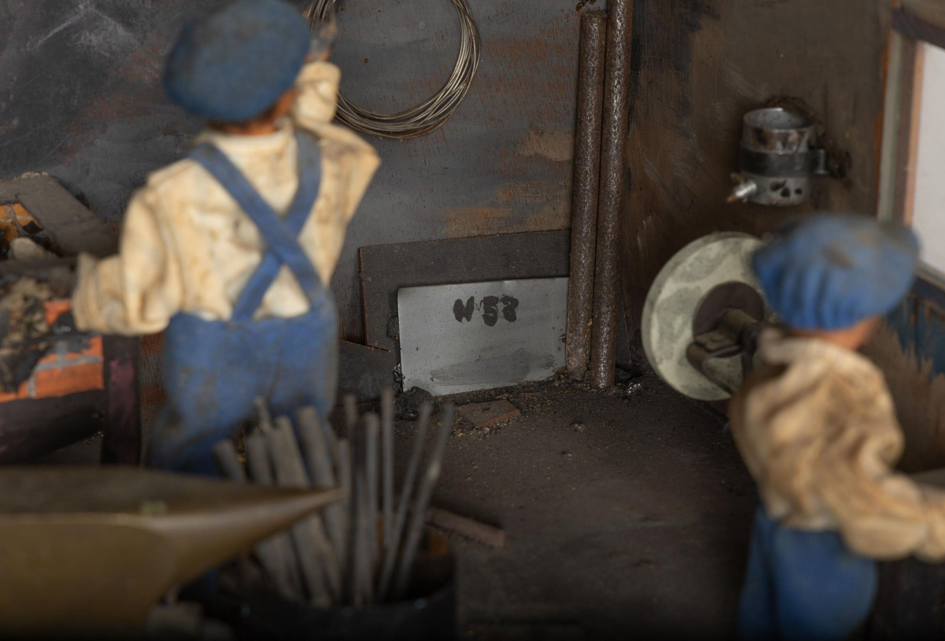 Automate en composition et éléments métalliques dans une structure en bois et carton peints, avec cartouche de laiton titré et daté.