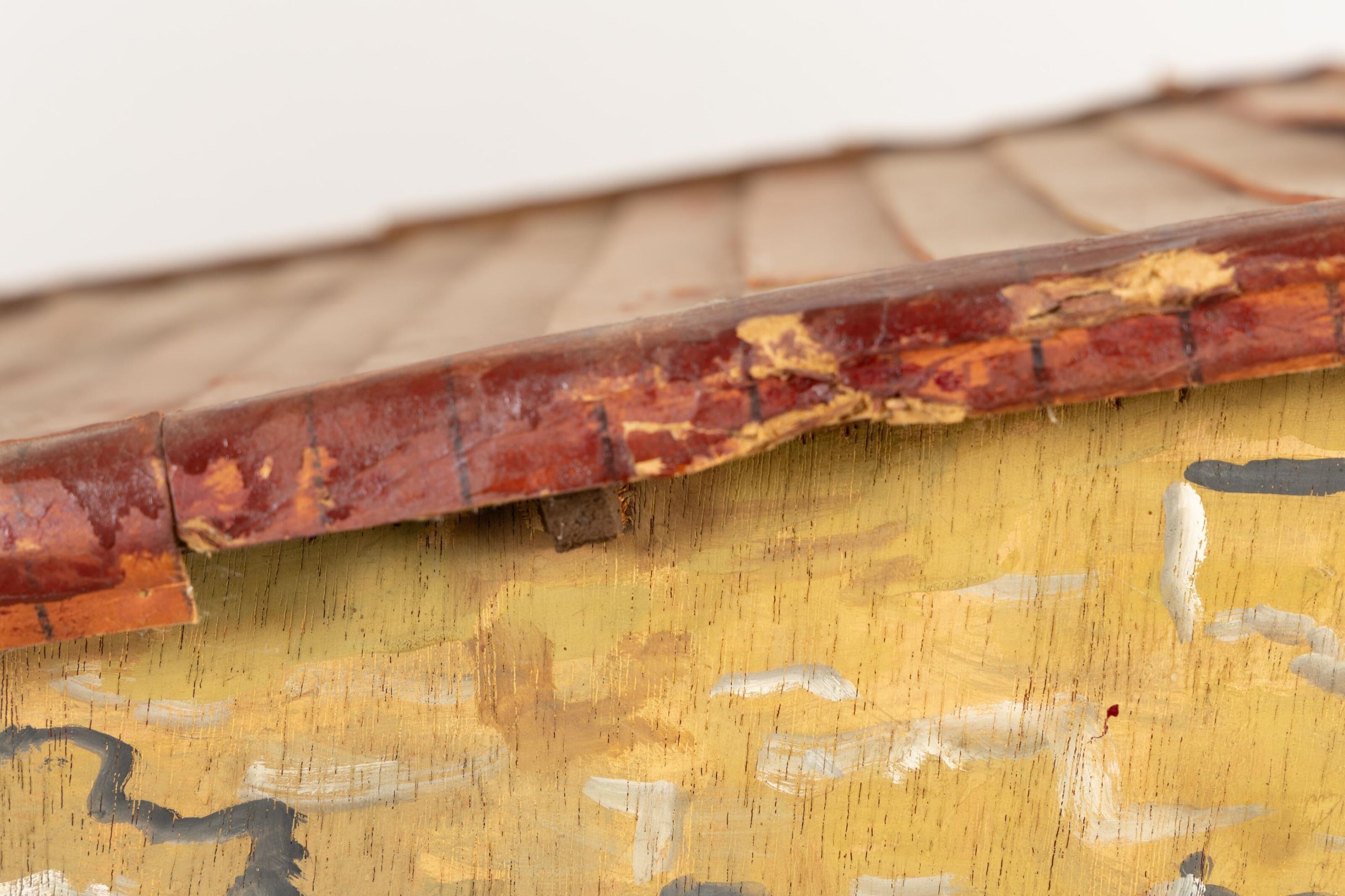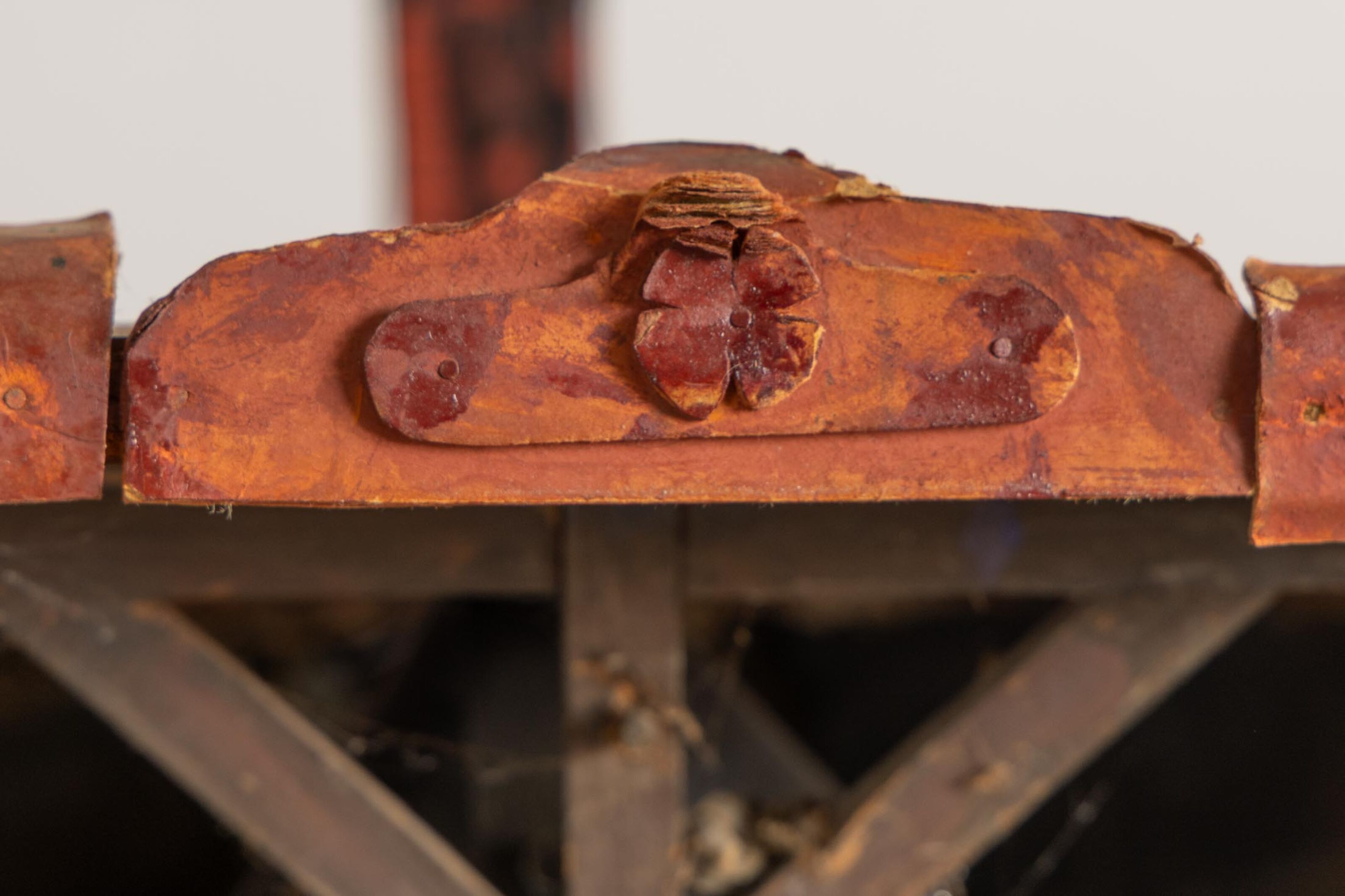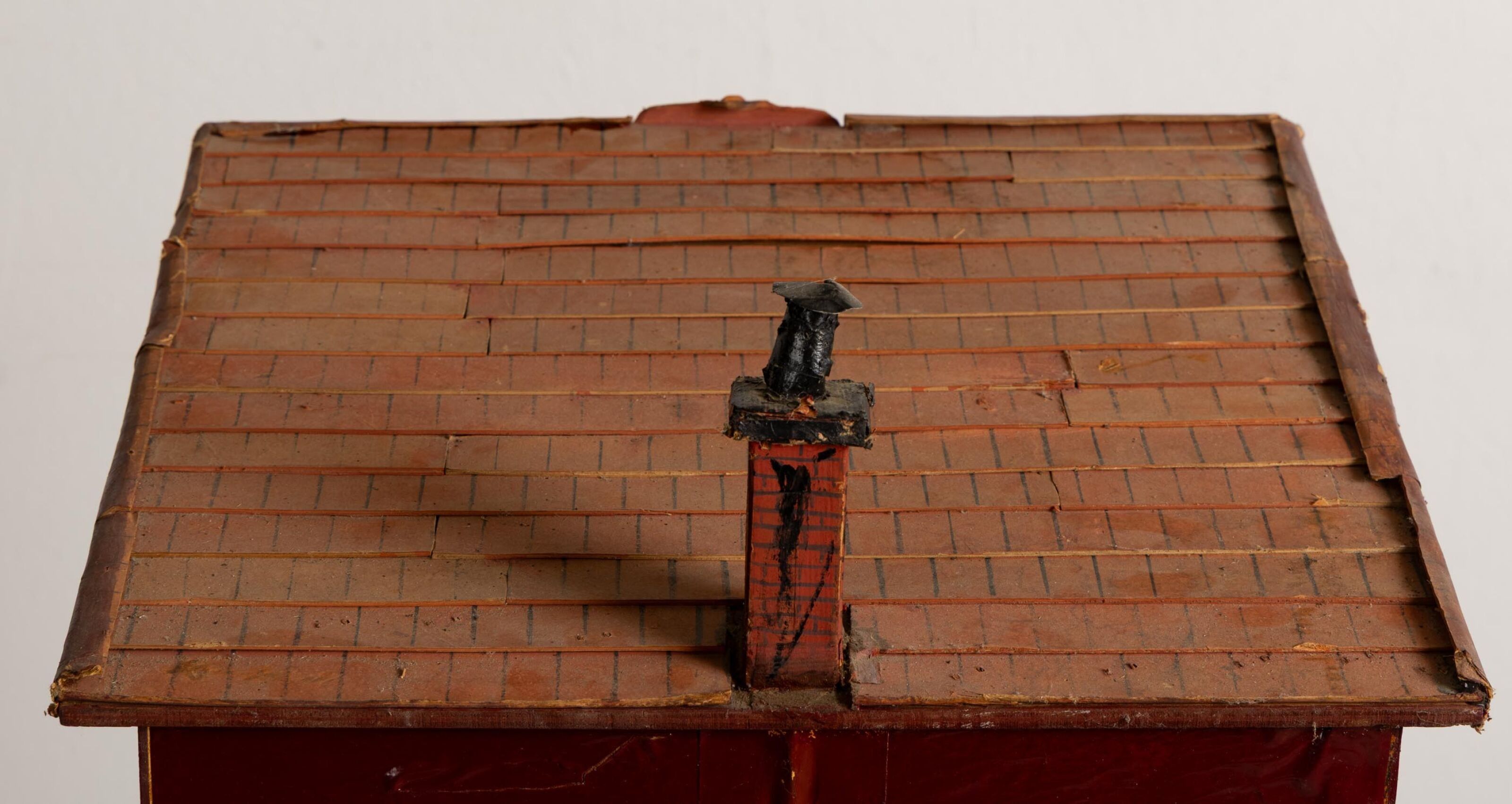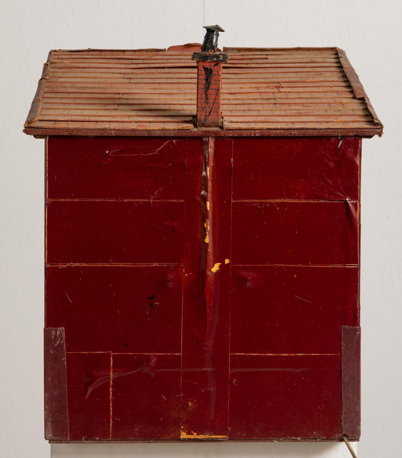 Automate en composition et éléments métalliques dans une structure en bois et carton peints, avec cartouche de laiton titré et daté.