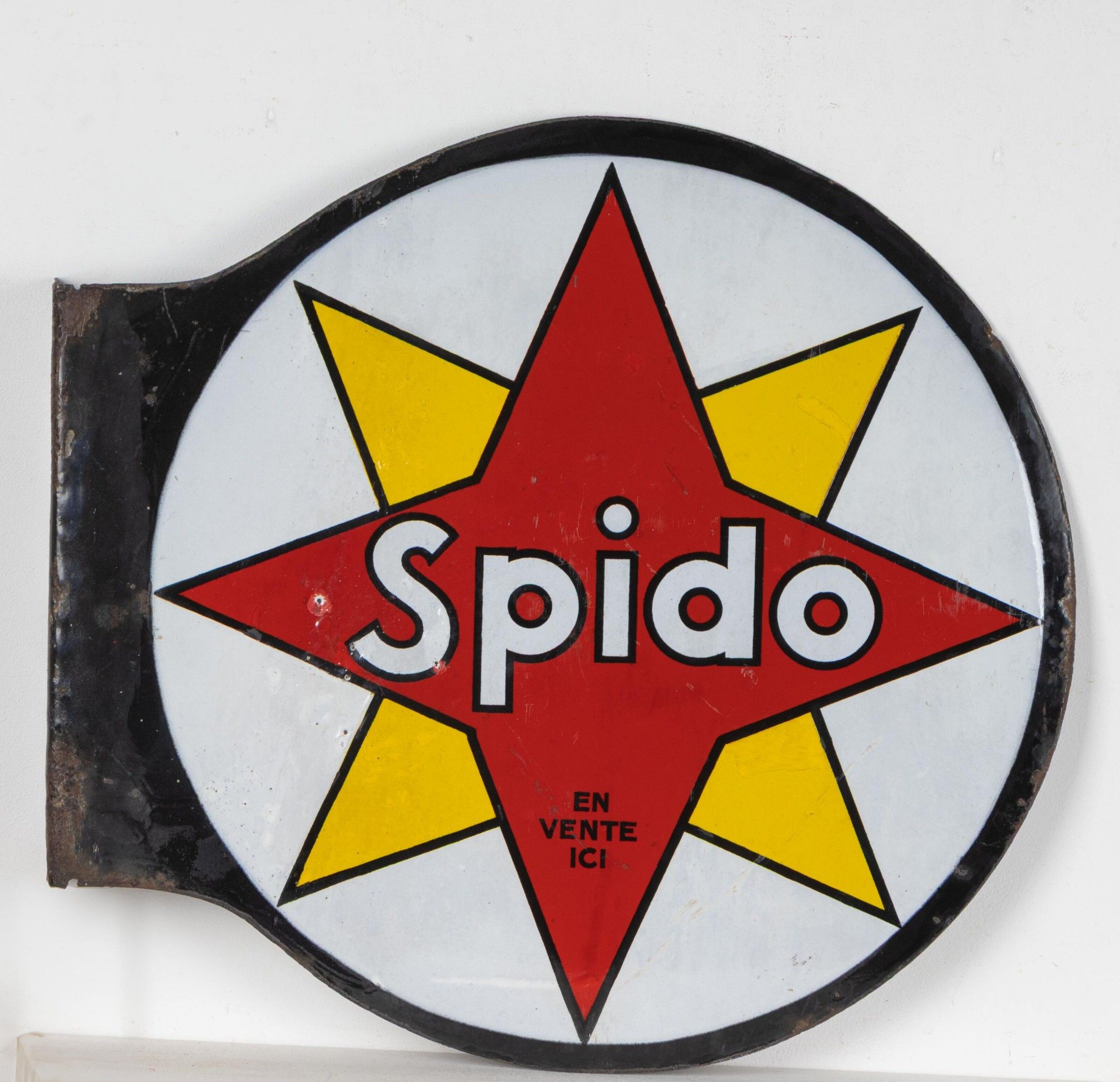 Plaque publicitaire double face de forme ronde en tôle émaillée polychrome. Marquée "Spido - En Vente Ici" dans une étoile stylisée sur fond blanc.