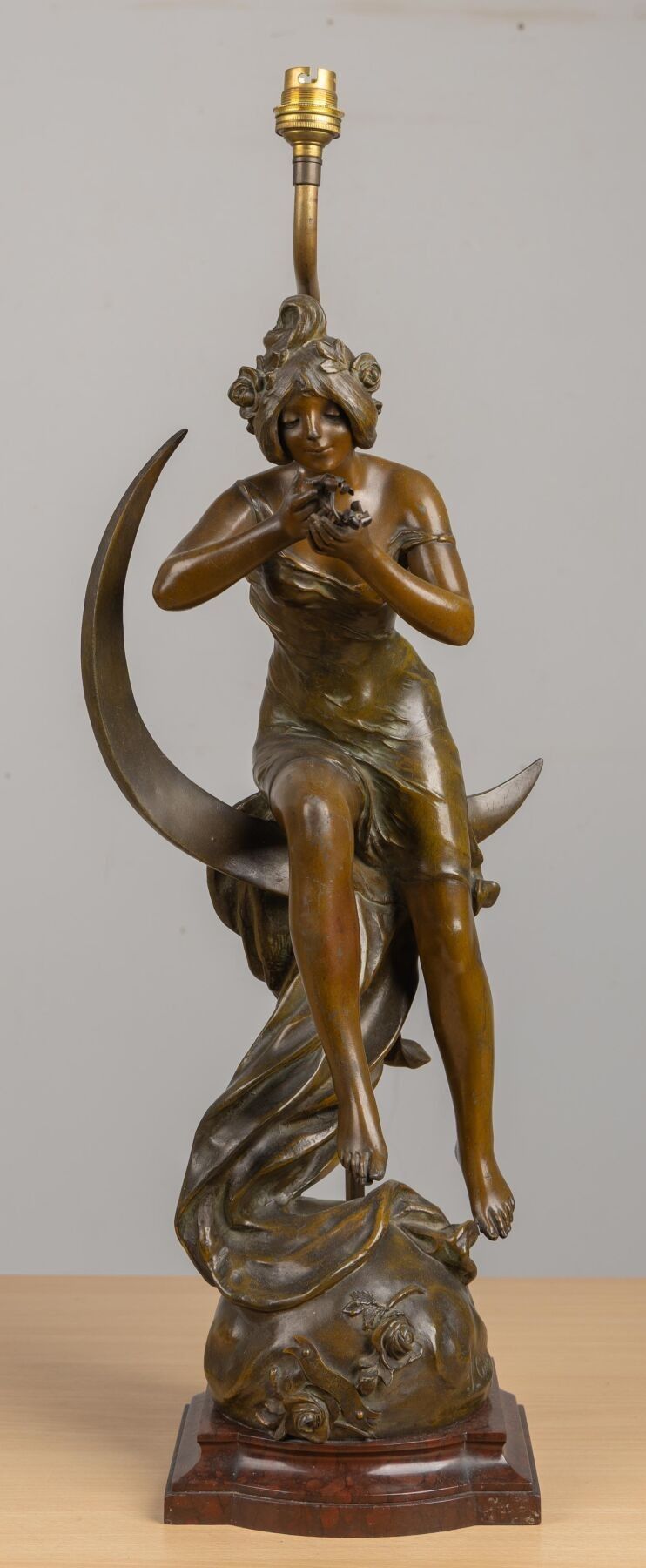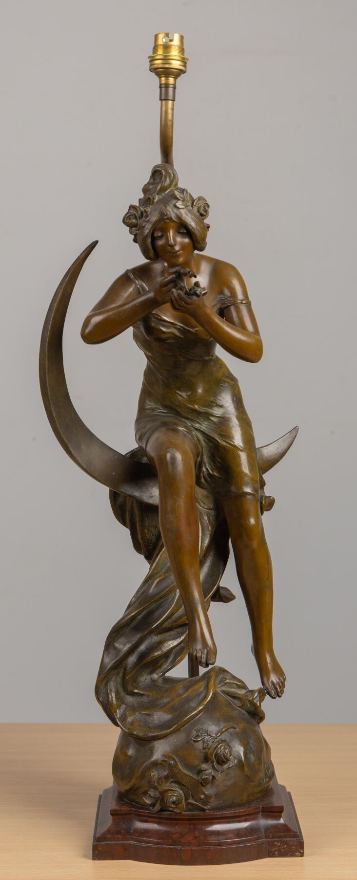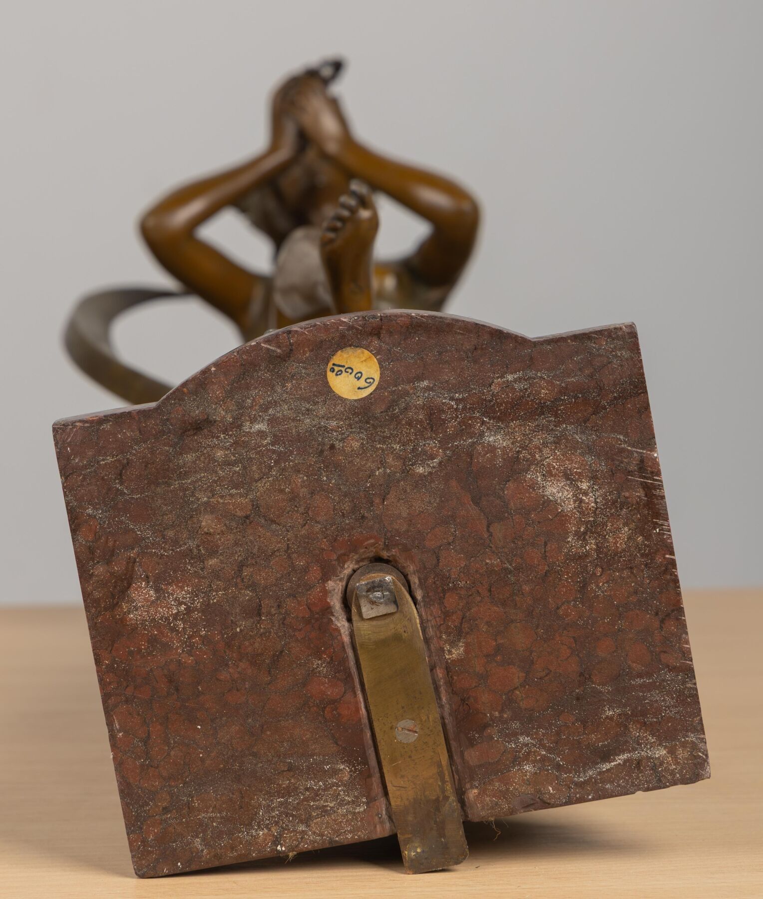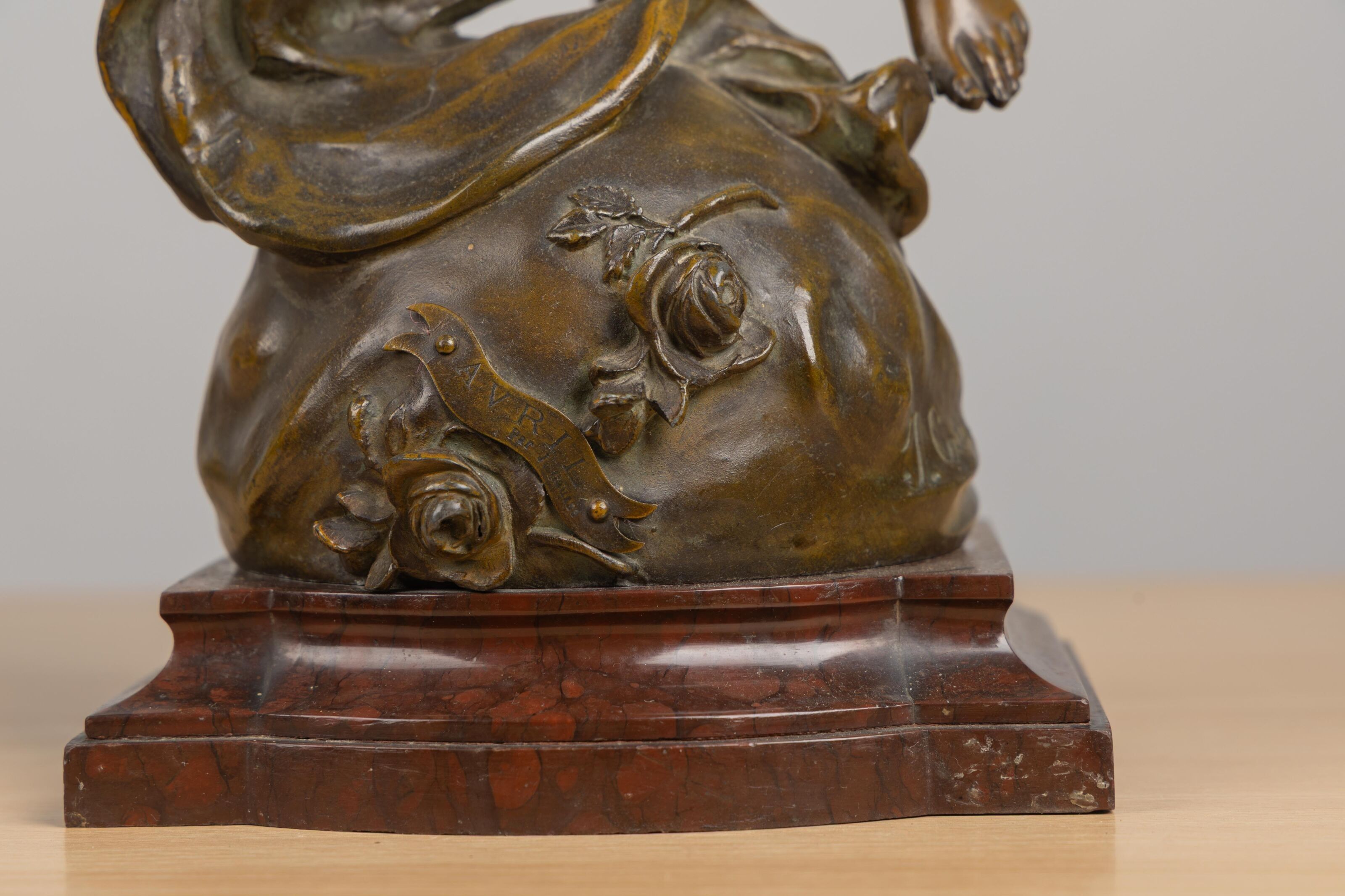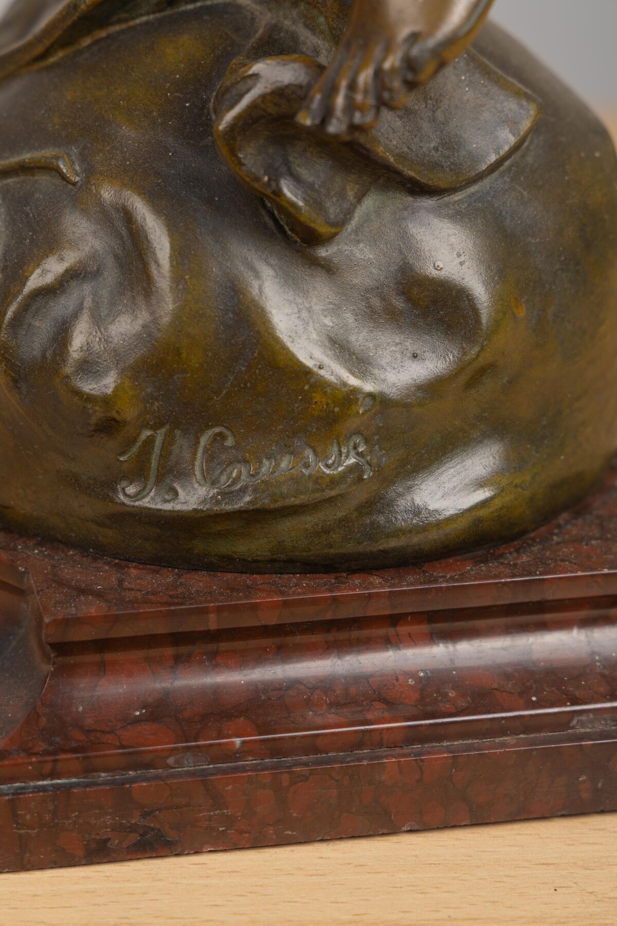 Sculpture en régule patiné bronze, reposant sur une base en marbre rouge.