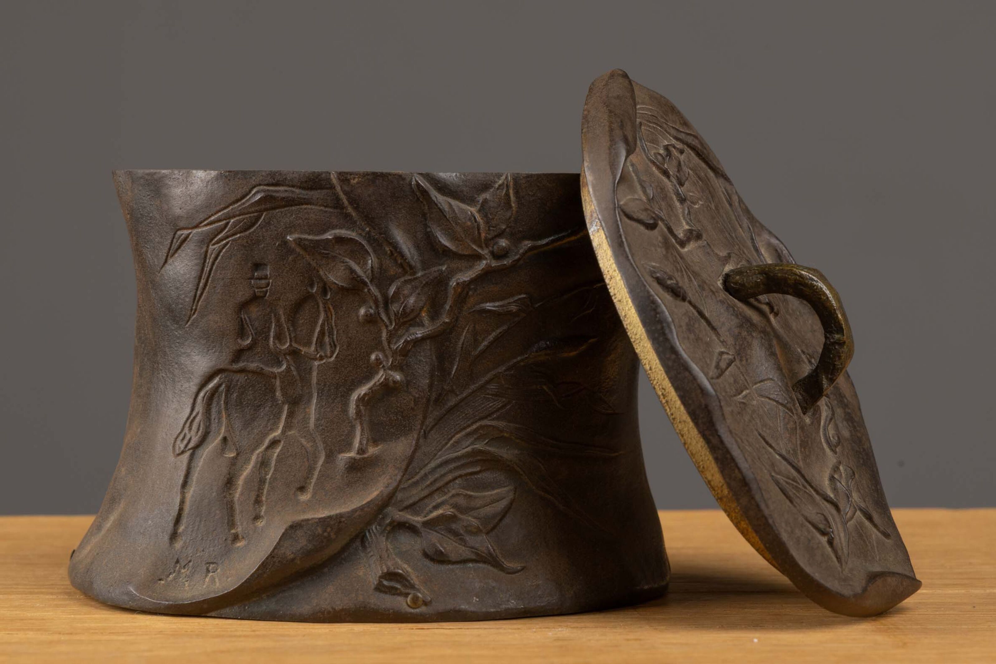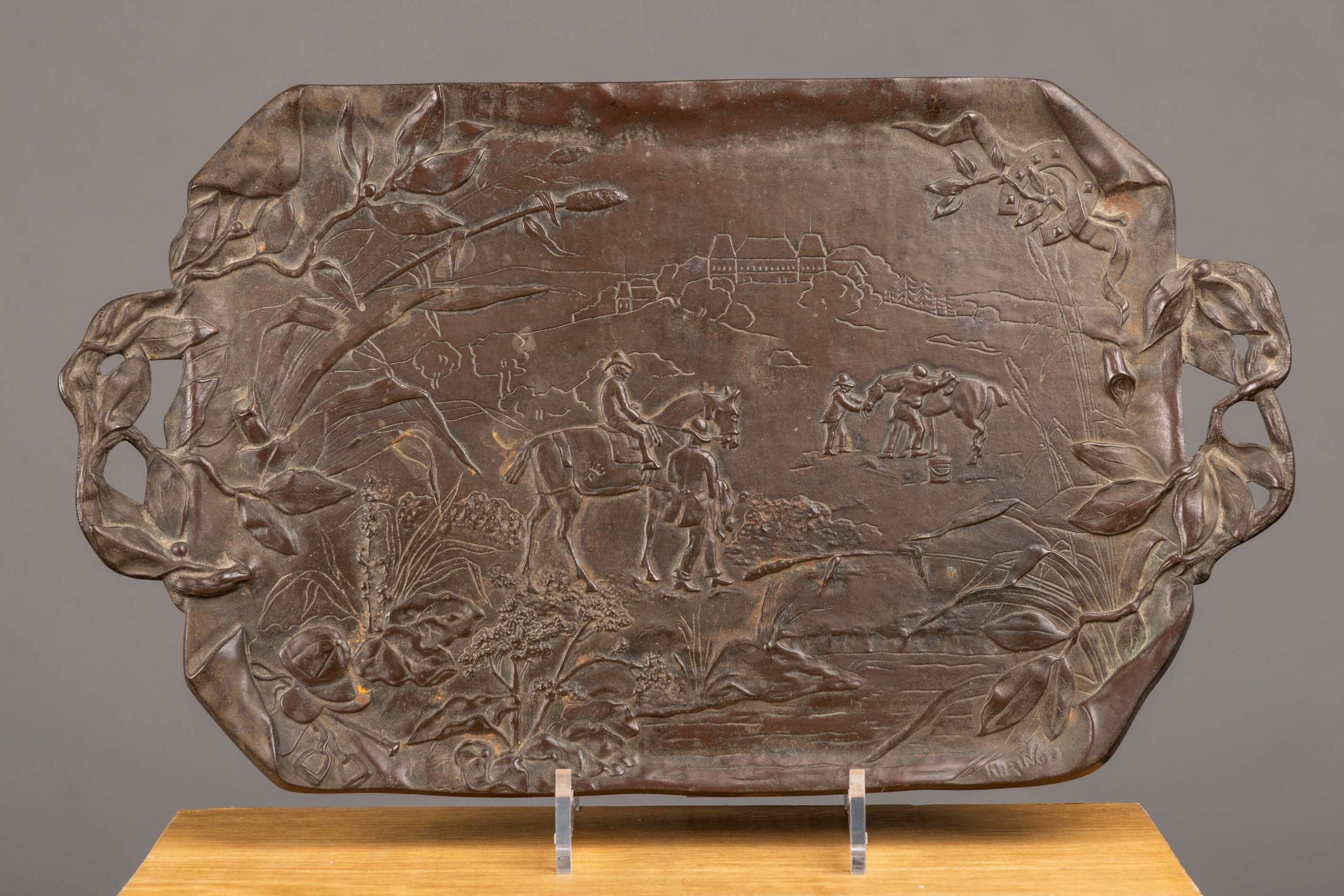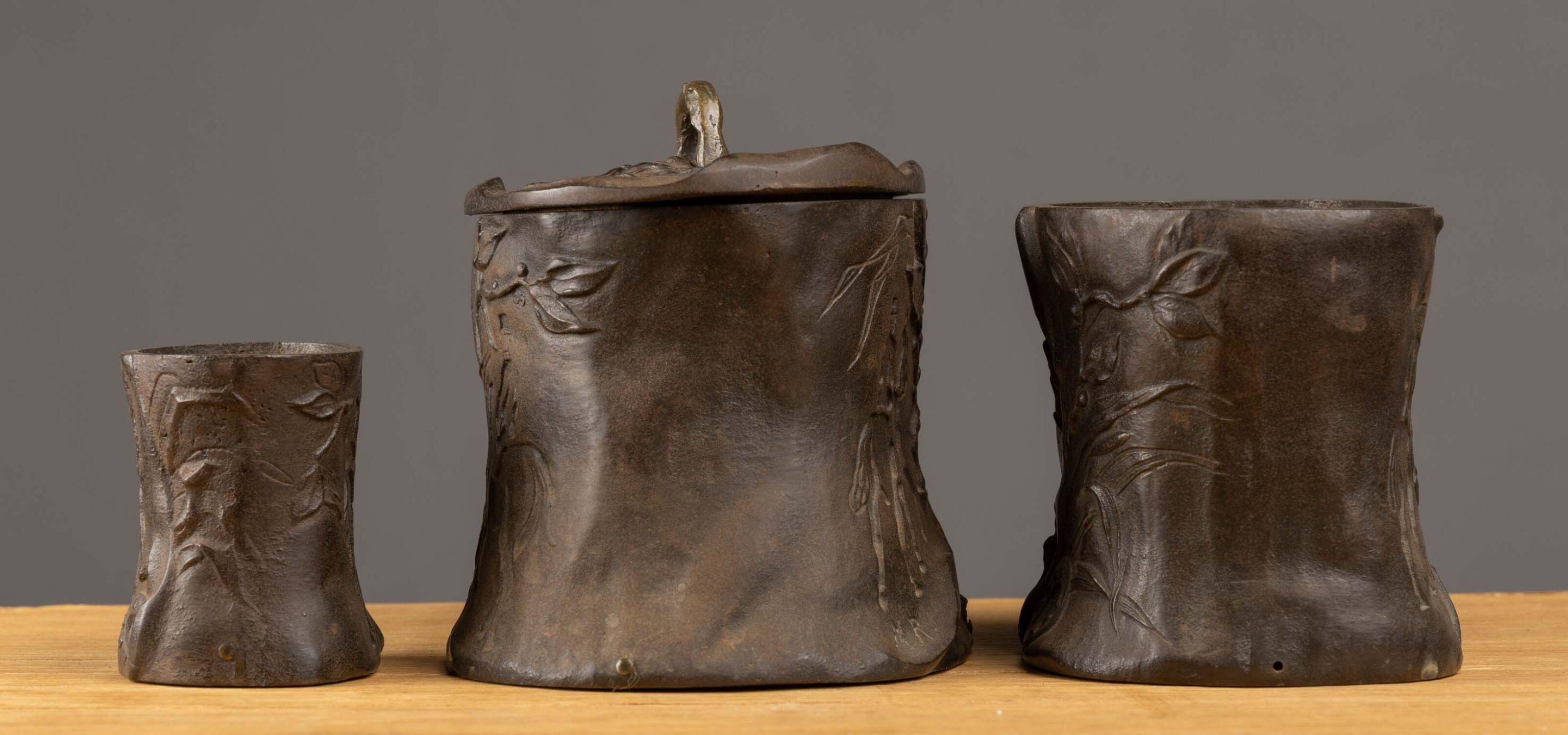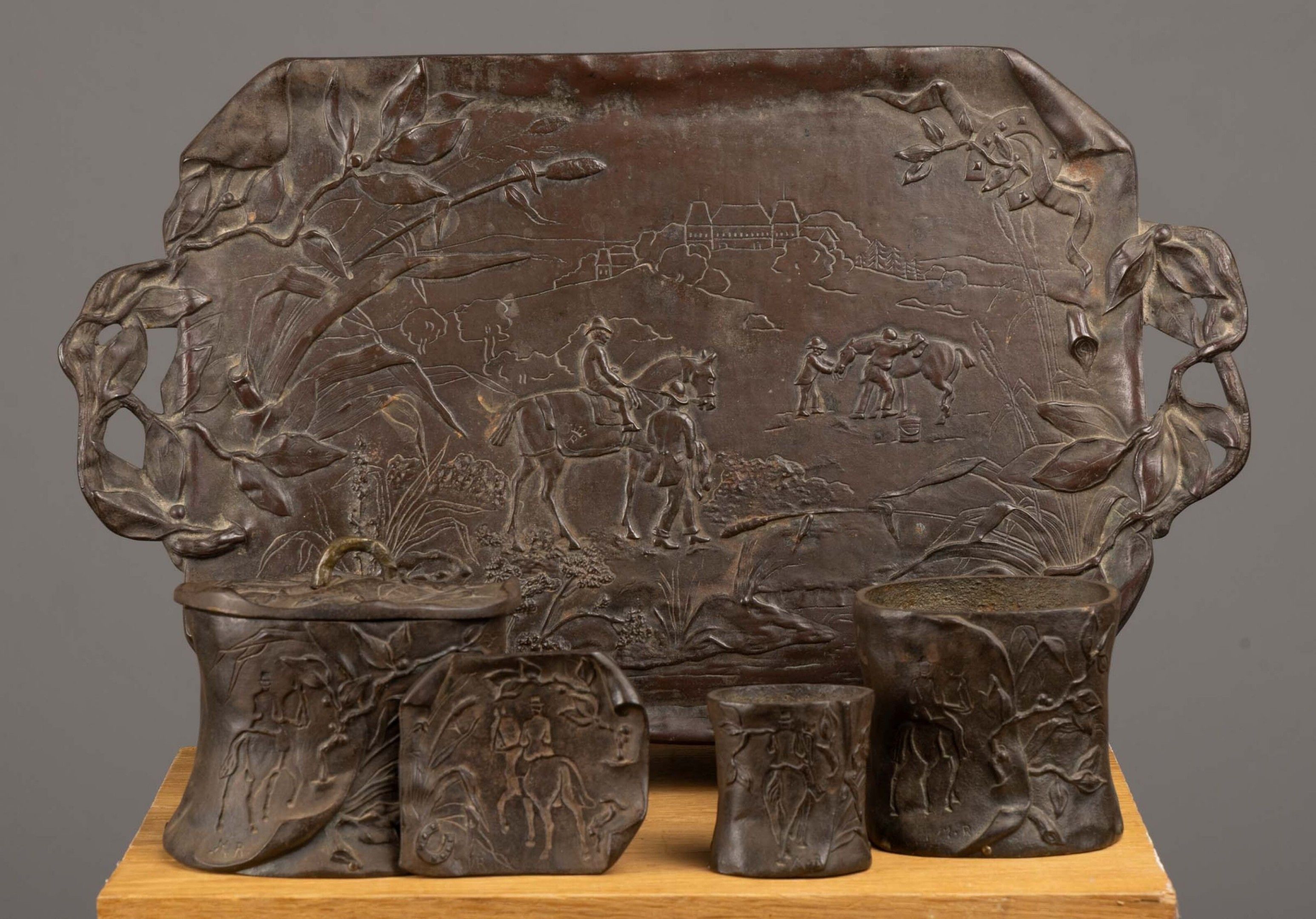 Nécessaire de fumeur en bronze à patine brune comprenant un plateau, un pot à tabac couvert, deux pots et un cendrier, à décor de cavaliers.