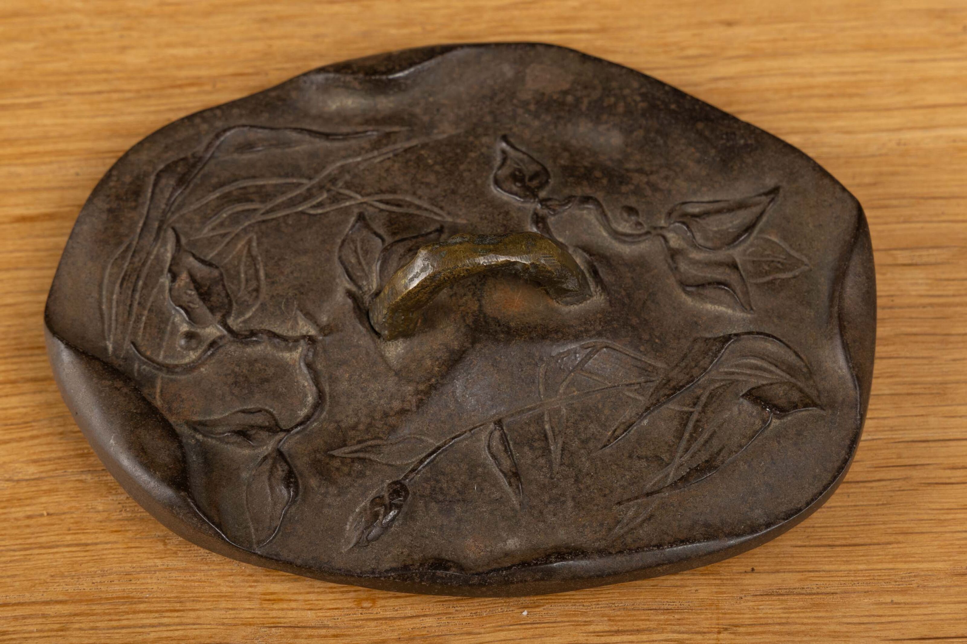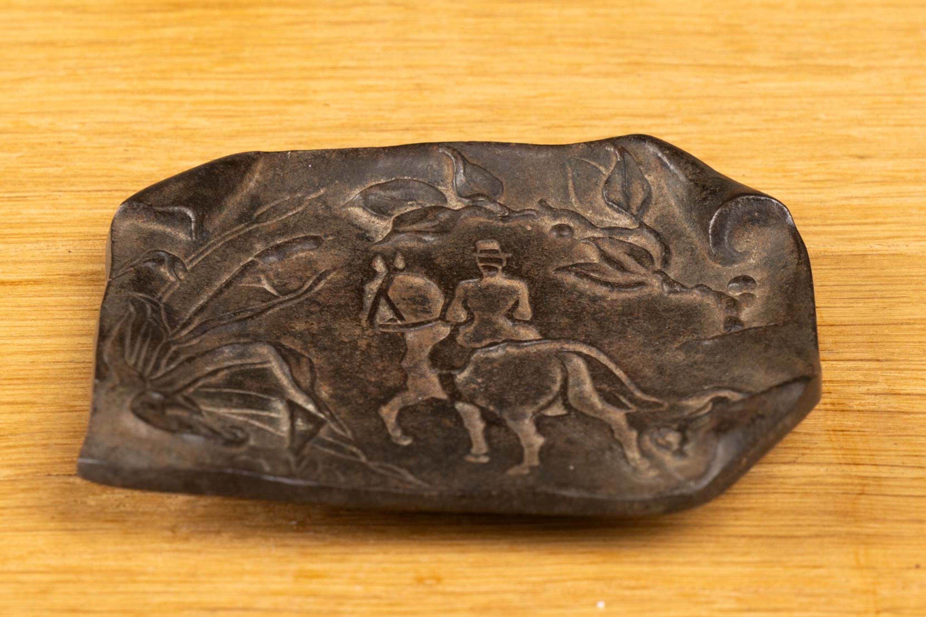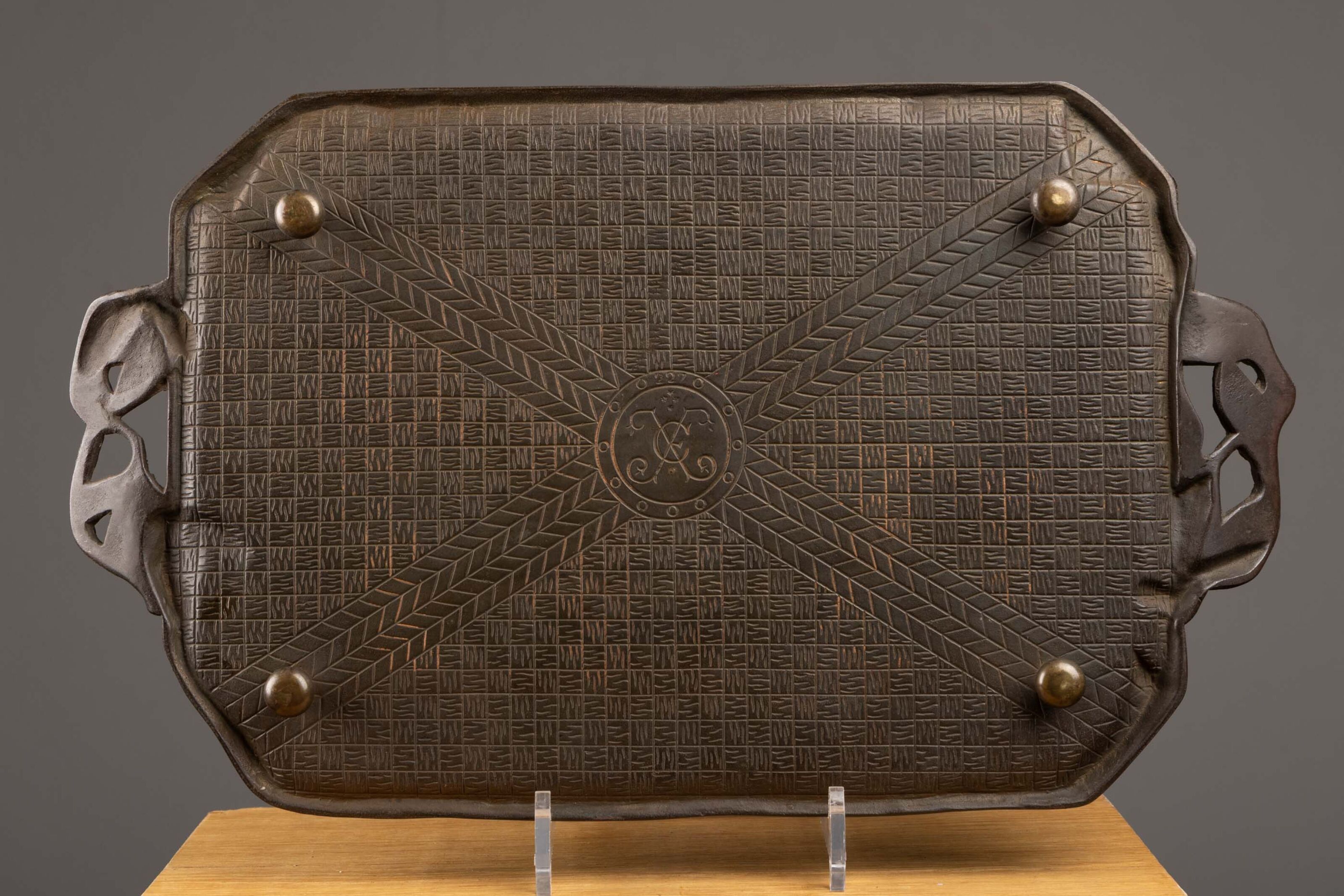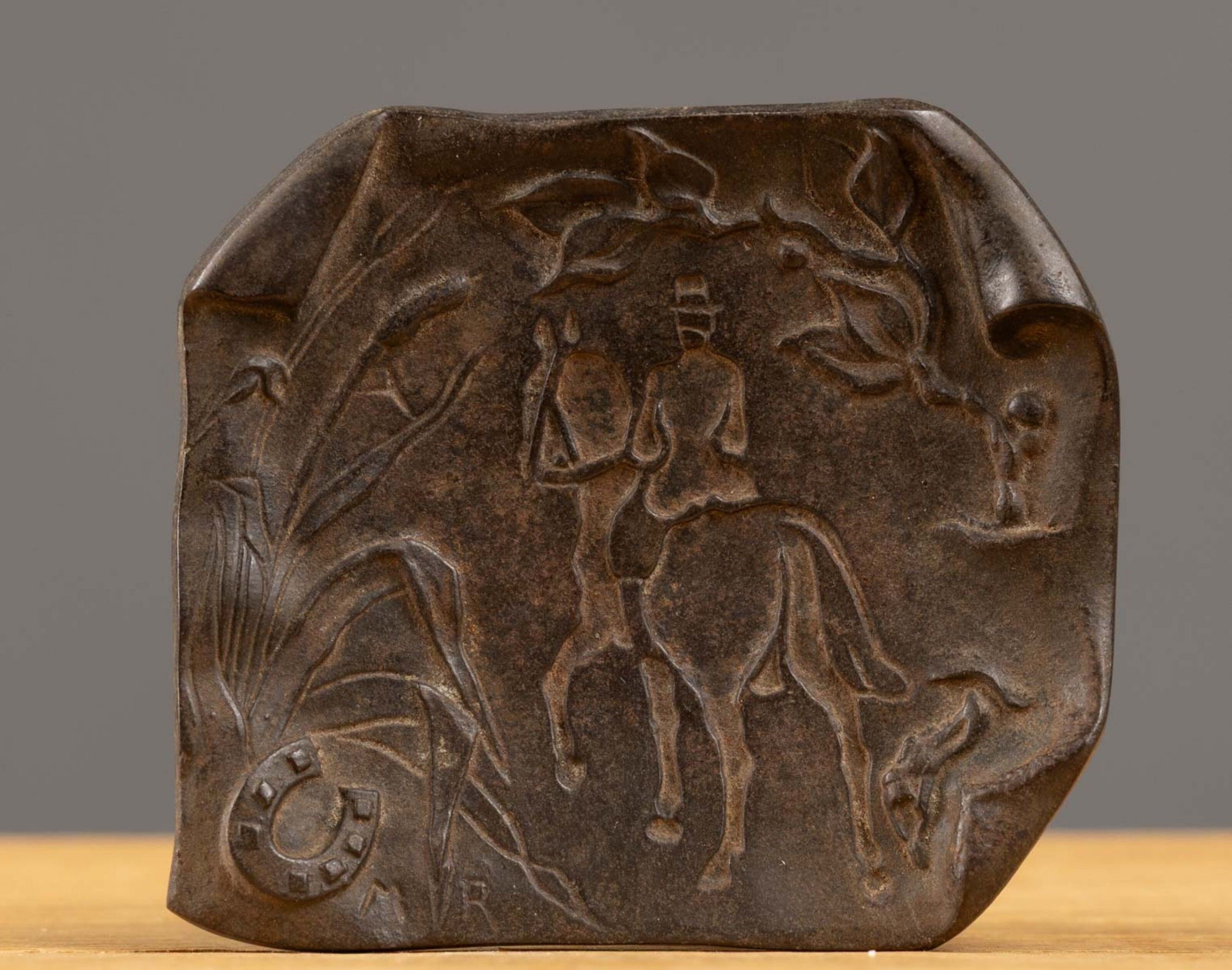 Nécessaire de fumeur en bronze à patine brune comprenant un plateau, un pot à tabac couvert, deux pots et un cendrier, à décor de cavaliers.
