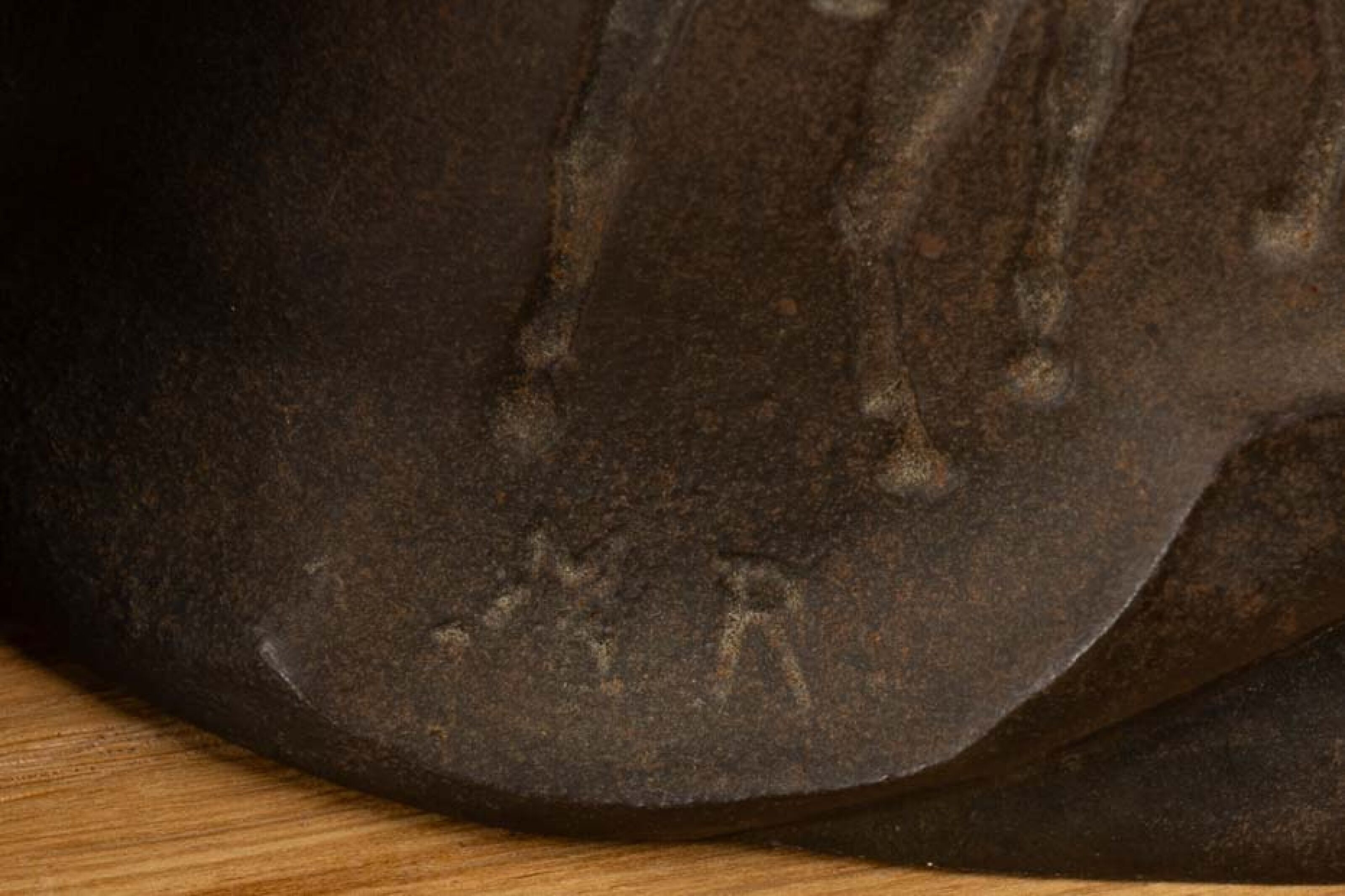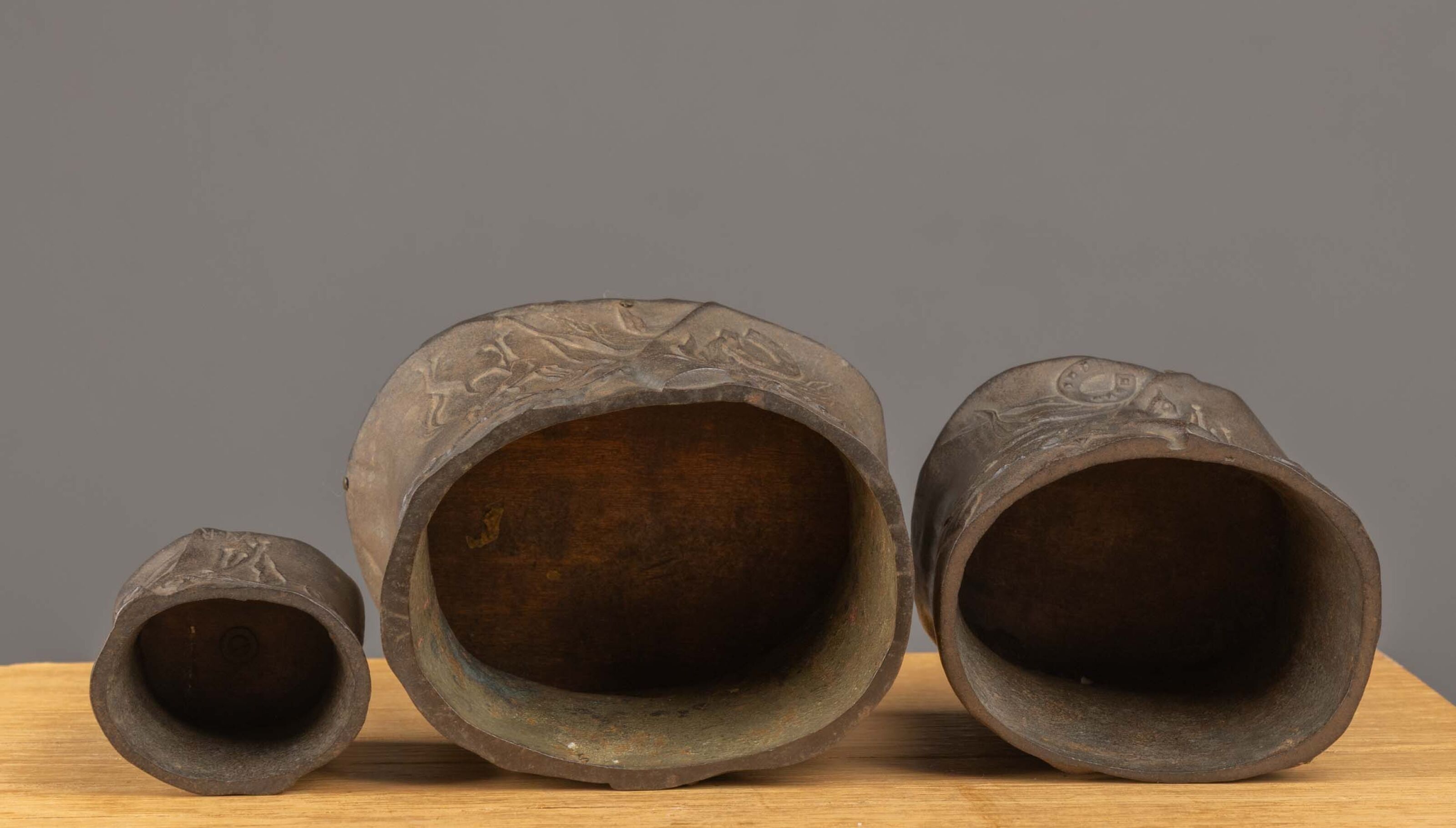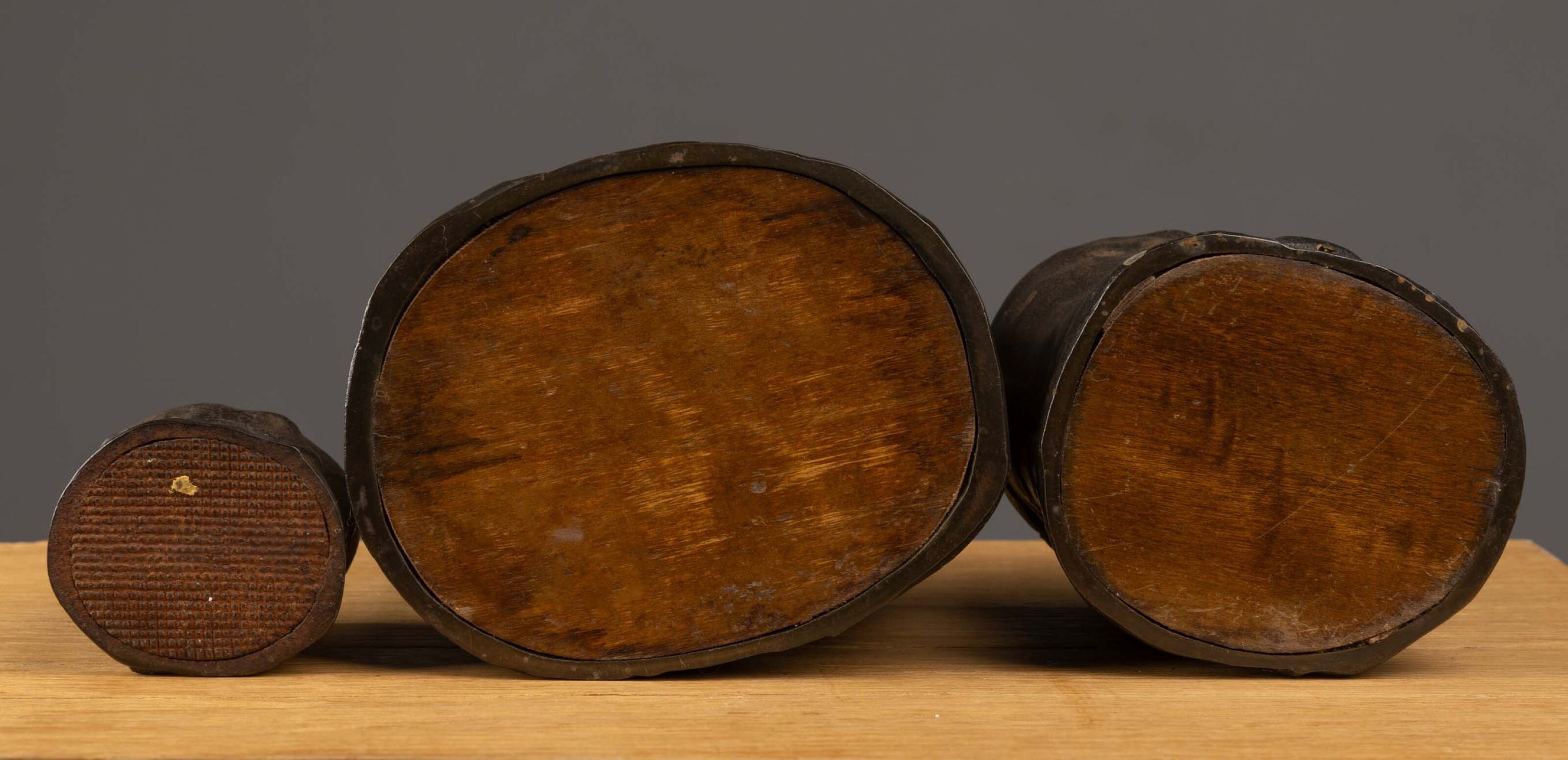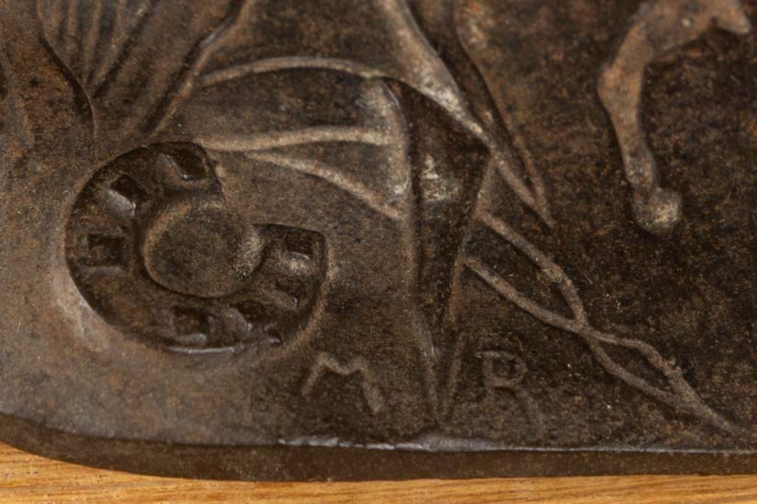 Nécessaire de fumeur en bronze à patine brune comprenant un plateau, un pot à tabac couvert, deux pots et un cendrier, à décor de cavaliers.