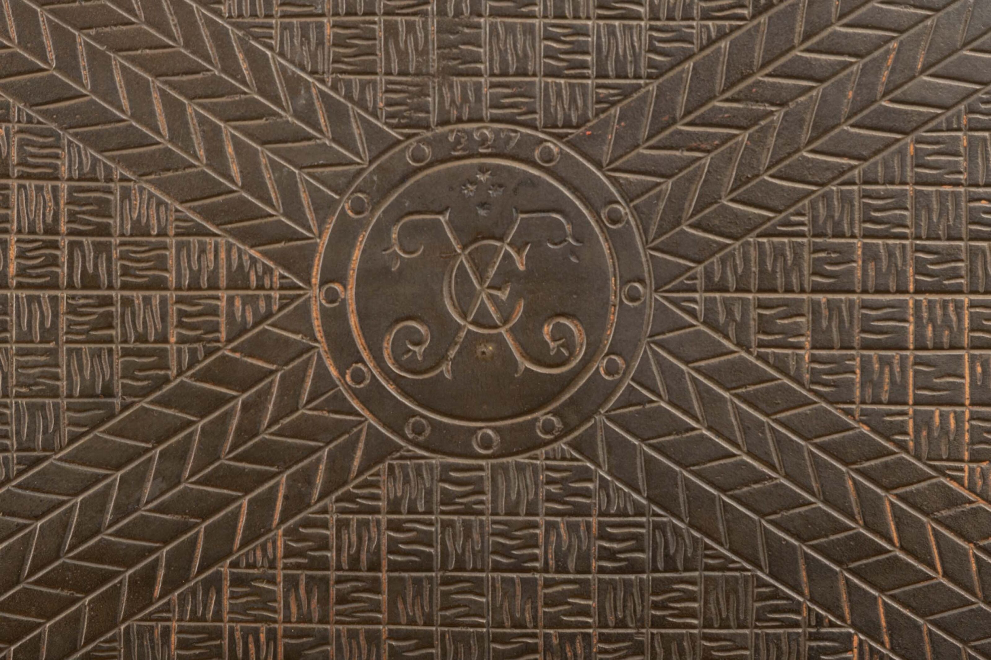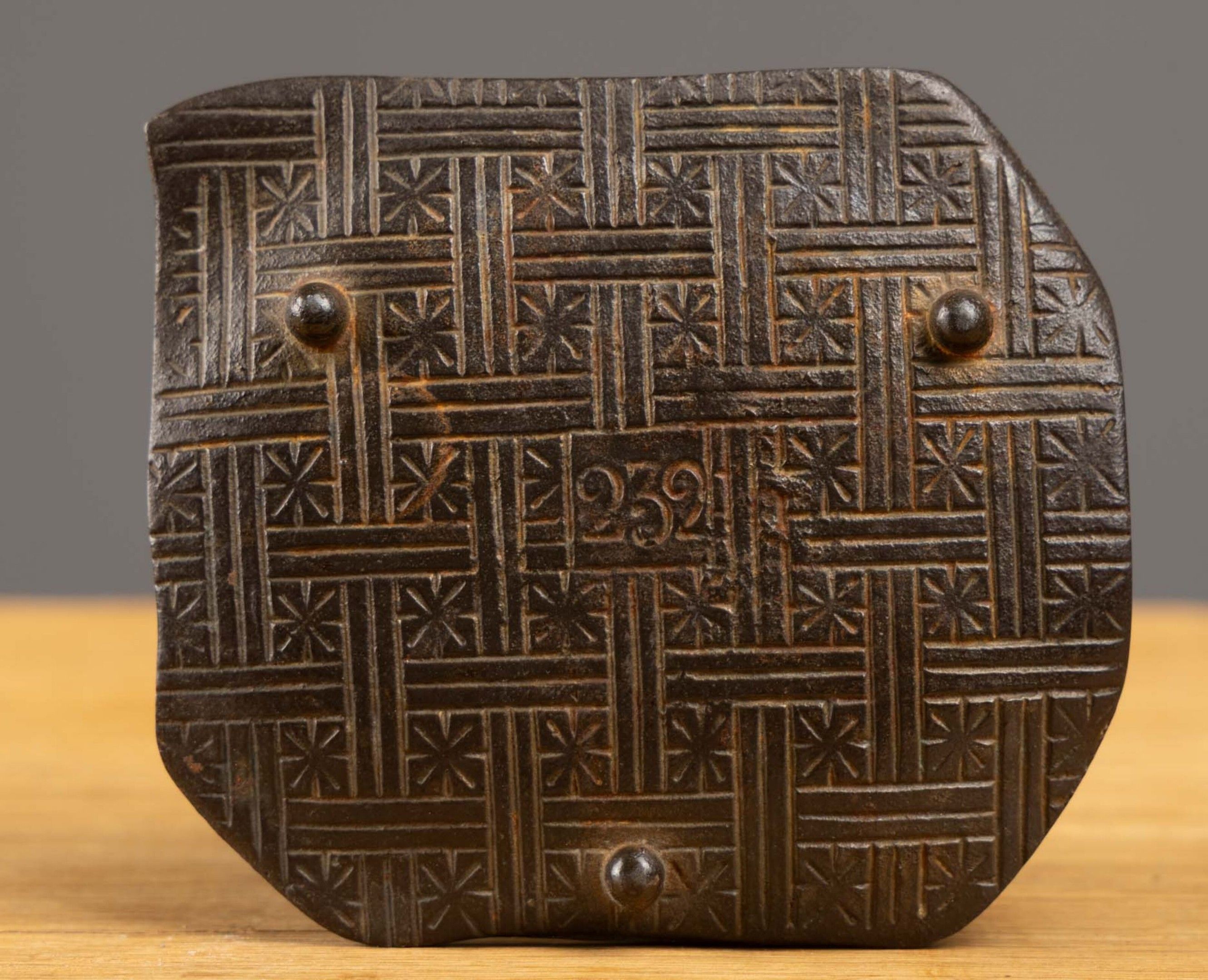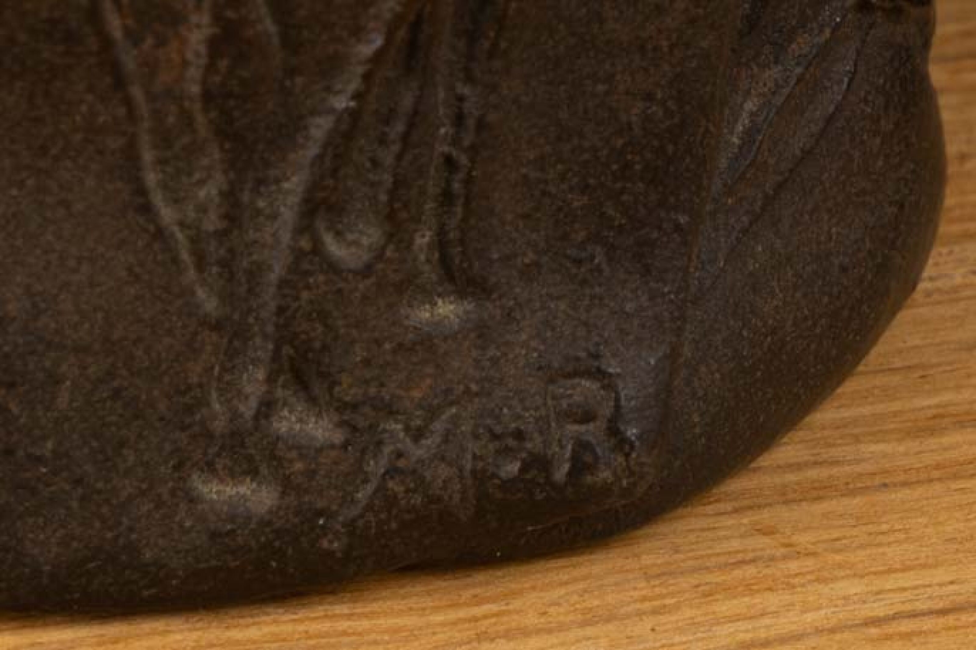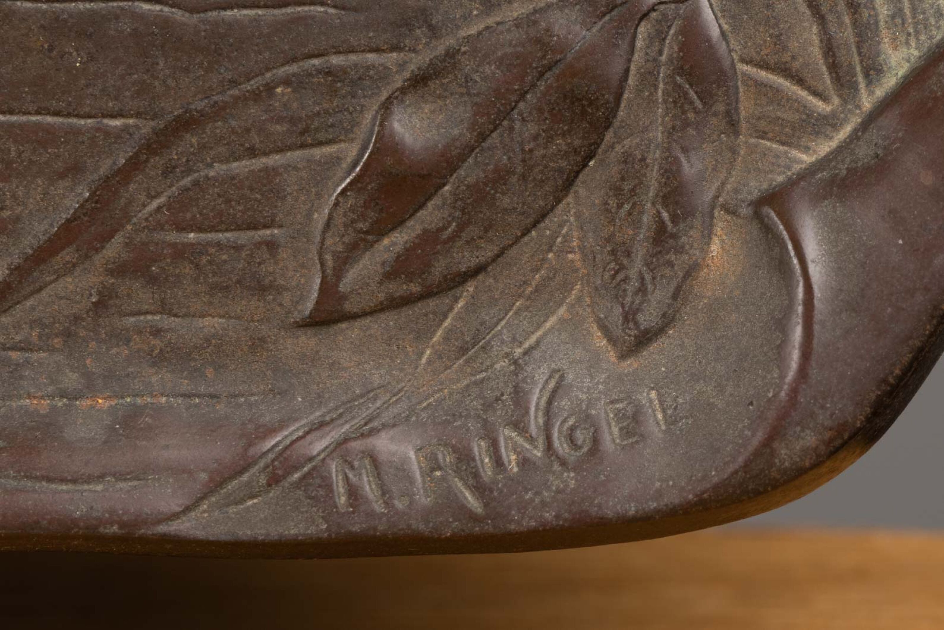 Nécessaire de fumeur en bronze à patine brune comprenant un plateau, un pot à tabac couvert, deux pots et un cendrier, à décor de cavaliers.