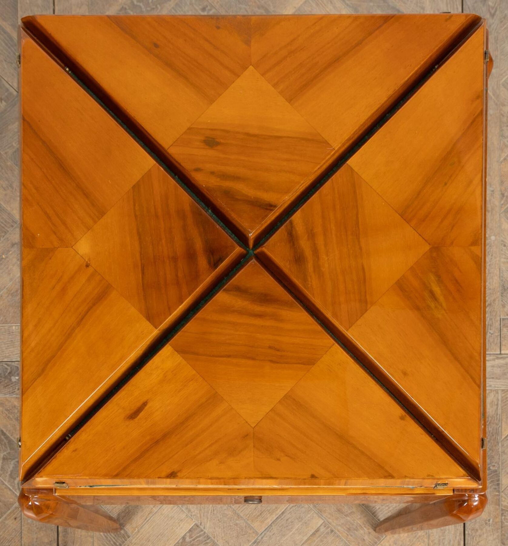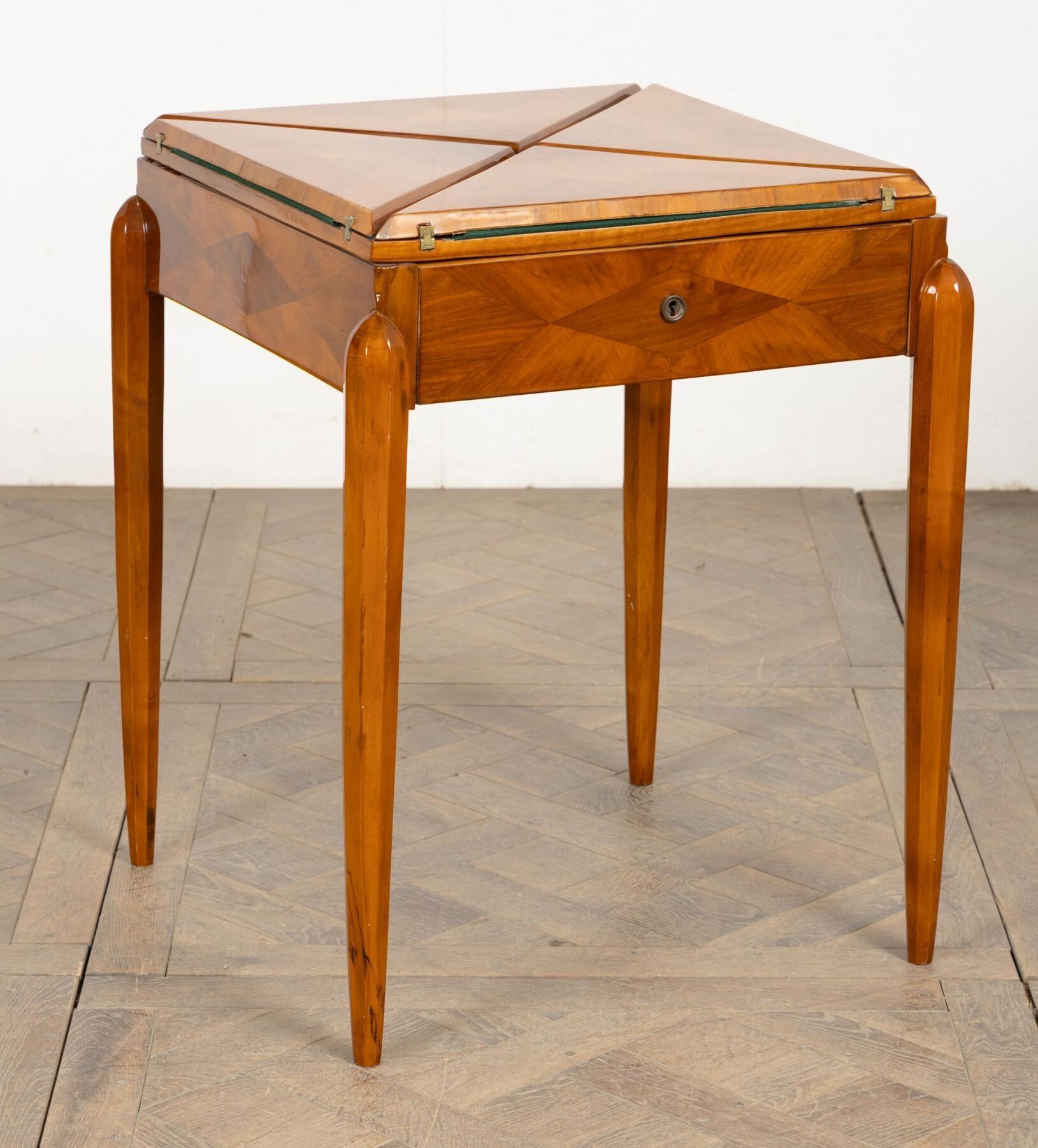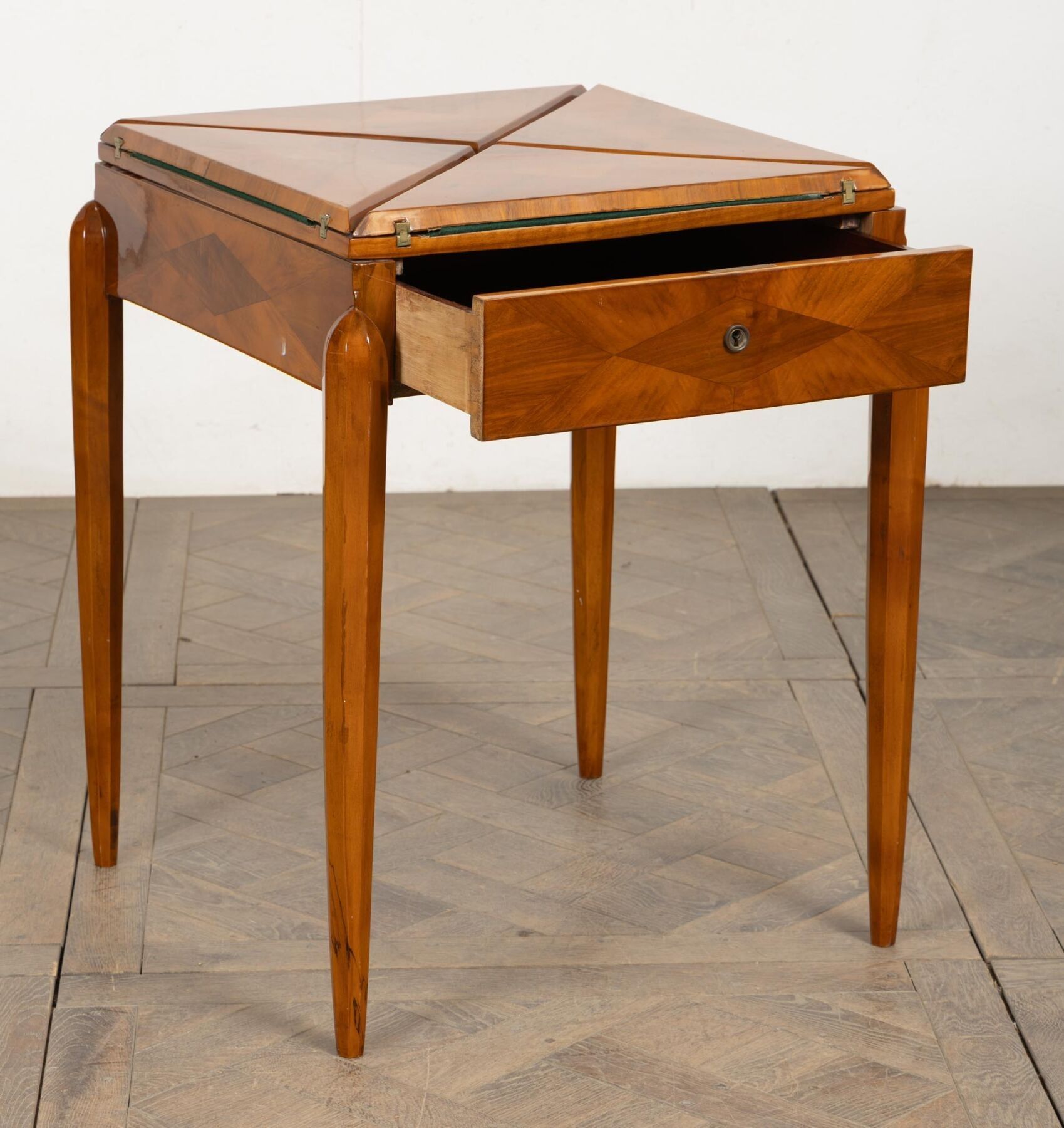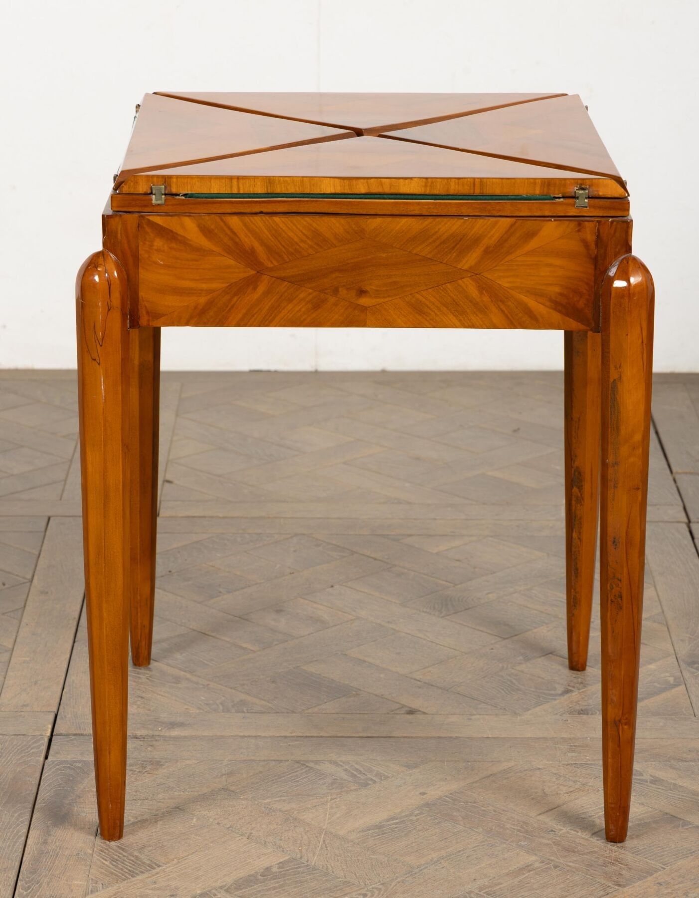 Table mouchoir en bois de placage, ouvrant à quatre plateaux de forme triangulaire.