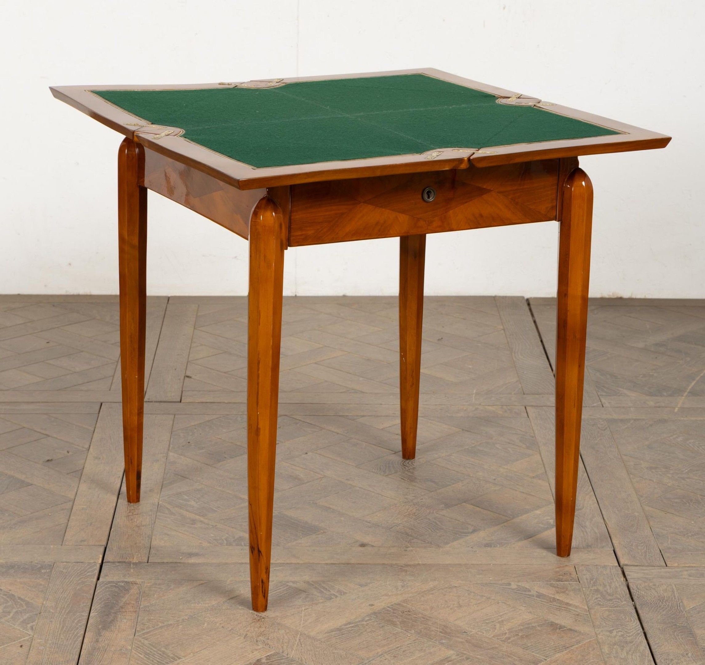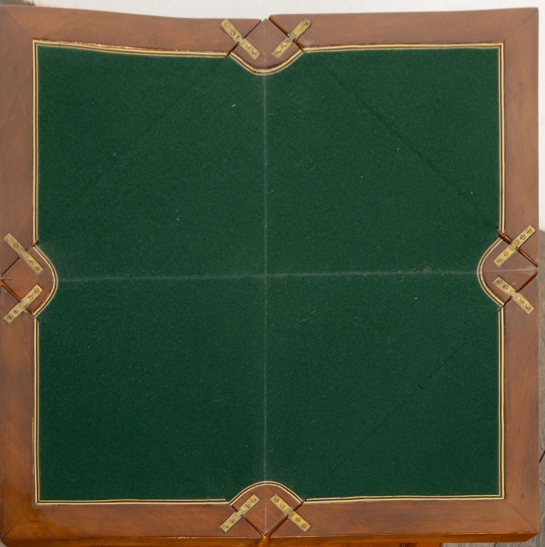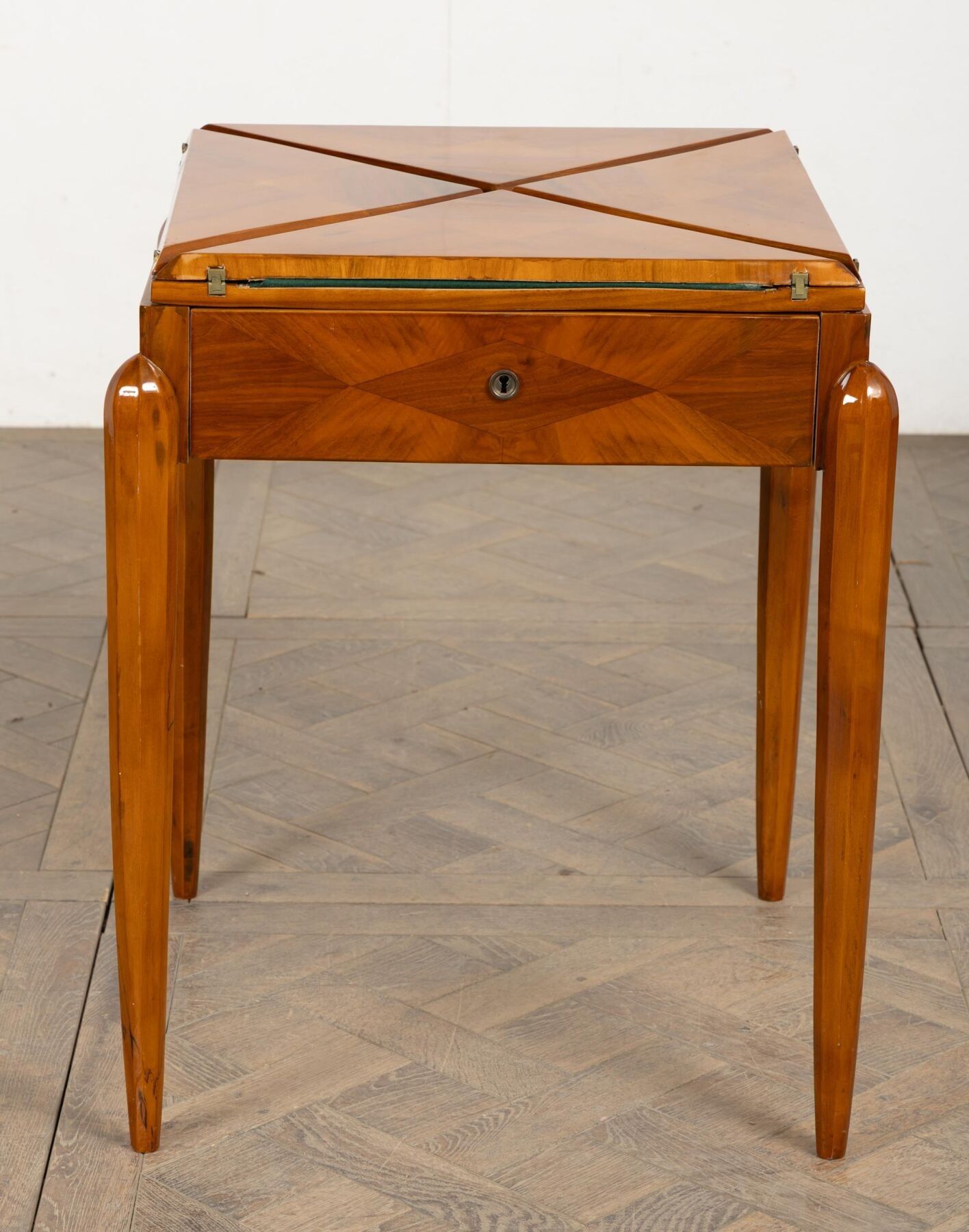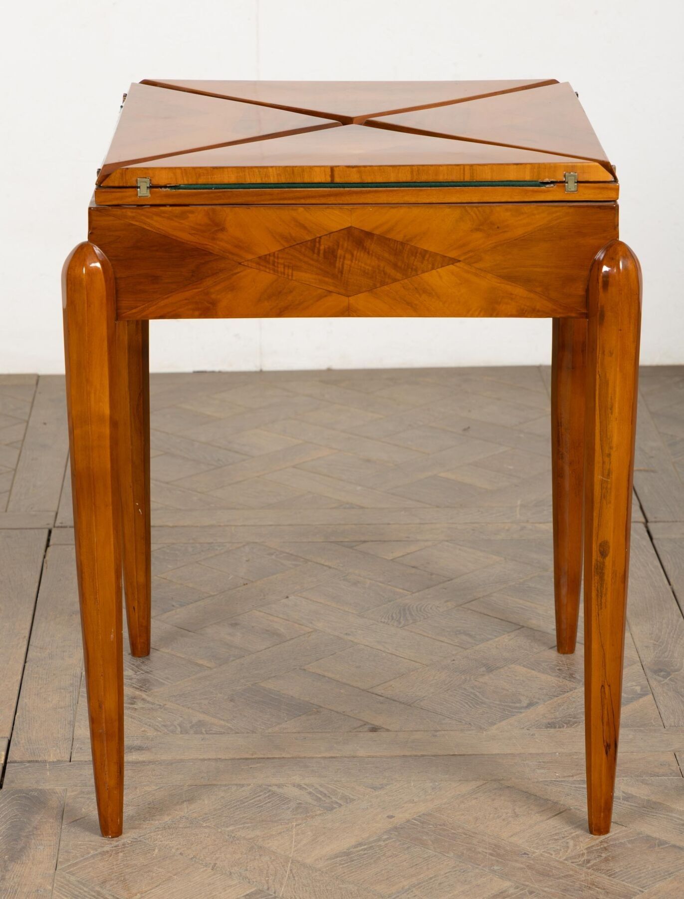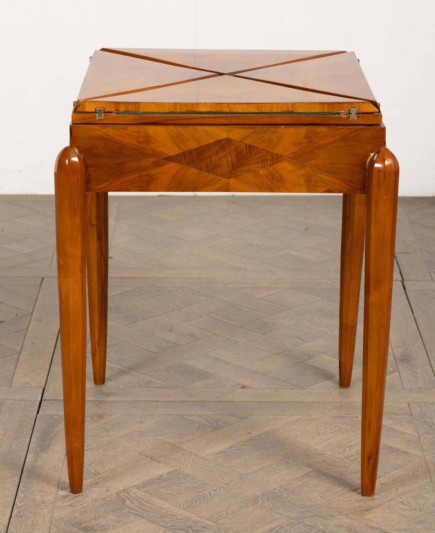 Table mouchoir en bois de placage, ouvrant à quatre plateaux de forme triangulaire.