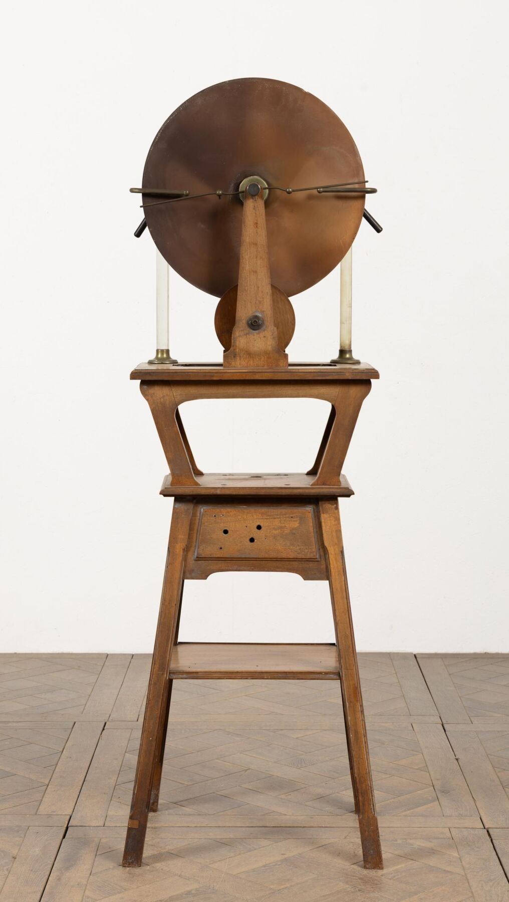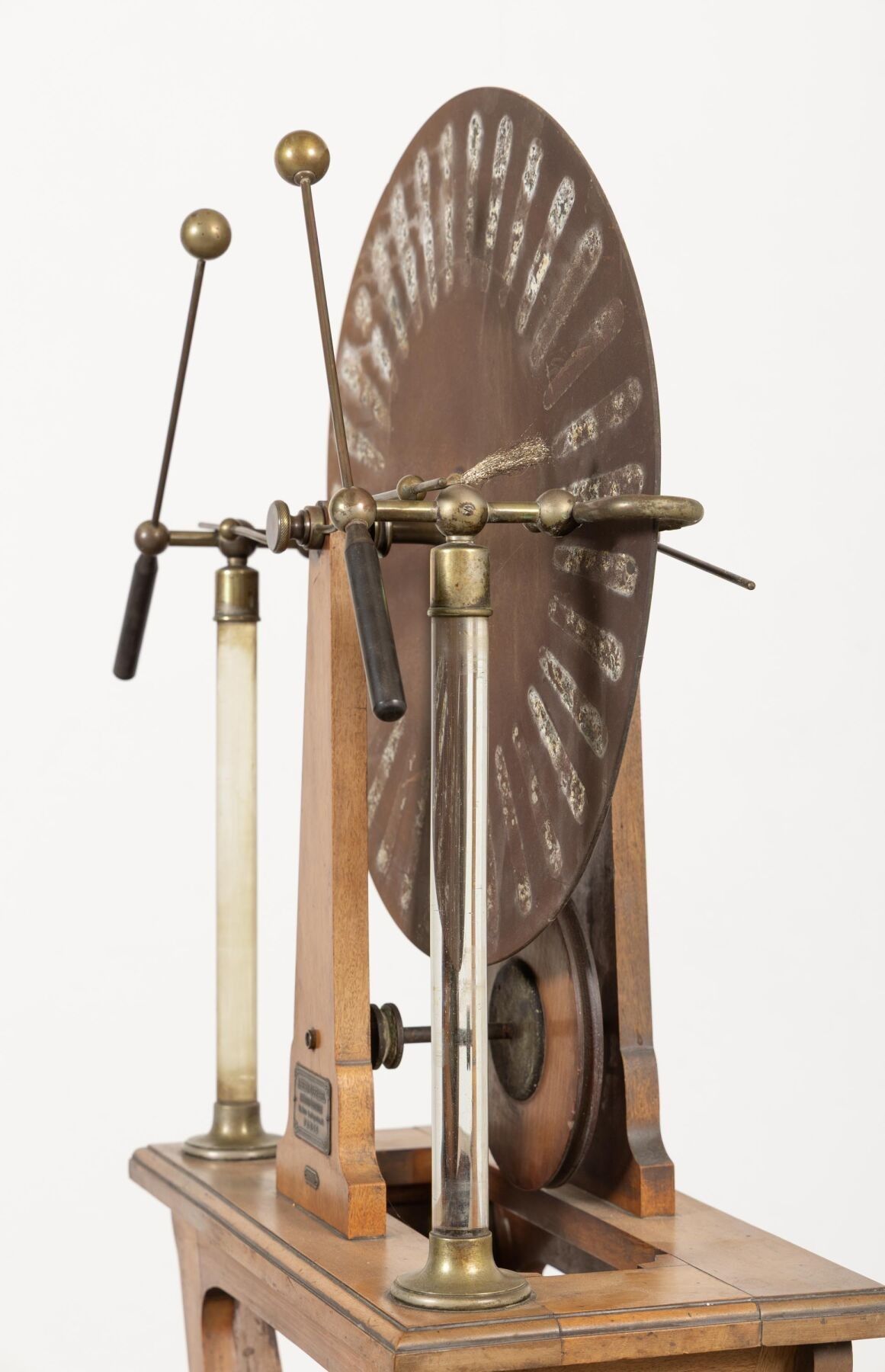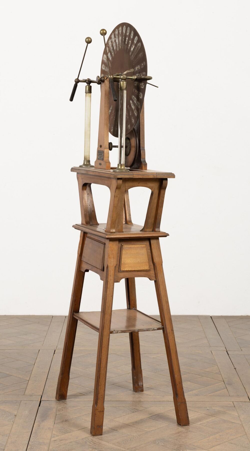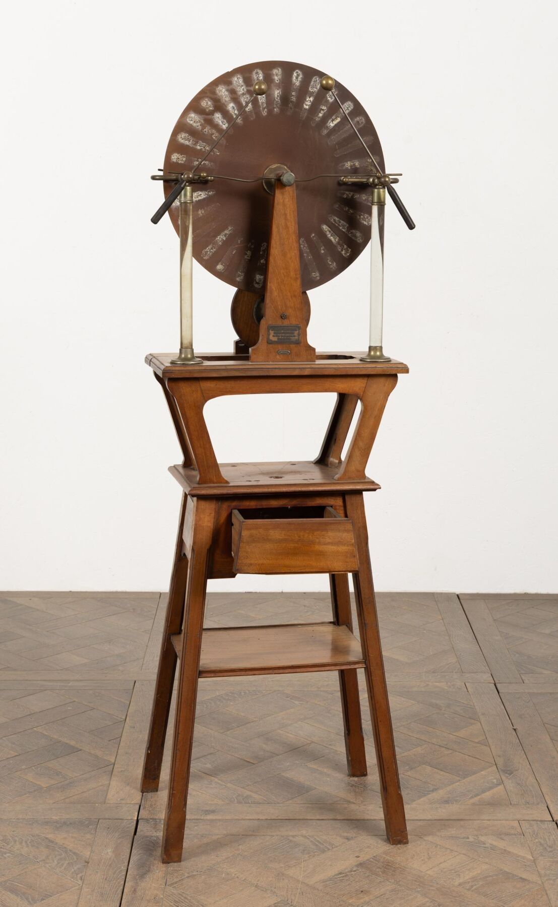 A. BERIO-CAFFAREL à Paris. Machine de WIMSHURST en bois et cuivre. H_159 cm L_52 cm P_40 cm, fond manquant au tiroir.