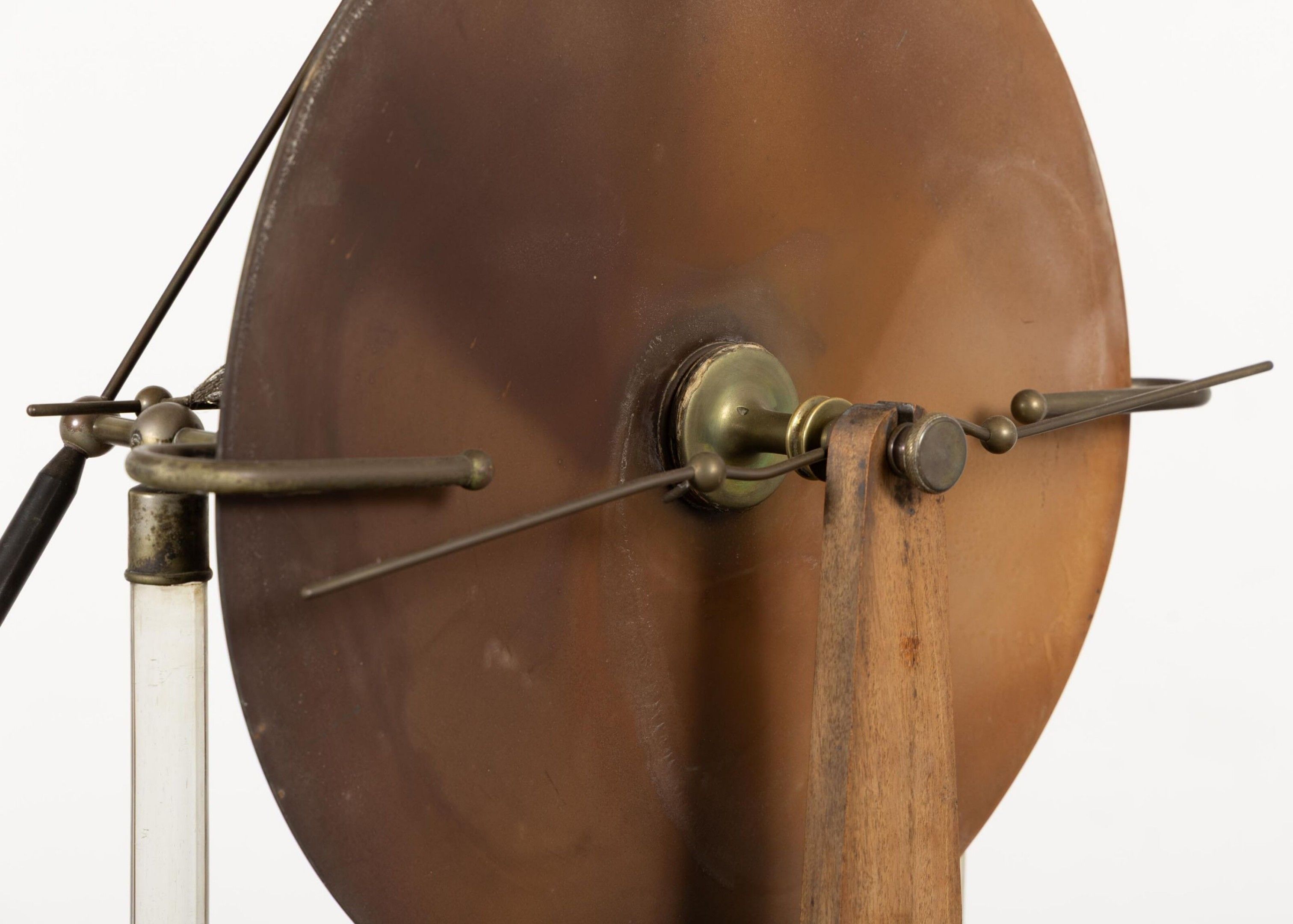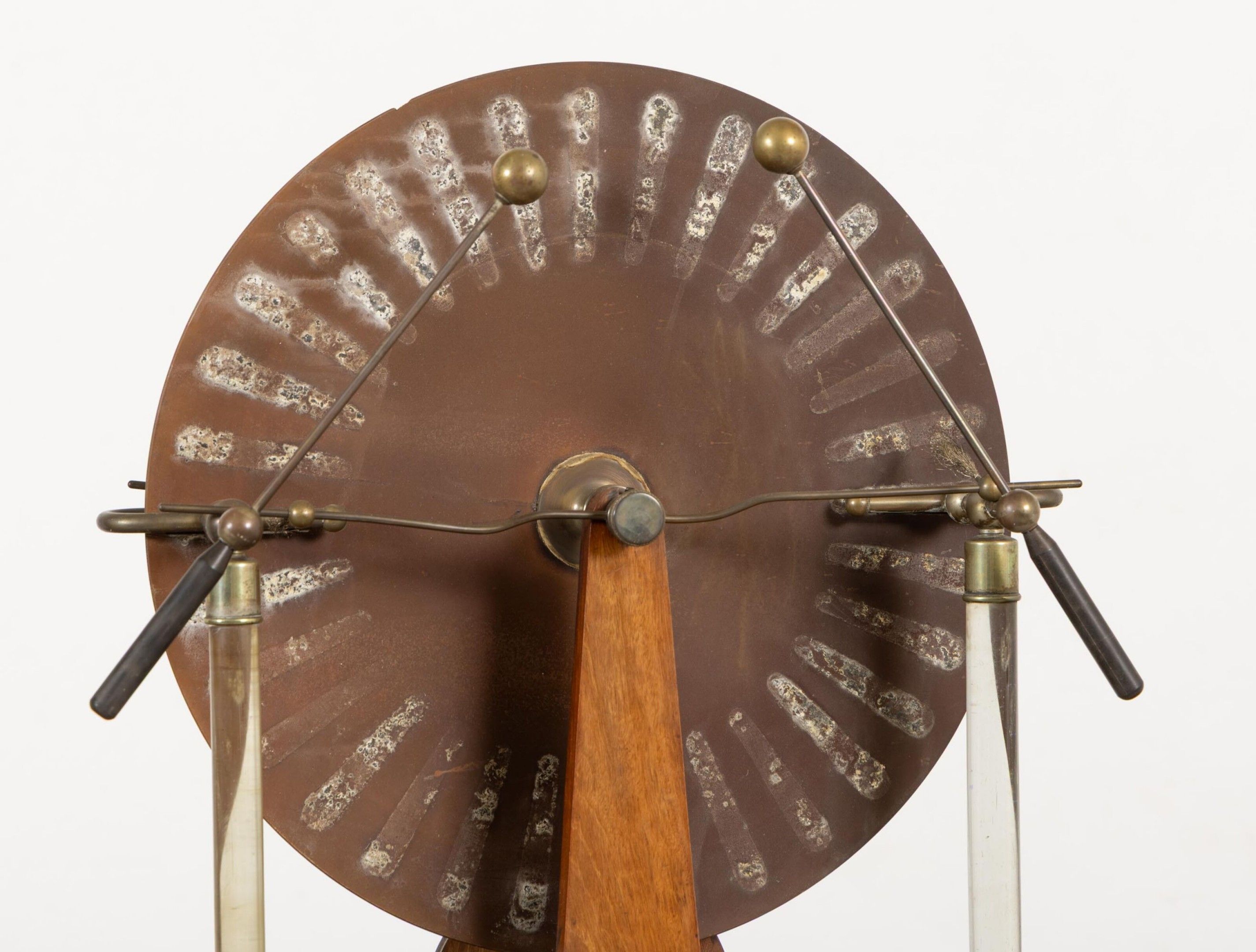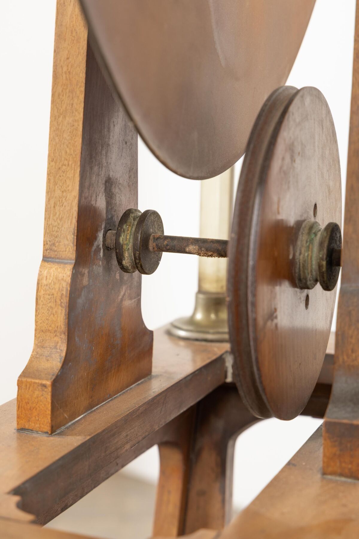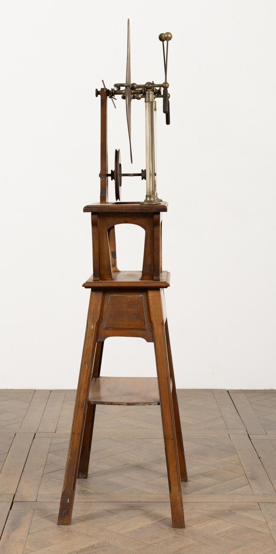 A. BERIO-CAFFAREL à Paris. Machine de WIMSHURST en bois et cuivre. H_159 cm L_52 cm P_40 cm, fond manquant au tiroir.
