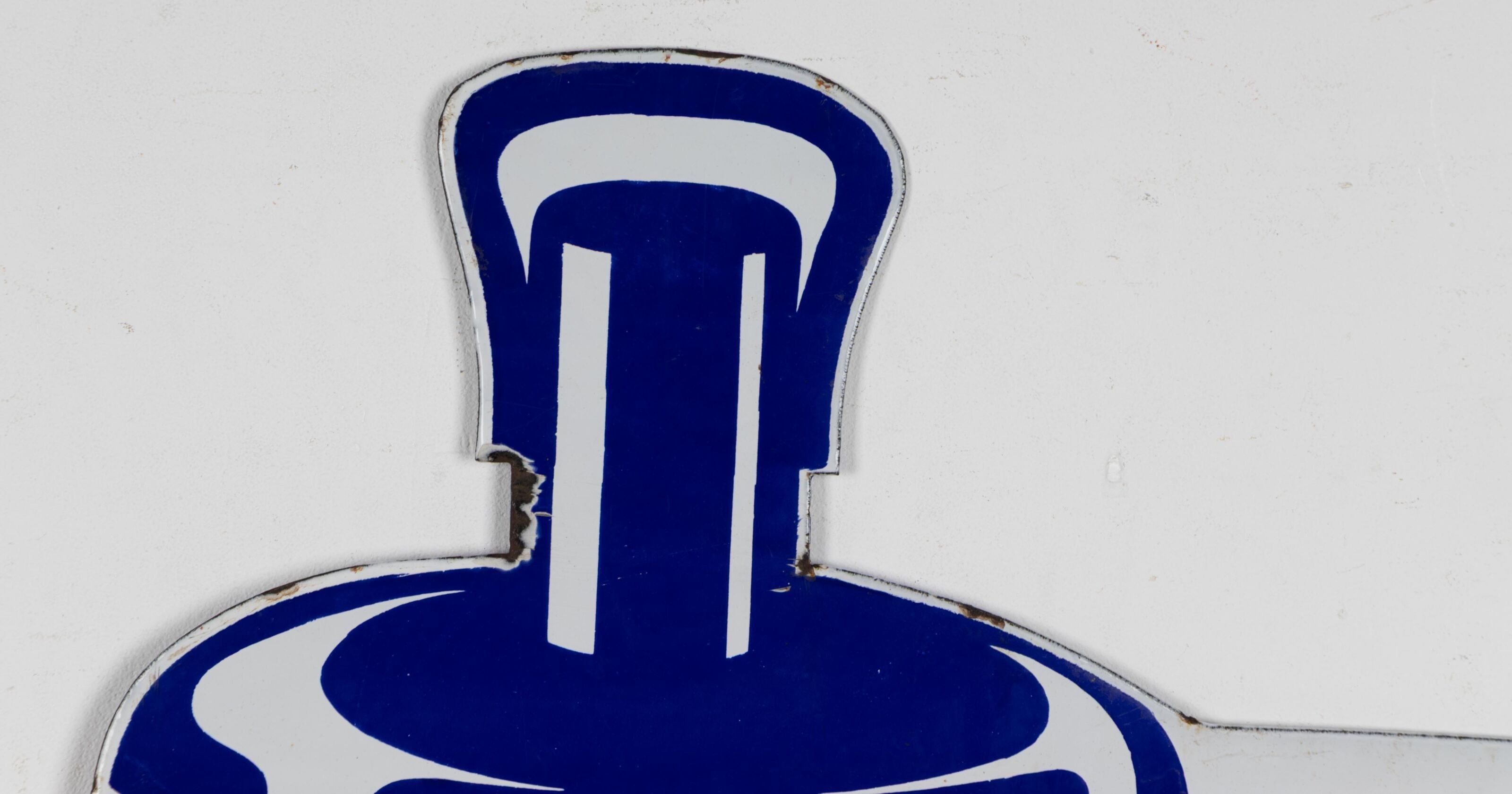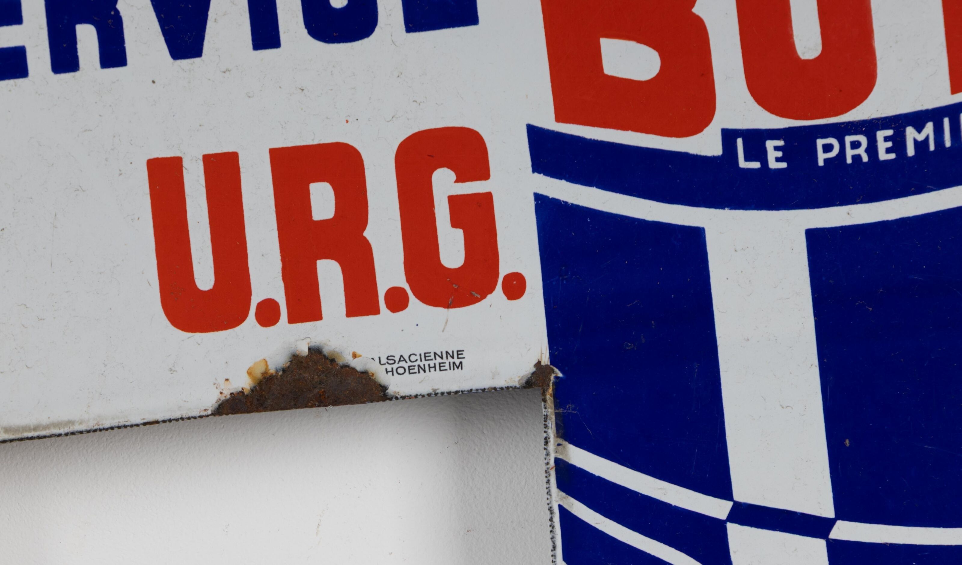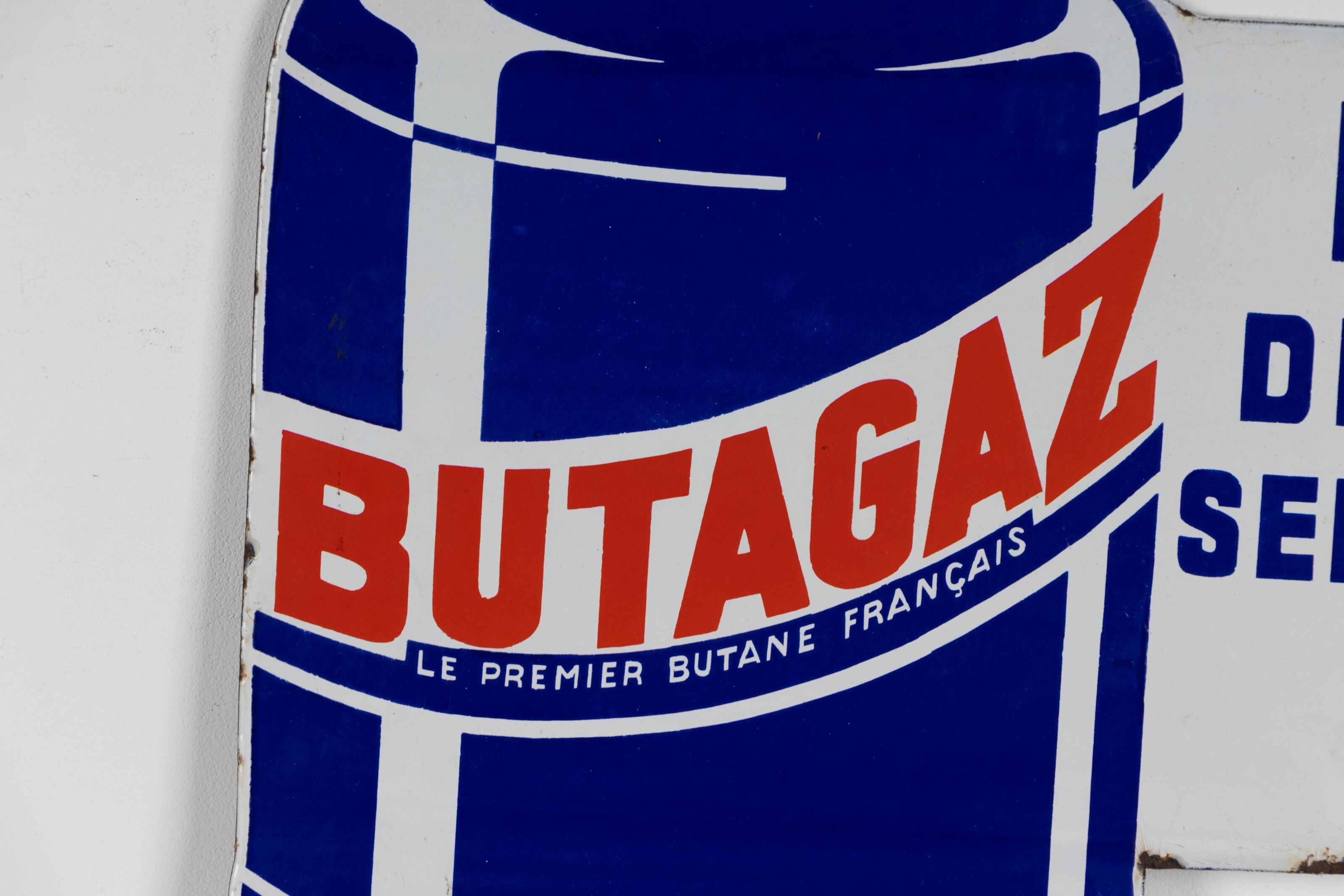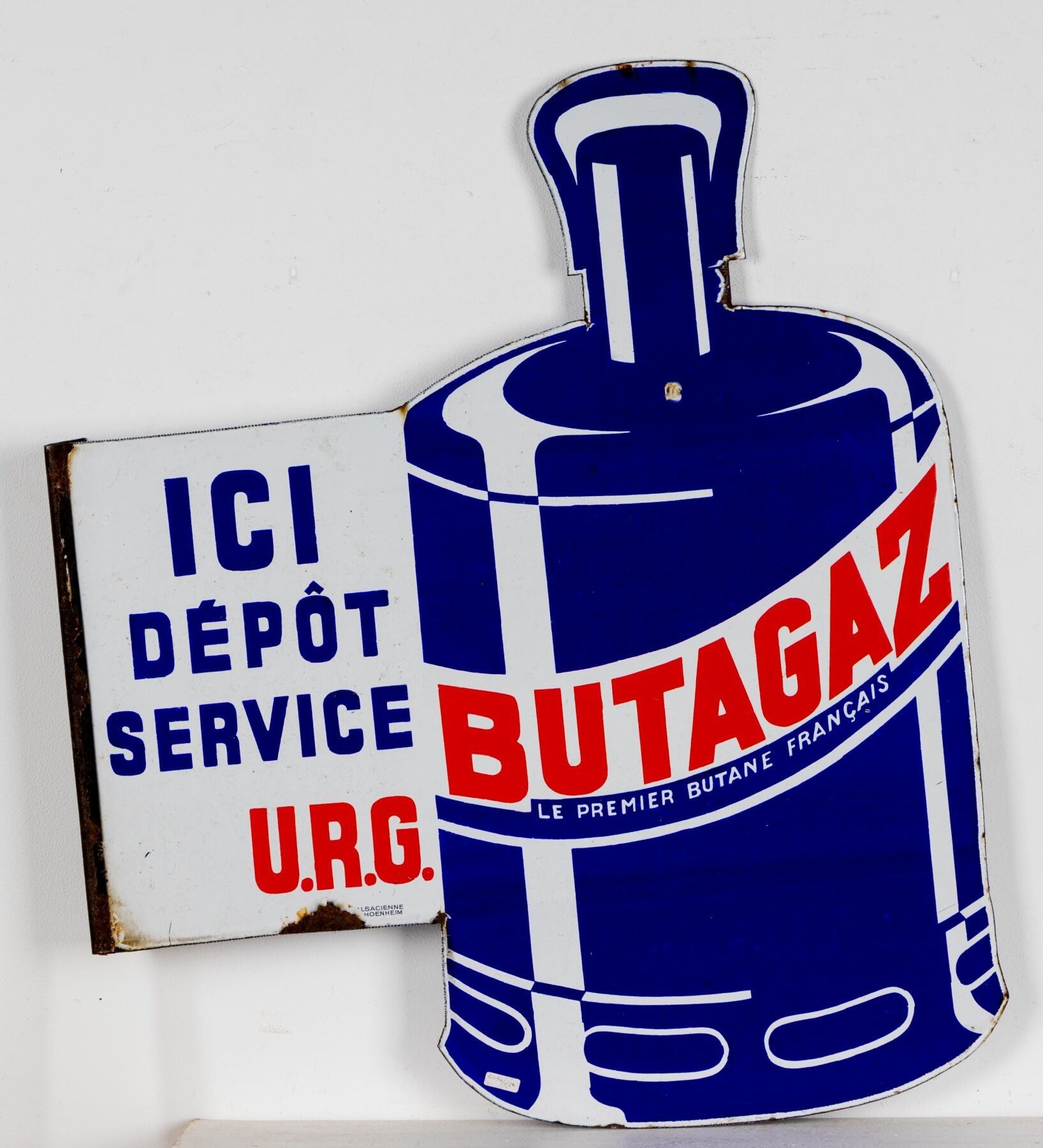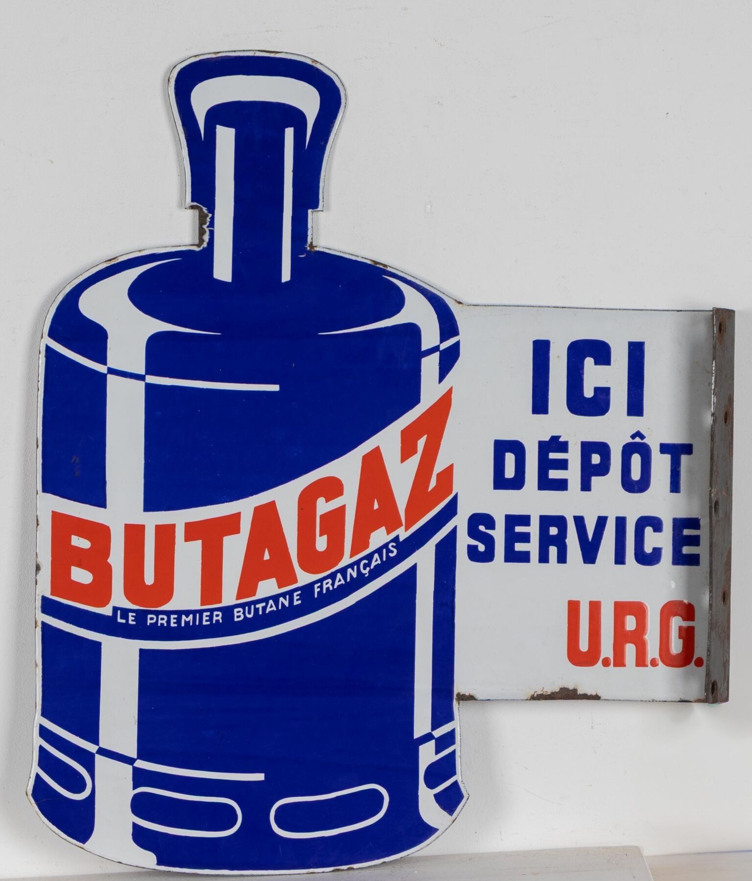 BUTAGAZ. Plaque double face en tôle émaillée avec potence.