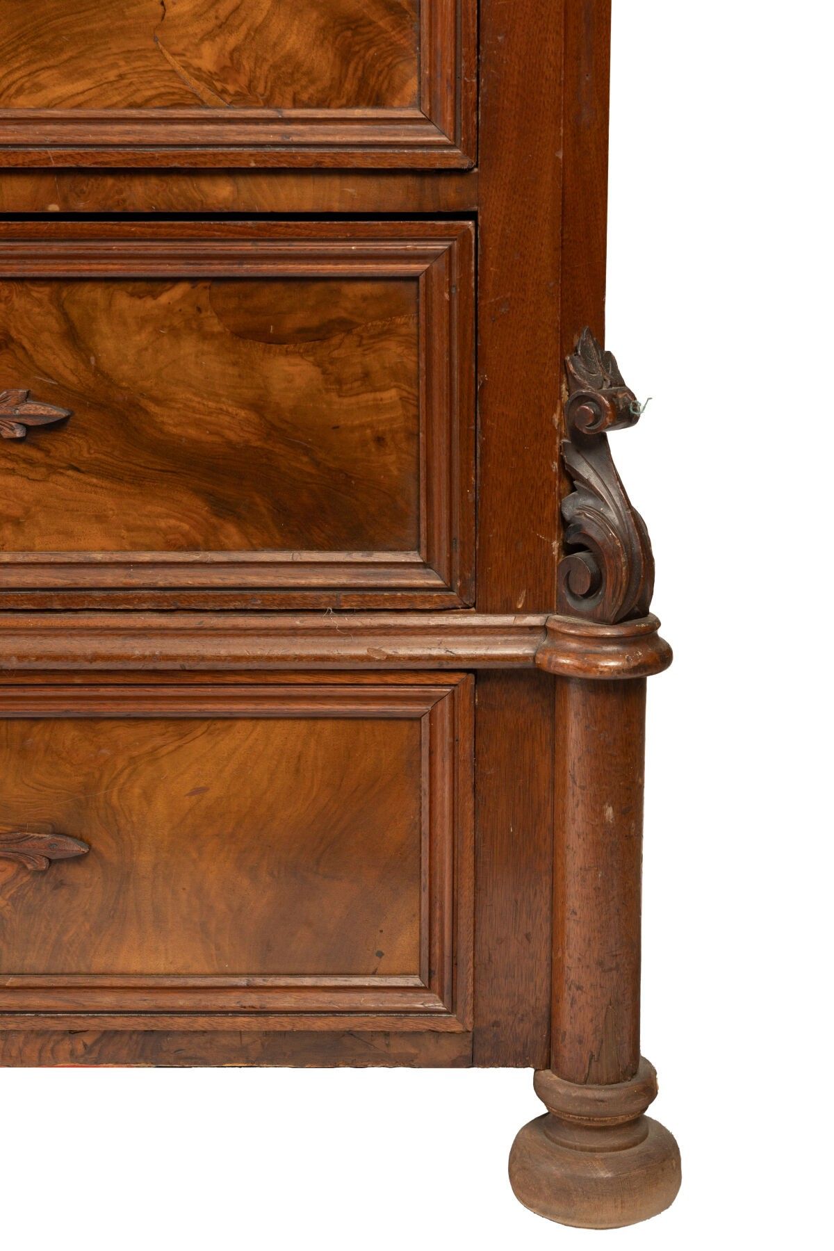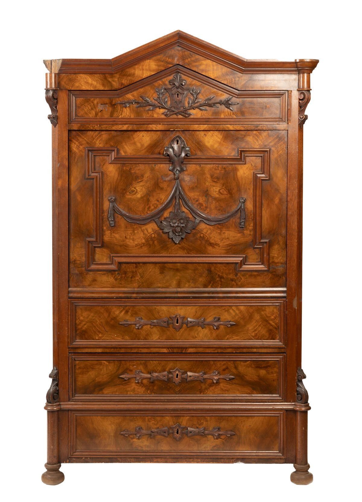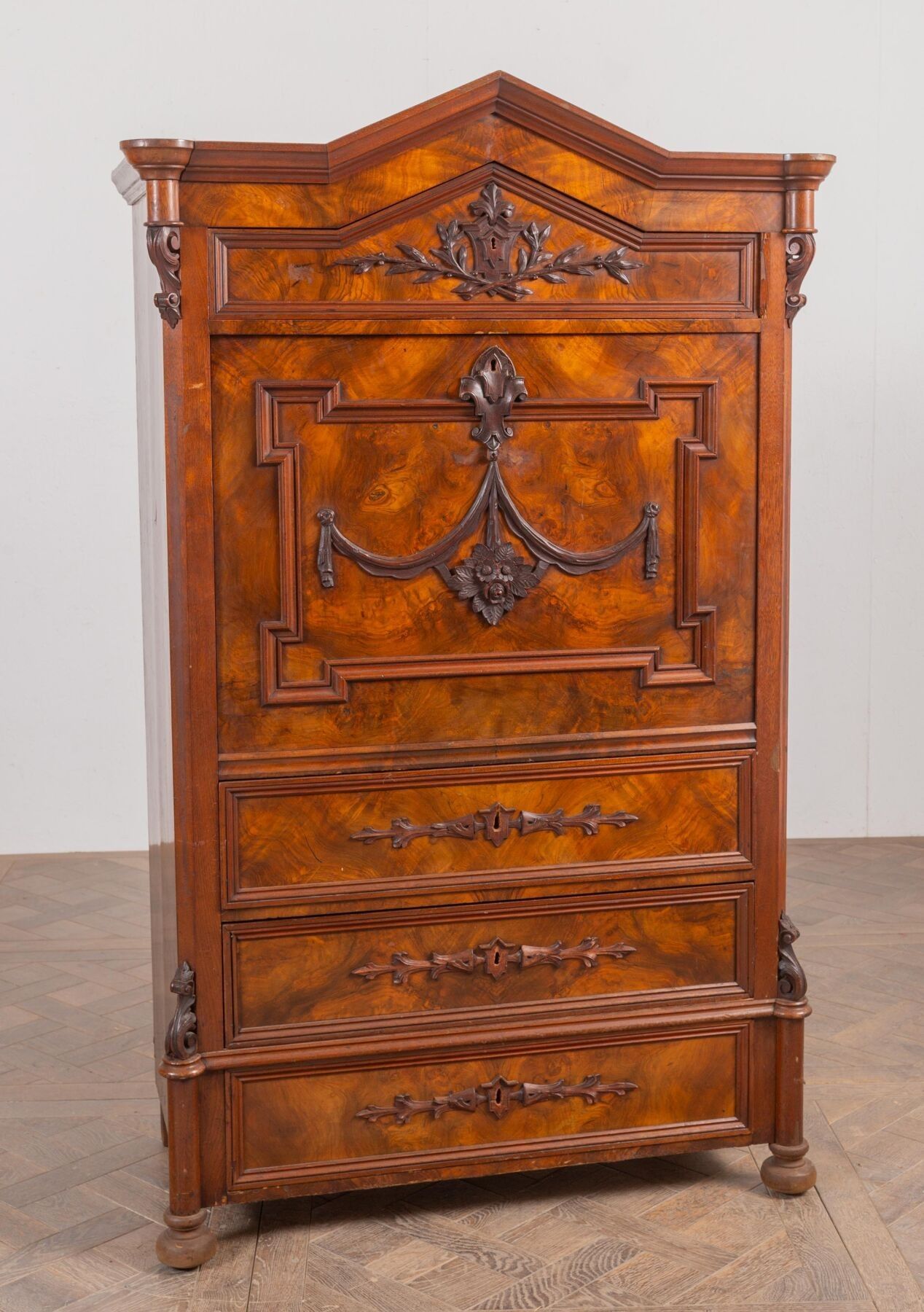Secrétaire en bois de placage ouvrant à un abattant, trois tiroirs et un vantail à décor de frises et feuillages.