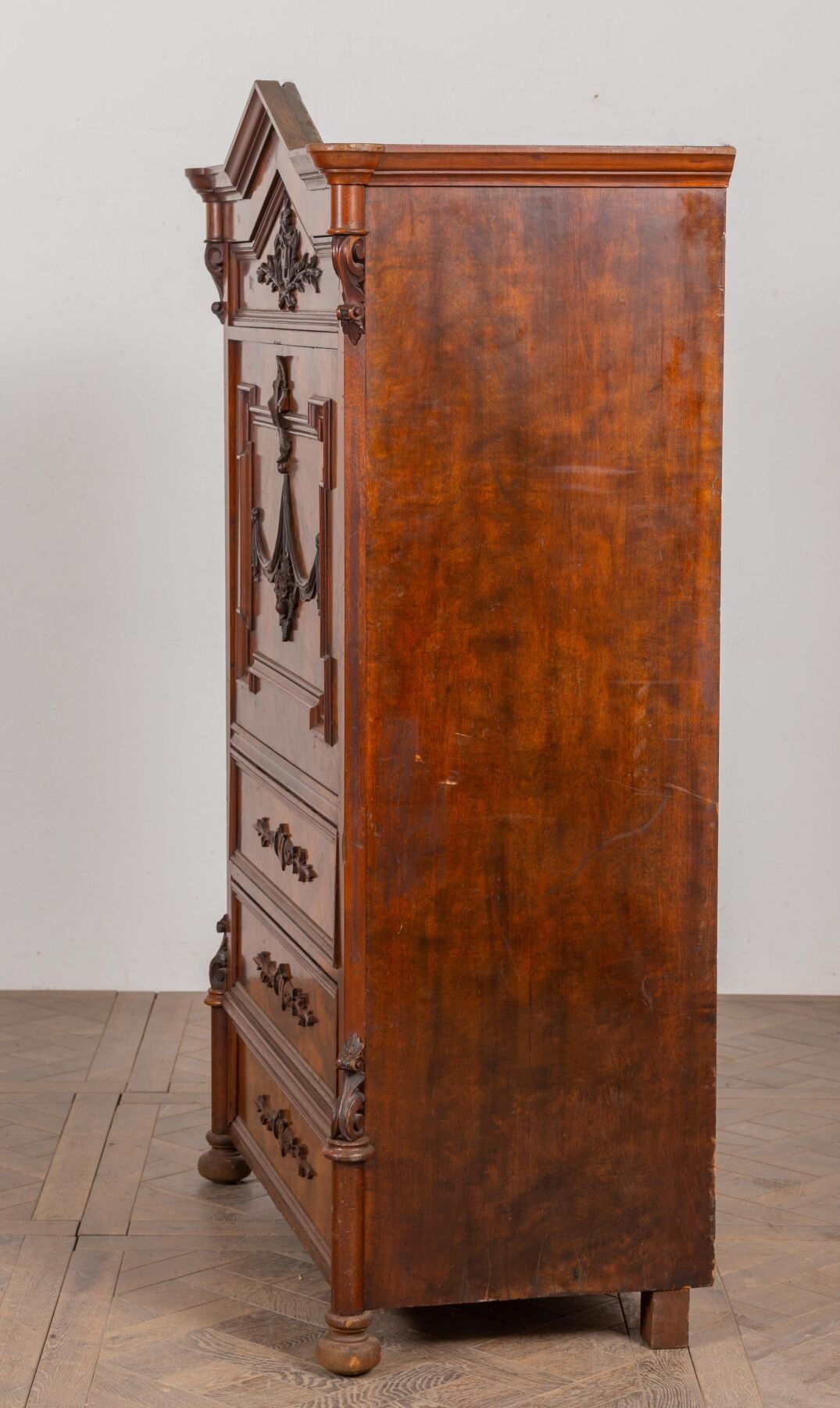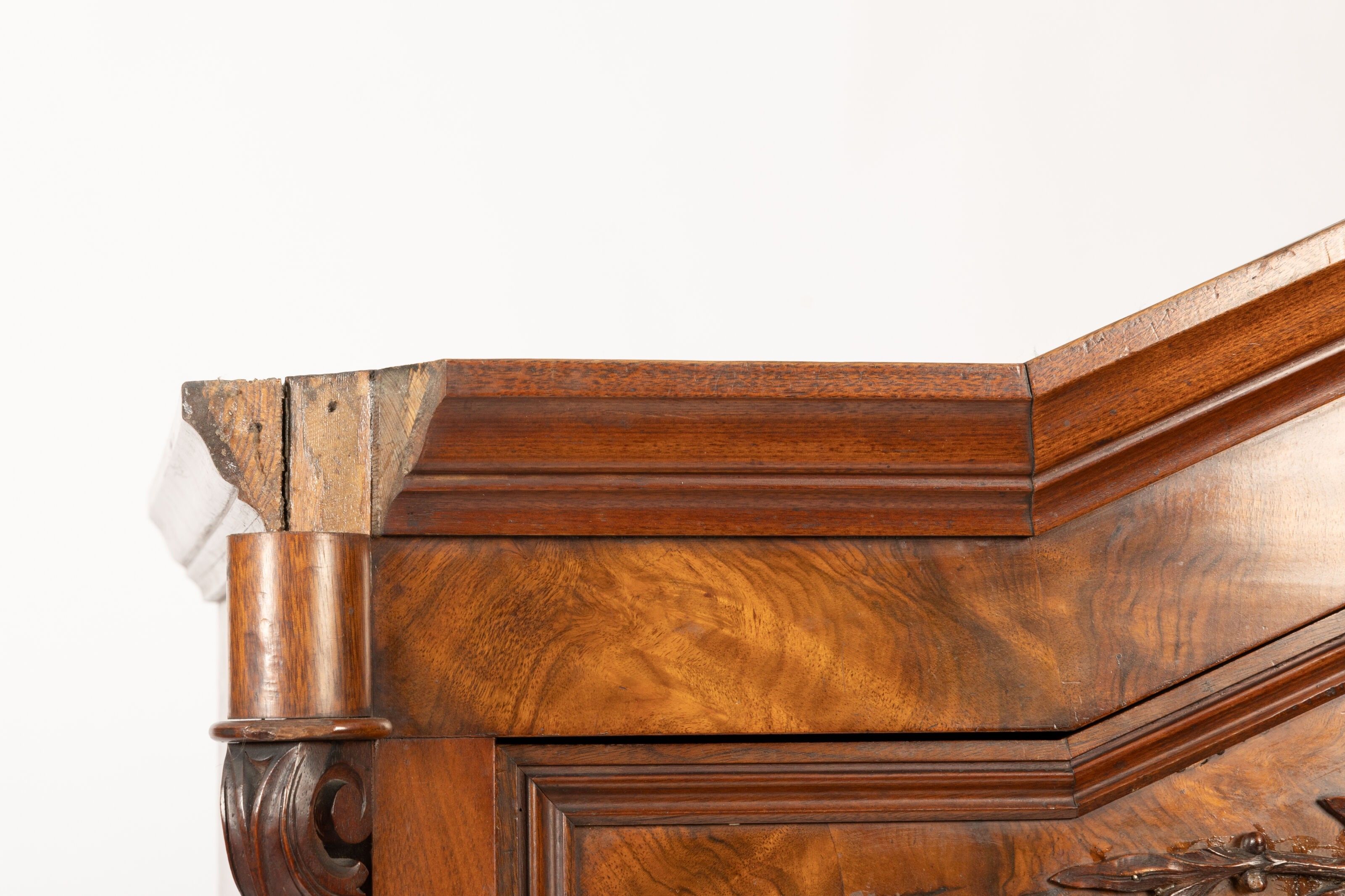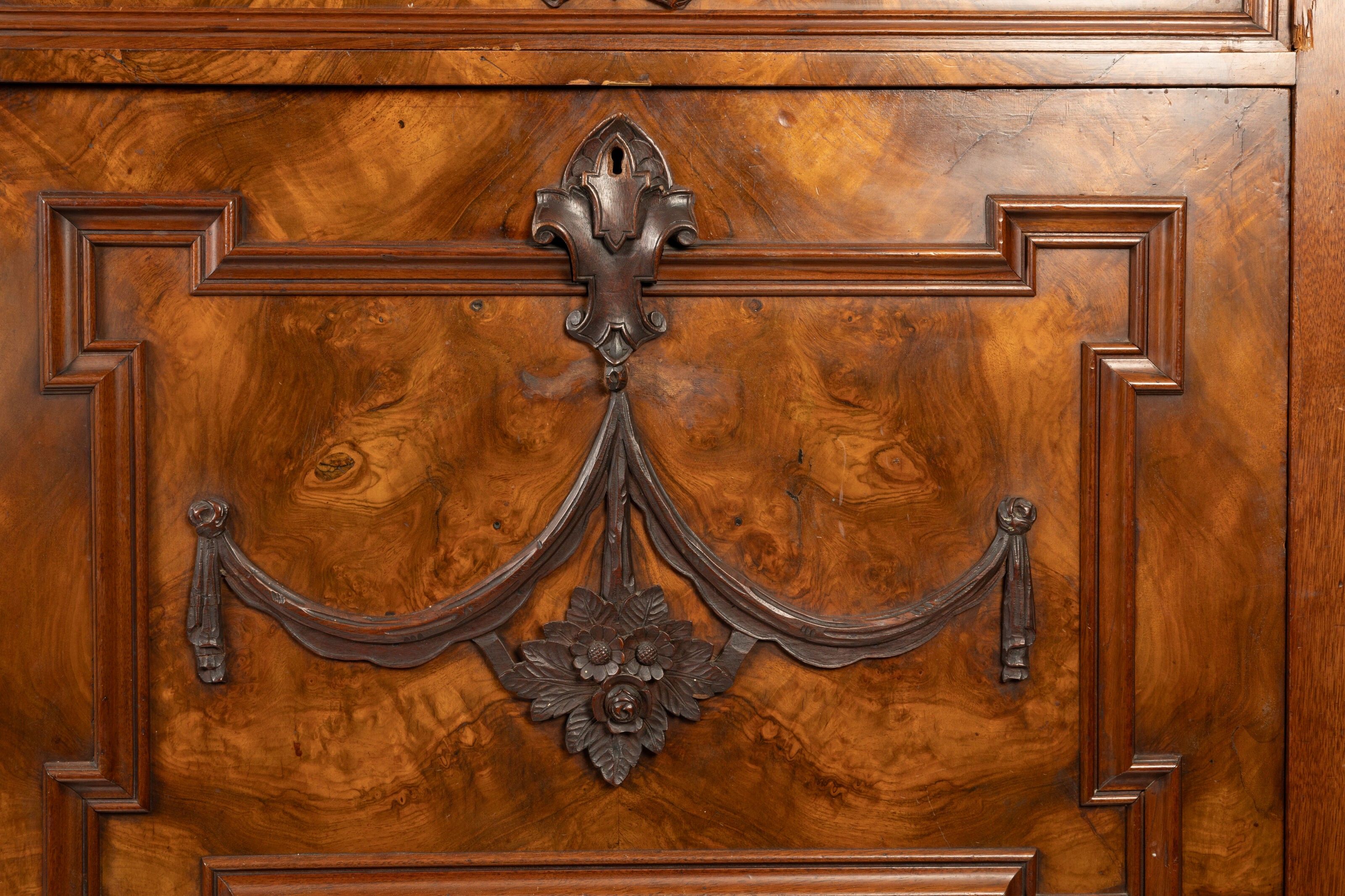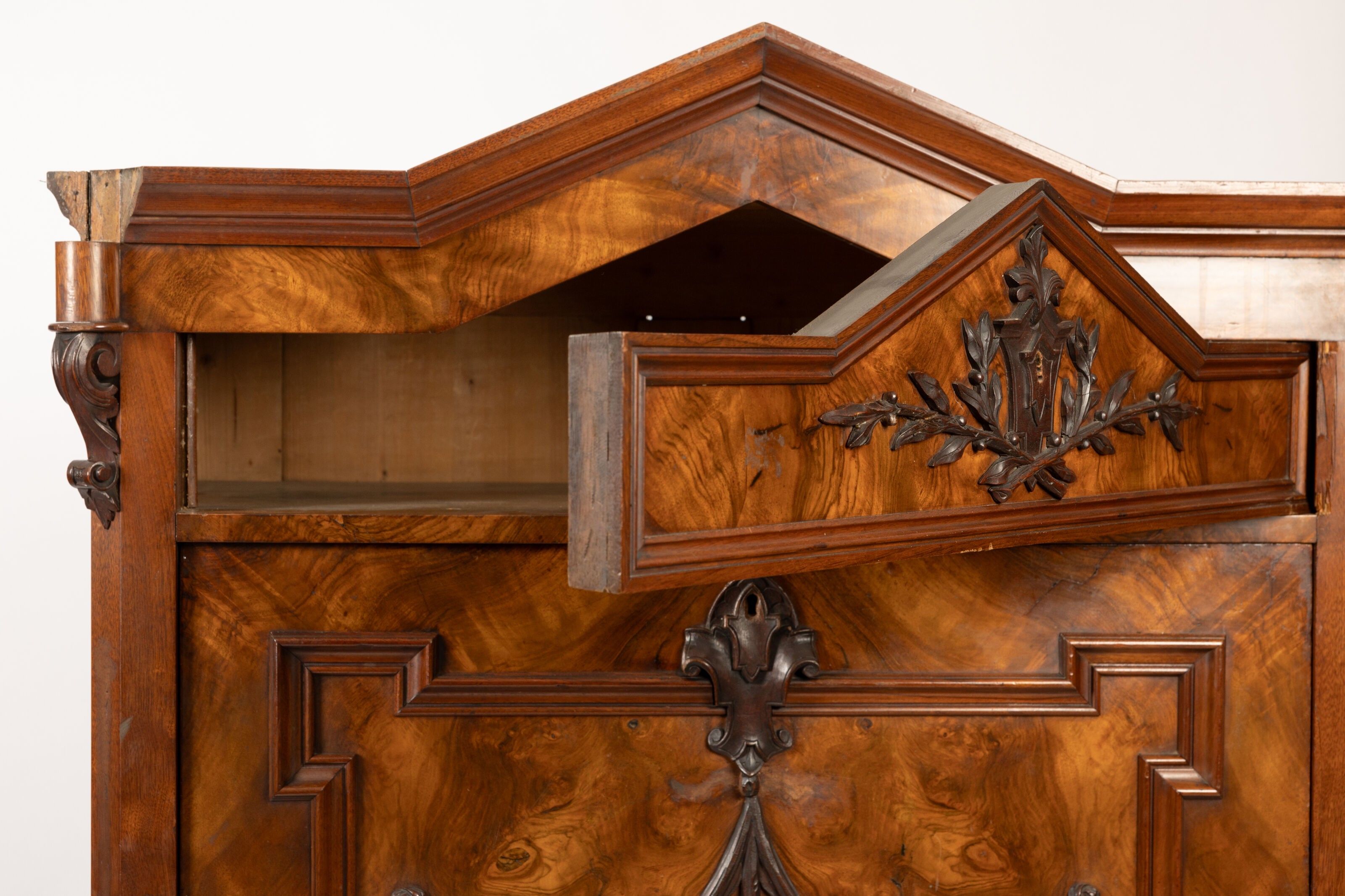 Secrétaire en bois de placage ouvrant à un abattant, trois tiroirs et un vantail à décor de frises et feuillages.