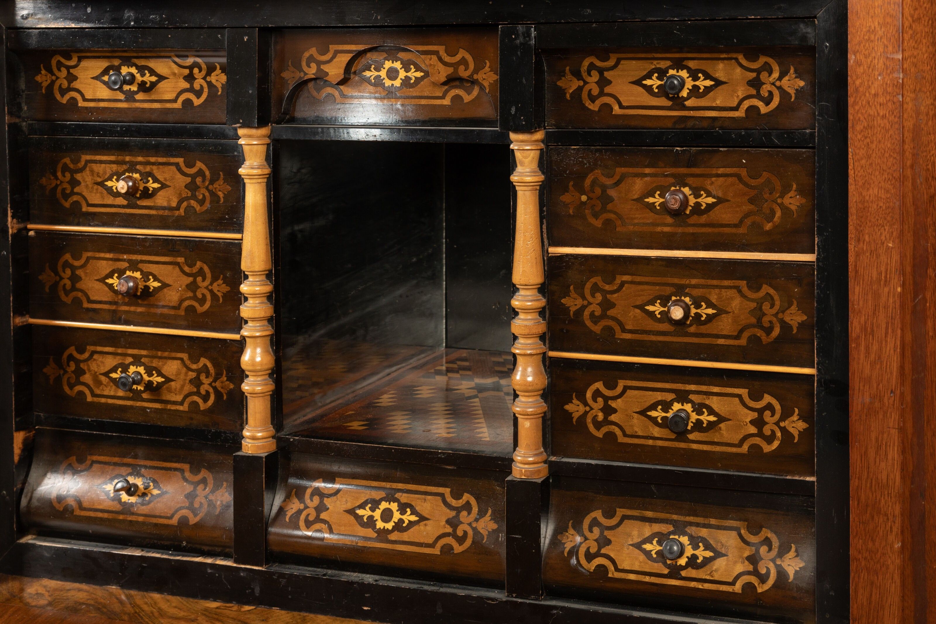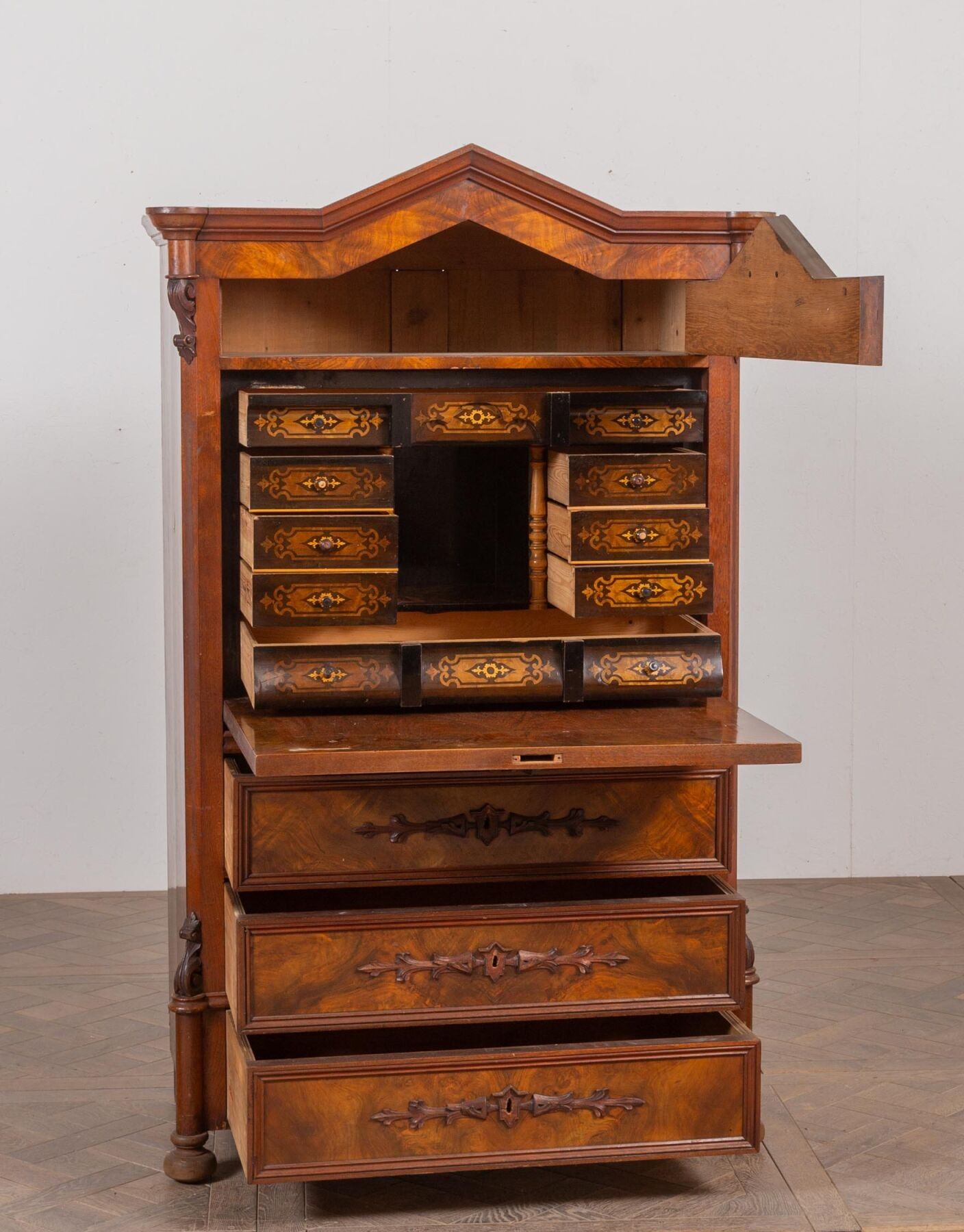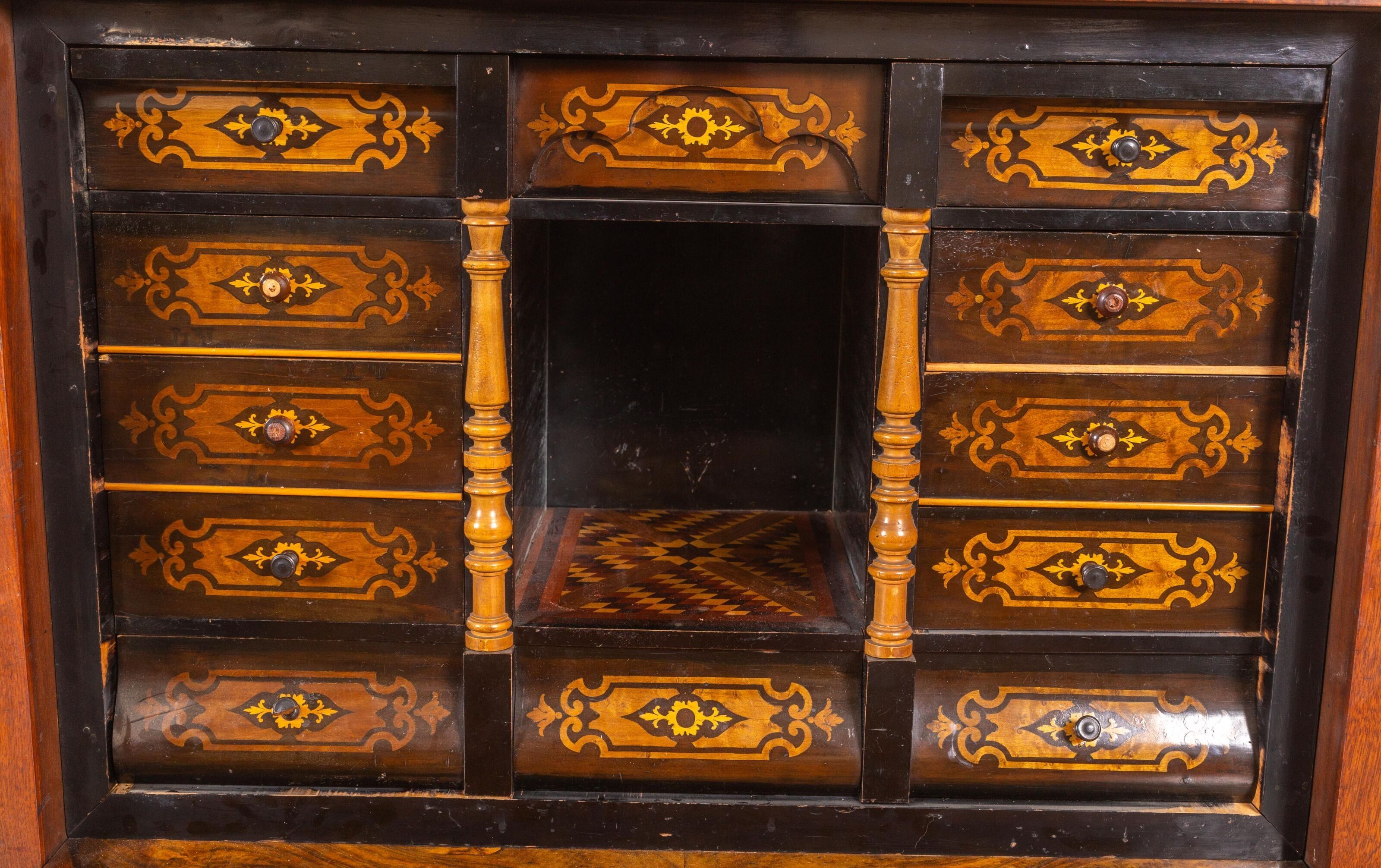 L'abattant découvrant huit petits tiroirs ornés d'une marqueterie de bois clair et colonnettes de bois tourné.