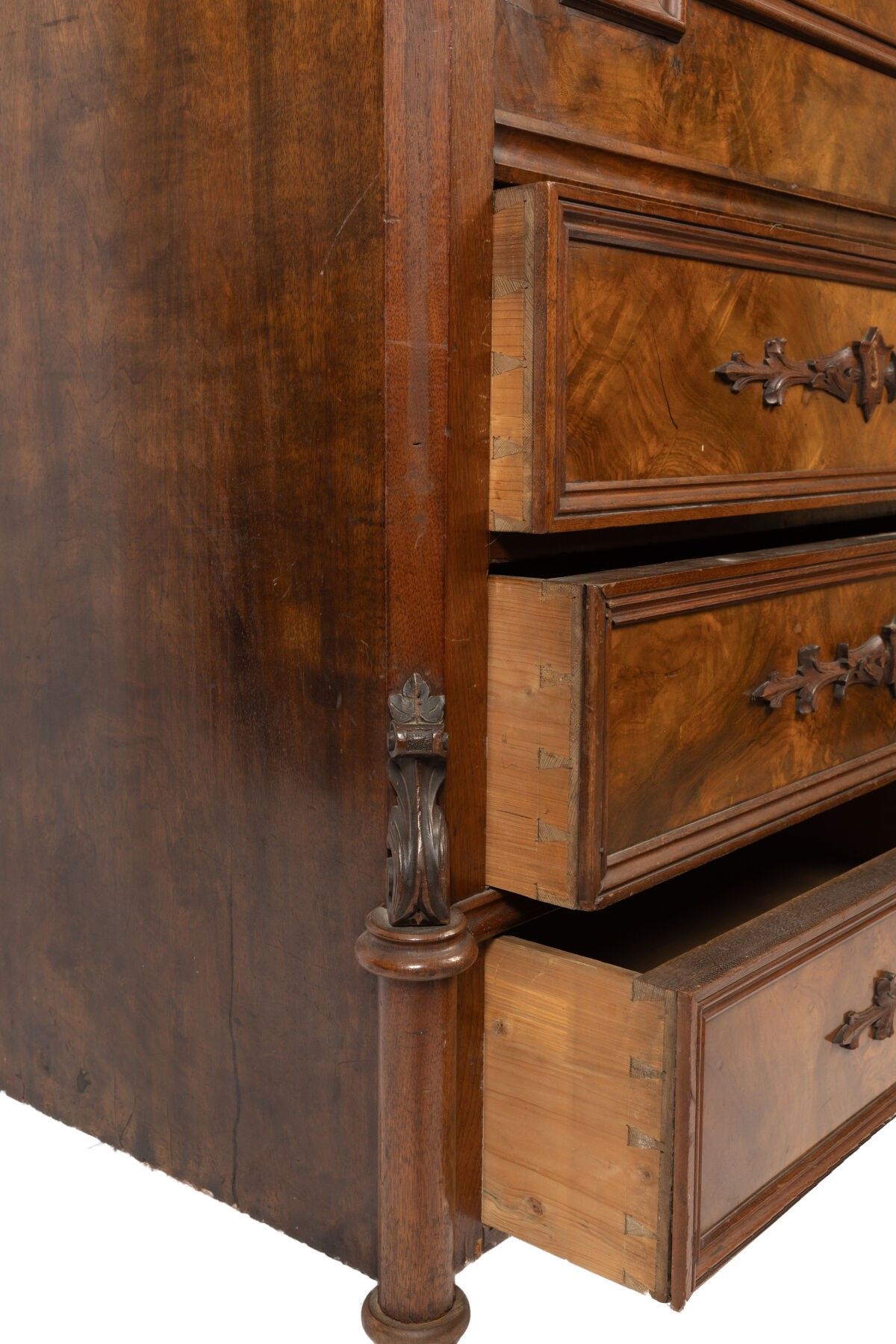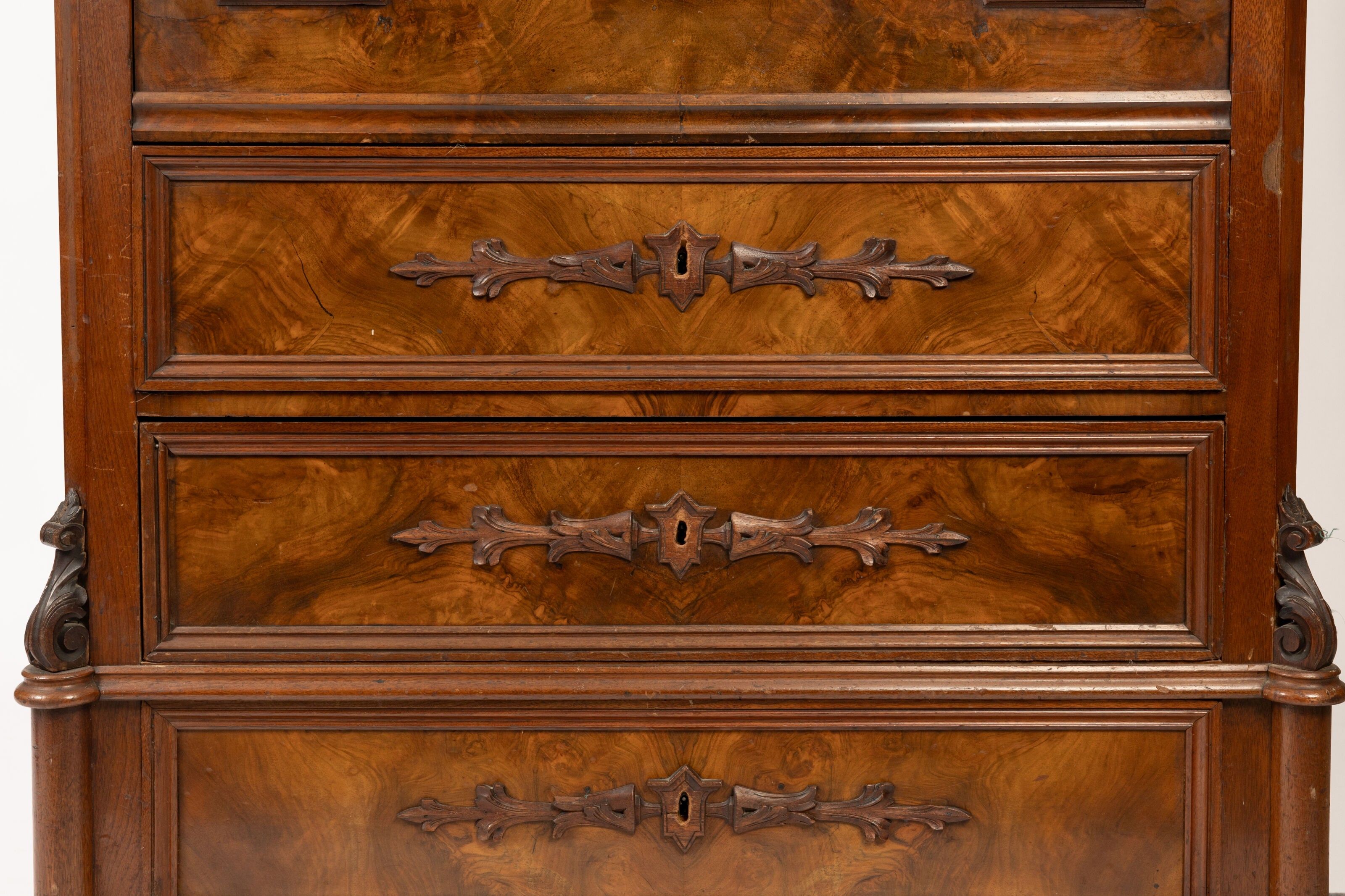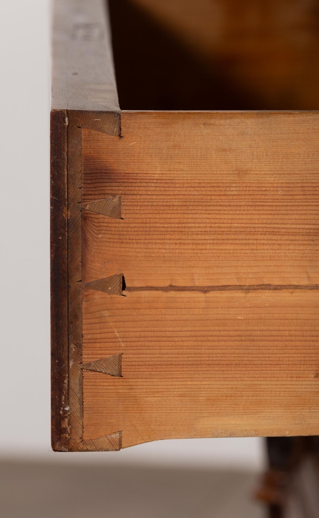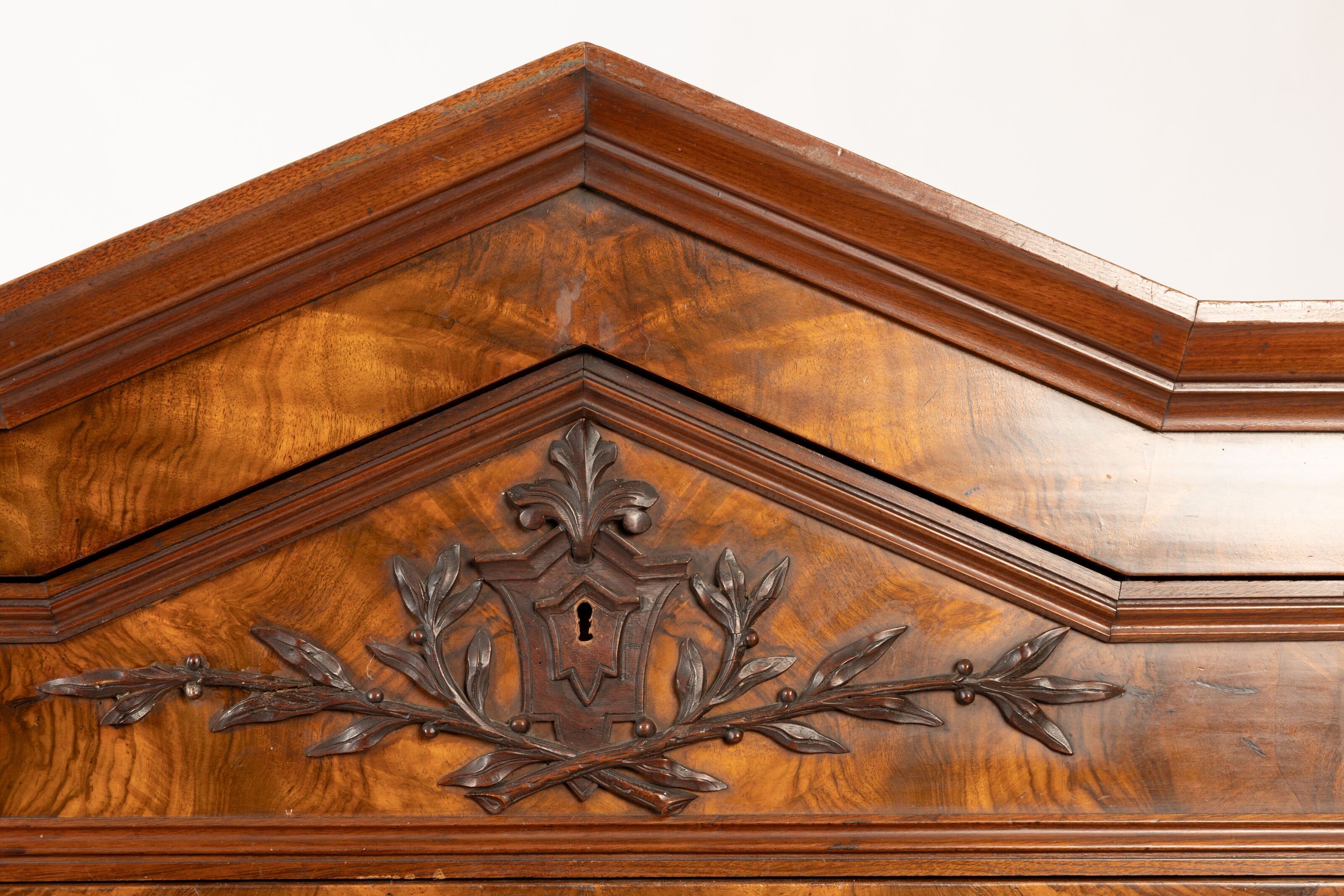 L'abattant découvrant huit petits tiroirs ornés d'une marqueterie de bois clair et colonnettes de bois tourné.