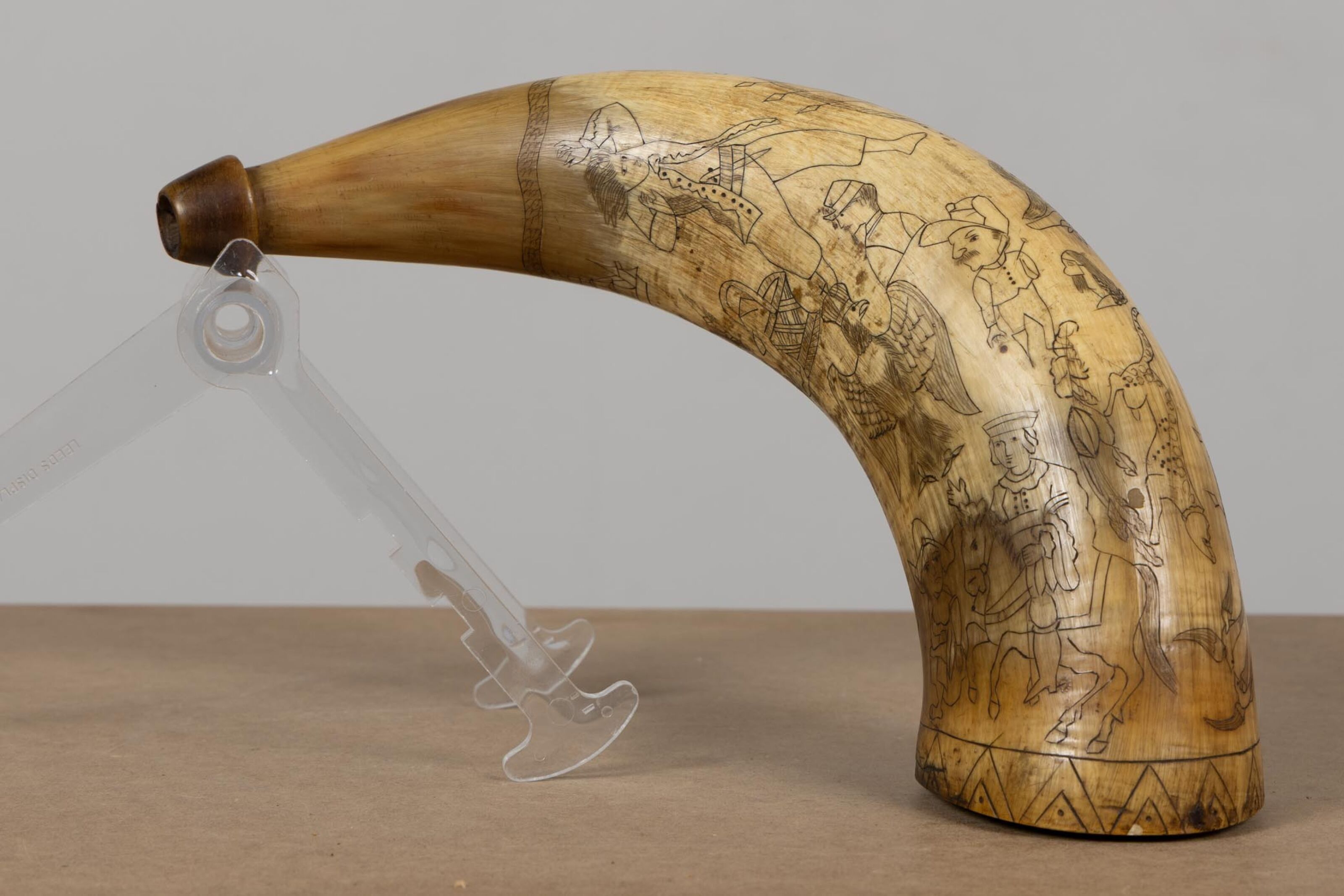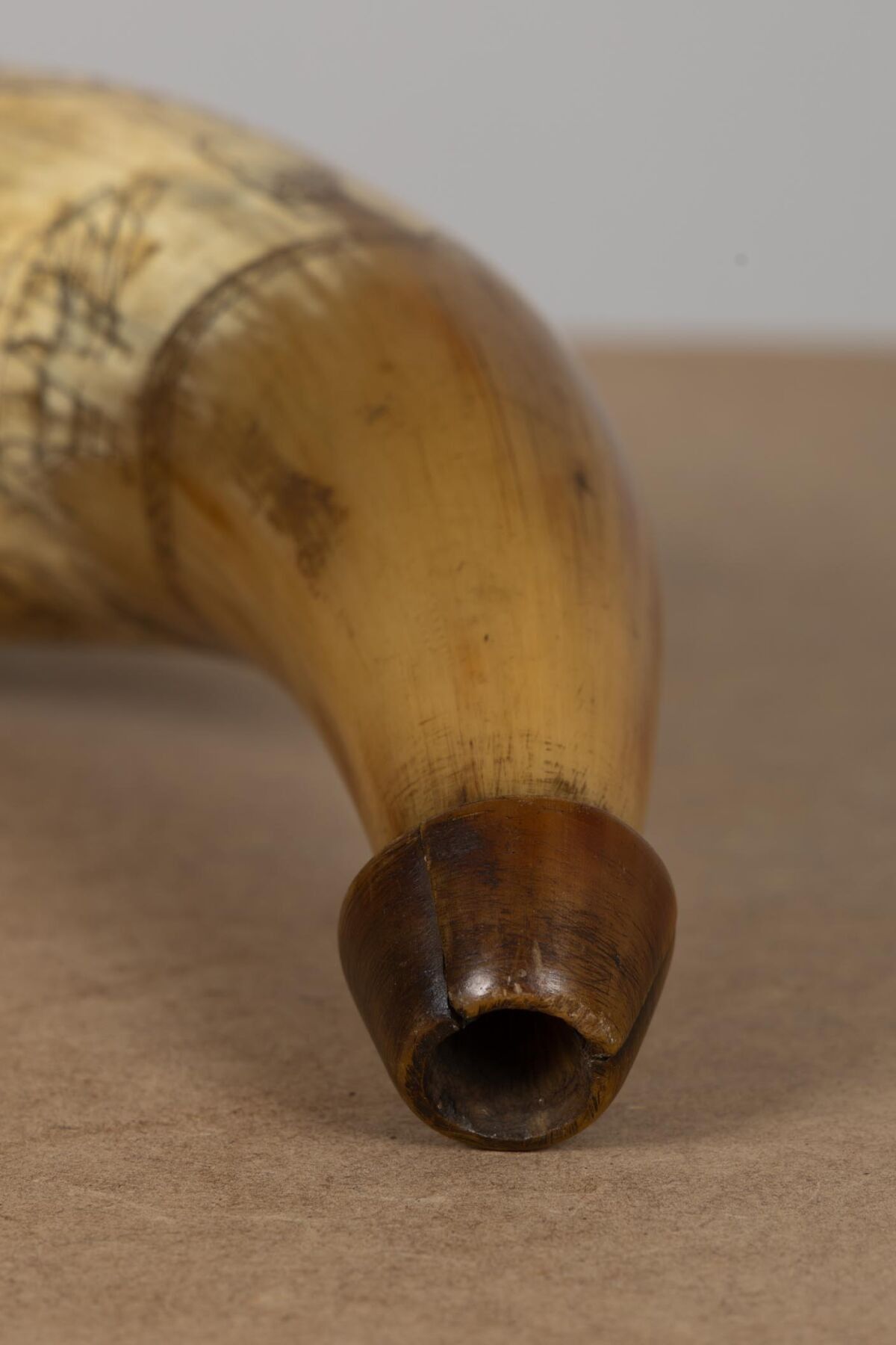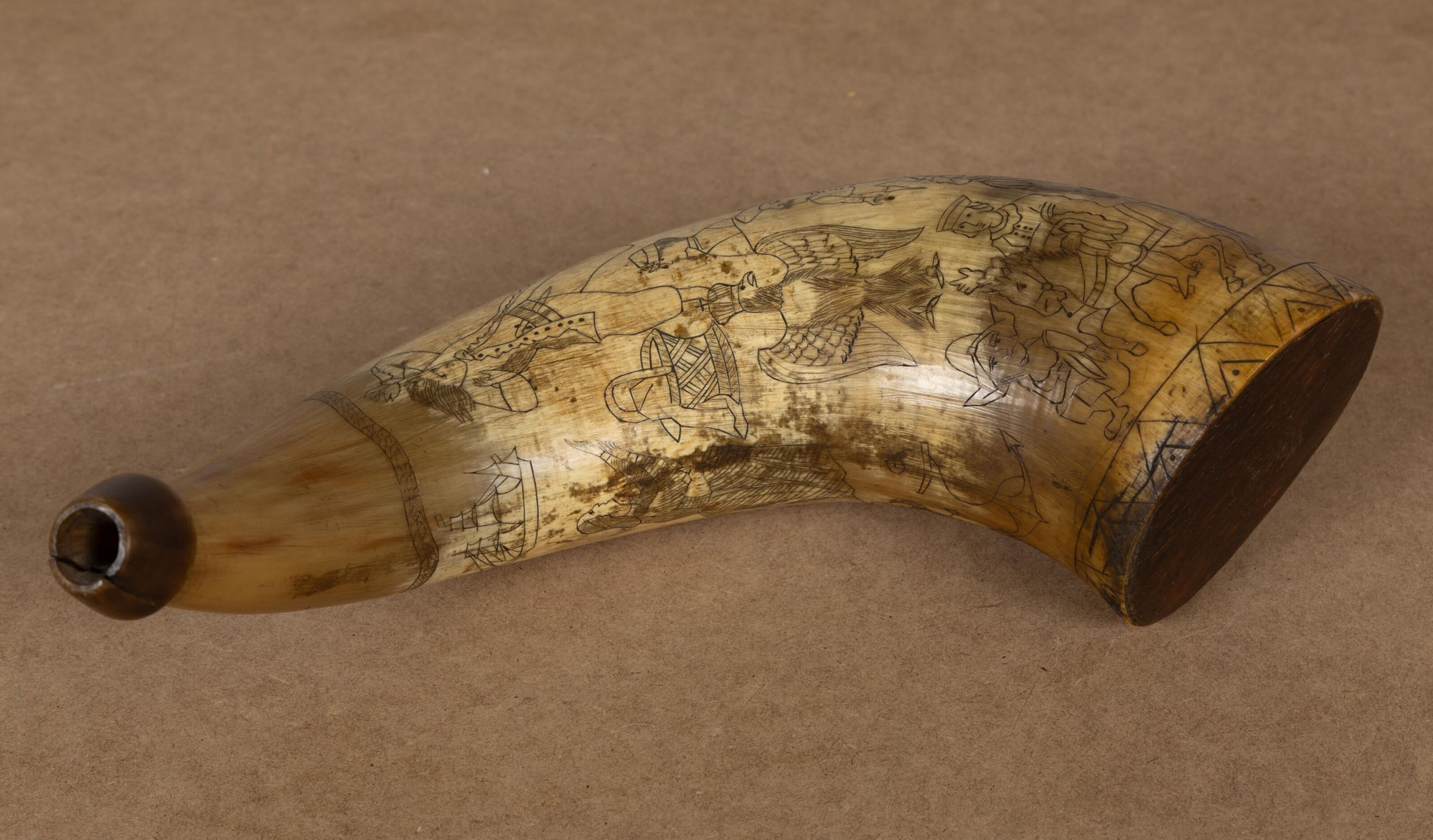Corne gravée formant poire à poudre, à décor de divers symboles : arbre phrygien, armoiries anglaises, aigle et de nombreux personngaes.
