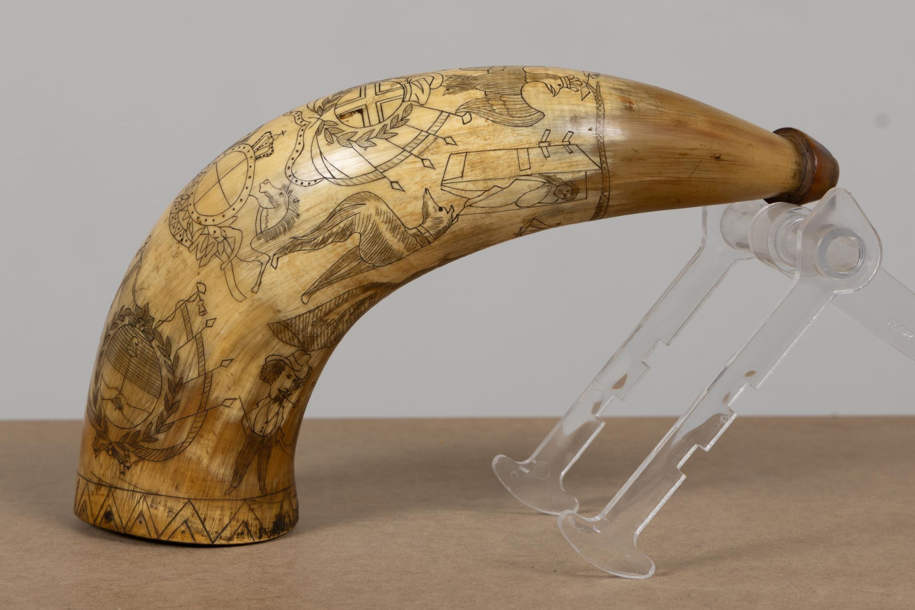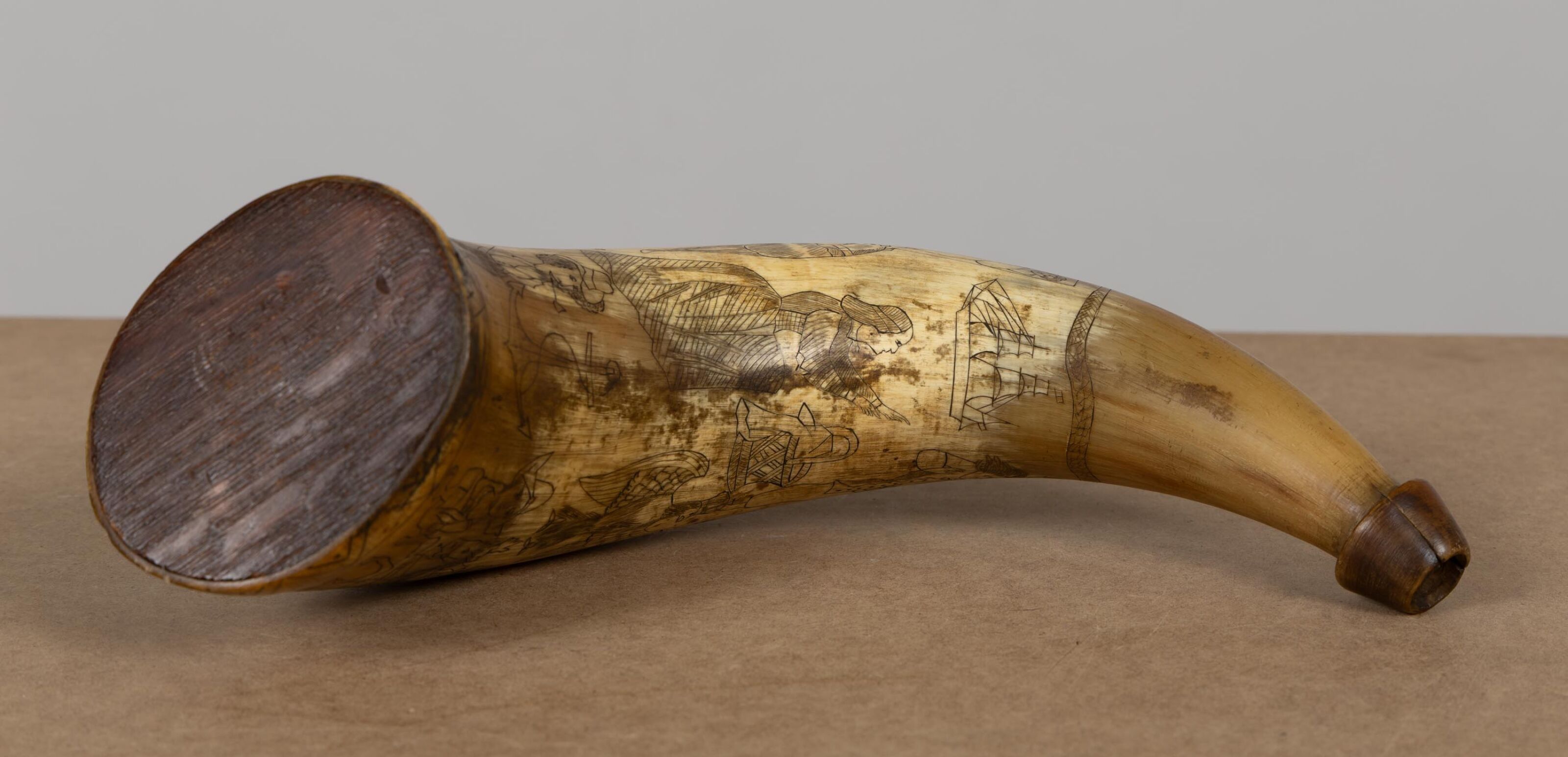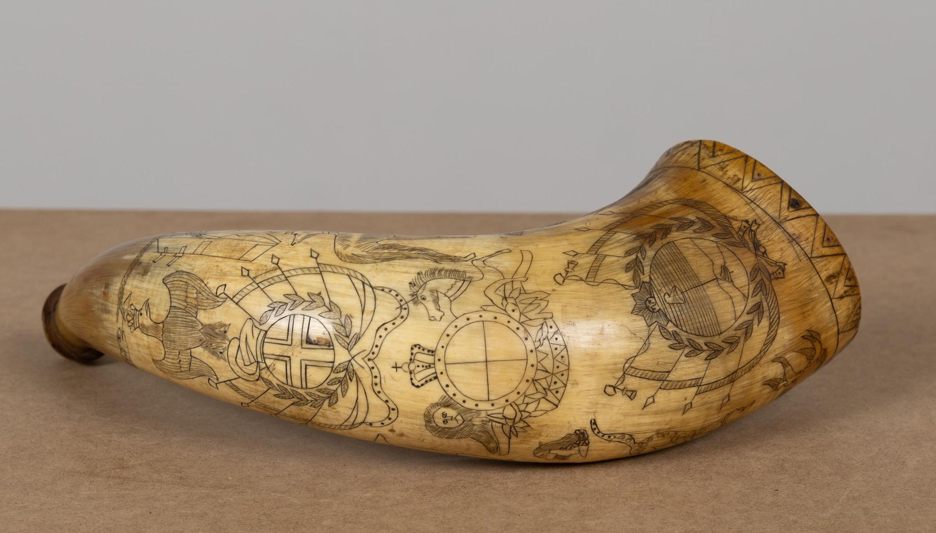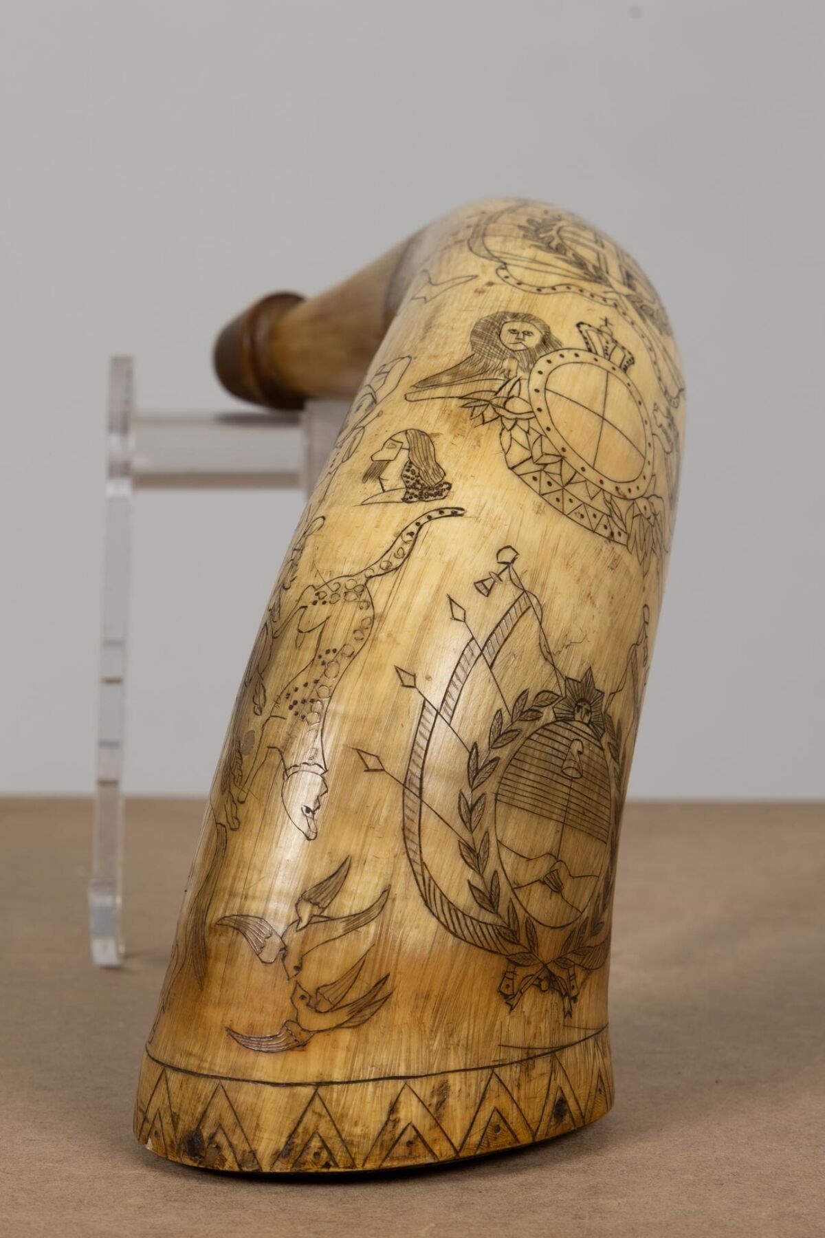 Corne gravée formant poire à poudre, à décor de divers symboles : arbre phrygien, armoiries anglaises, aigle et de nombreux personngaes.