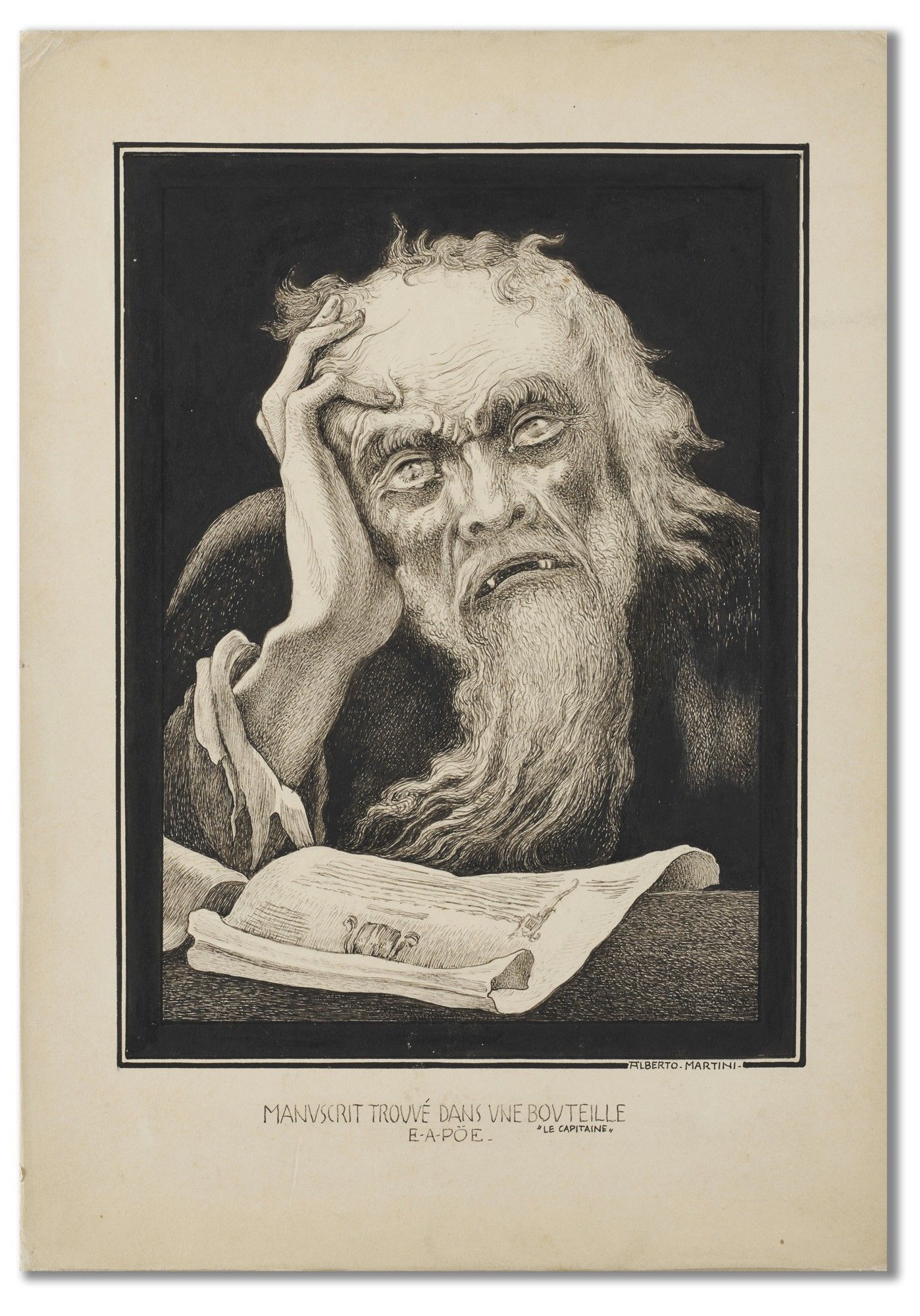 Alberto Martini (Oderzo 1876 - Milan 1954) "The Captain - Manuscrit trouve dans une bouteille - E.A. Poe" 1940 encre de Chine sur papier monté sur carton 36x25,4 cm Signé et titré en bas Titré et daté 1940 au verso Provenance Héritiers de Collection privée Expositions Les histoires extraordinaires. Alberto Martini et Edgar Allan Poe Palazzo Foscolo, Oderzo, 28 septembre 2024 - 21 avril 2025, p. 64, cat. 84 ill. dans le catalogue
