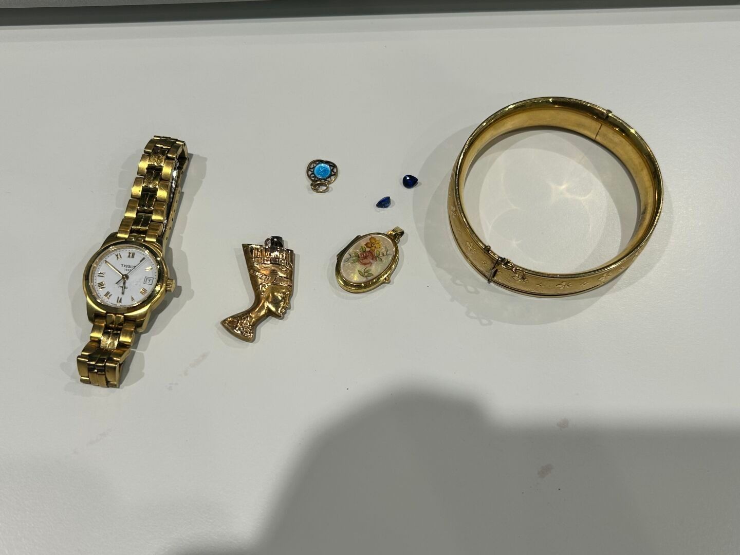 Lot en métal doré et pierre sur papier comprenant un pendentif Néfertiti, un porte-photo, deux pierres bleues, une médaille, un bracelet jonc, une montre Tissot de dame à quartz. Lot vendu en l'état sur désignation, non présent à l'étude. Délivrance sur rendez-vous uniquement. Frais de vente : 27% TTC.