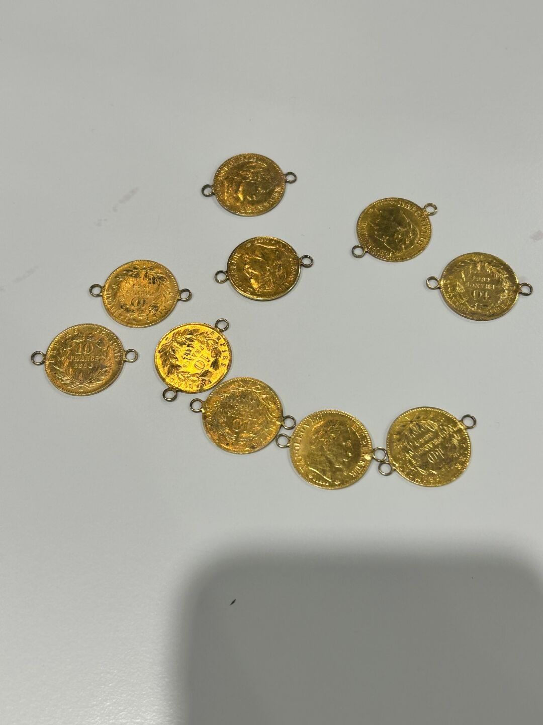 Suite de dix éléments de ceinture en or jaune formés de 10 pièces de 10 francs or 1864-1868 - 1865 - 1867, avec anneaux...