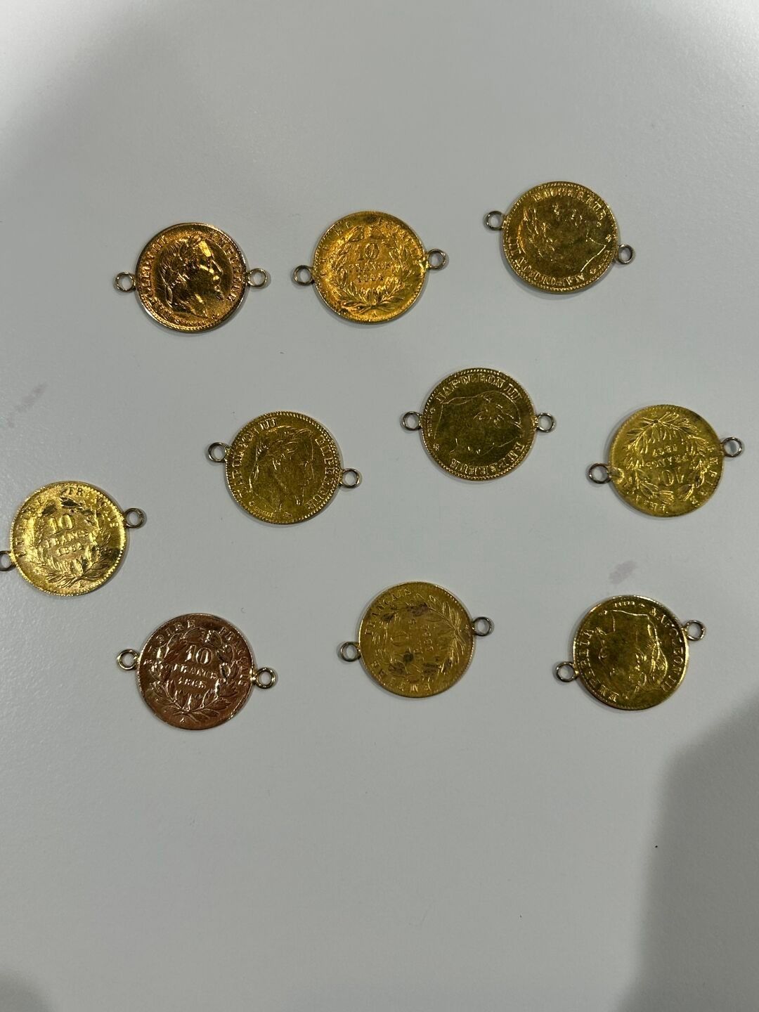 Suite de dix éléments de ceinture en or jaune formés de 10 pièces de 10 francs or 1864 - 1865 - 1867, avec anneaux... Poids : 31 g. Lot vendu en l'état sur désignation, non présent à l'étude. Délivrance sur rendez-vous uniquement. Frais de vente : 14,40 % TTC.