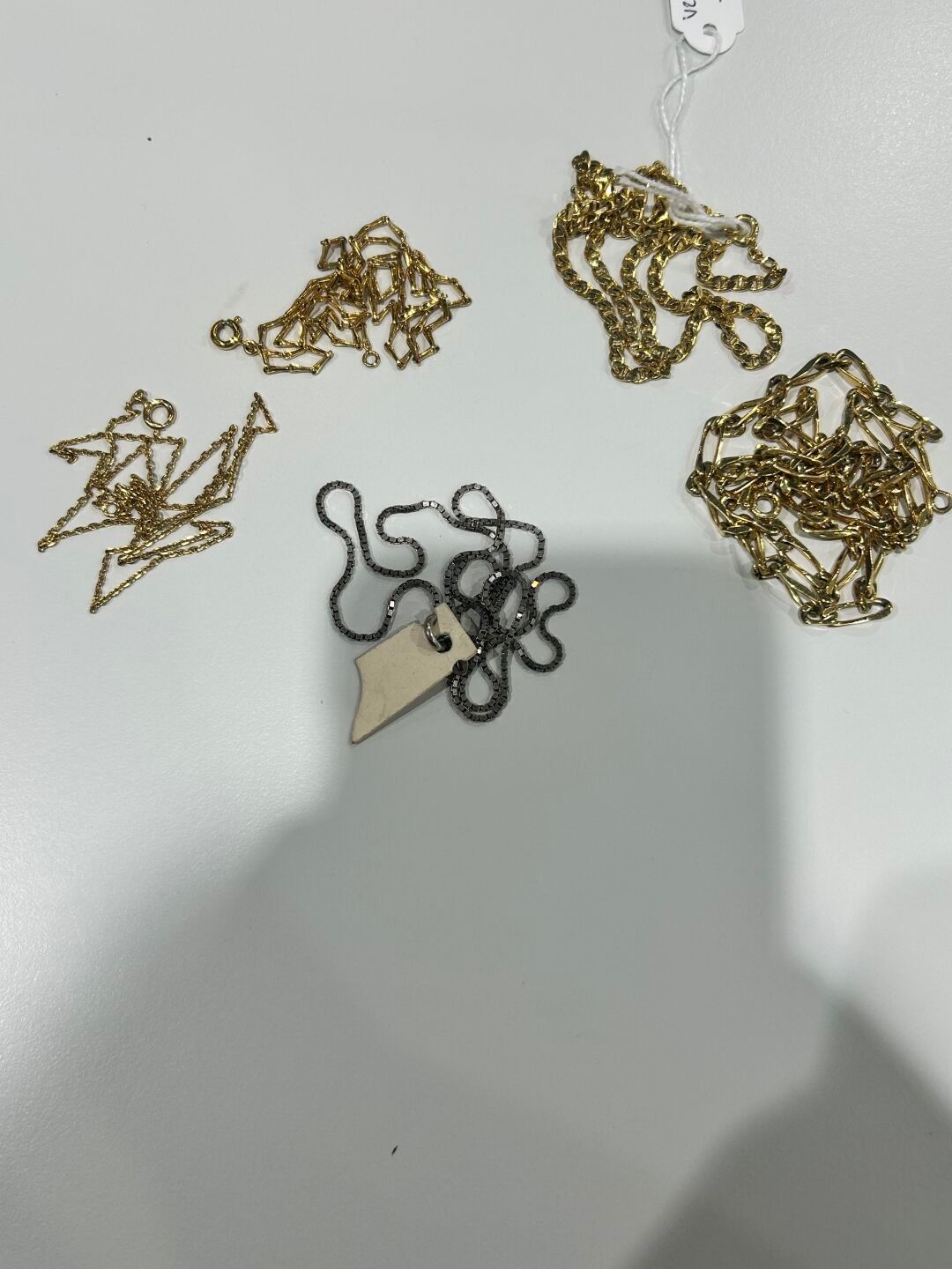 Quatre CHAINES en métal doré et une chaîne en argent. Poids d'argent : 4 g. Lot vendu en l'état sur désignation, non présent à l'étude. Délivrance sur rendez-vous uniquement. Frais de vente : 27% TTC.