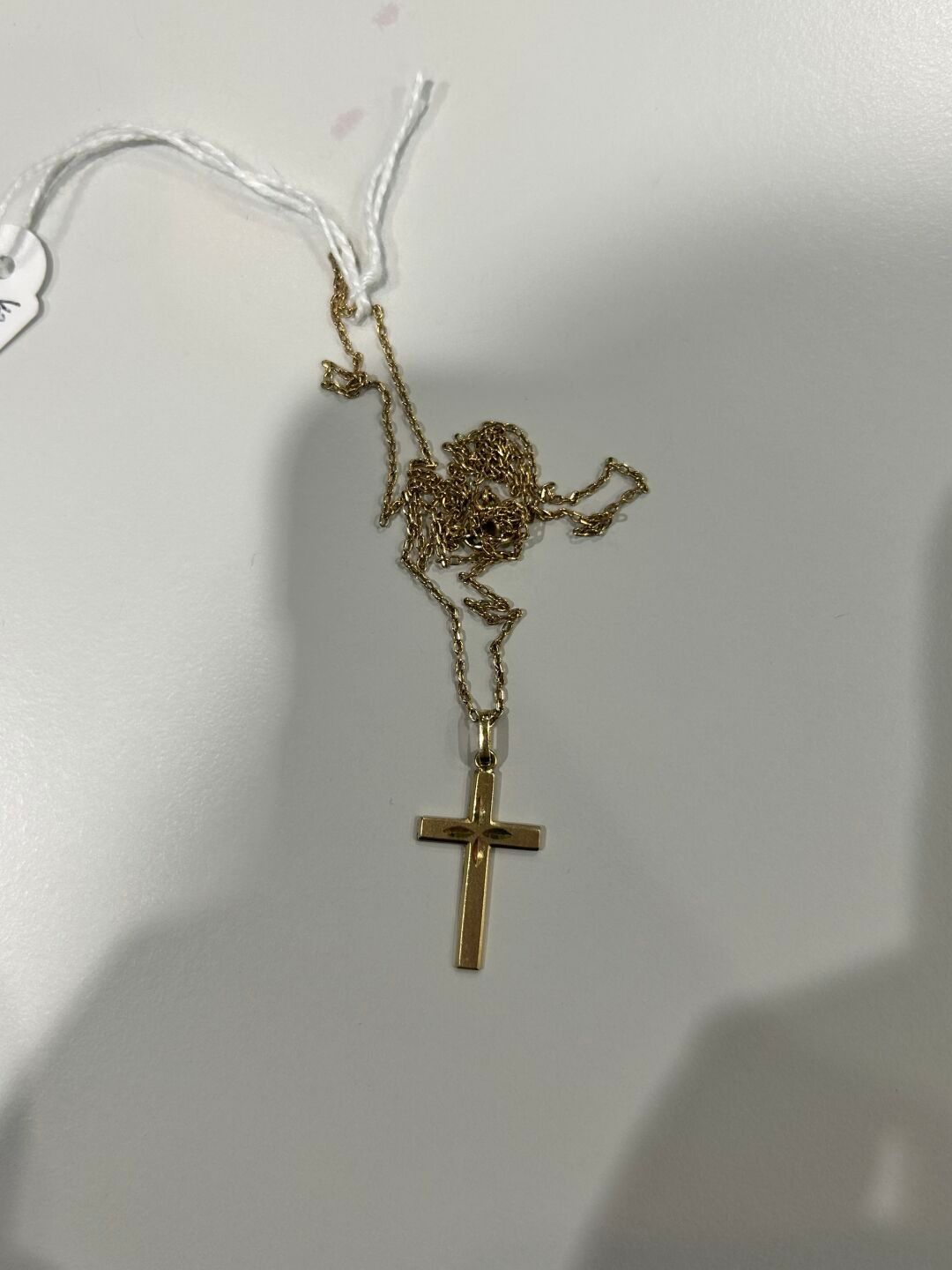 CROIX et chaine en or jaune 750 °/°°. Poids : 3,9 g. Lot vendu en l'état sur désignation, non présent à l'étude. Délivrance sur rendez-vous uniquement. Frais de vente : 27% TTC.