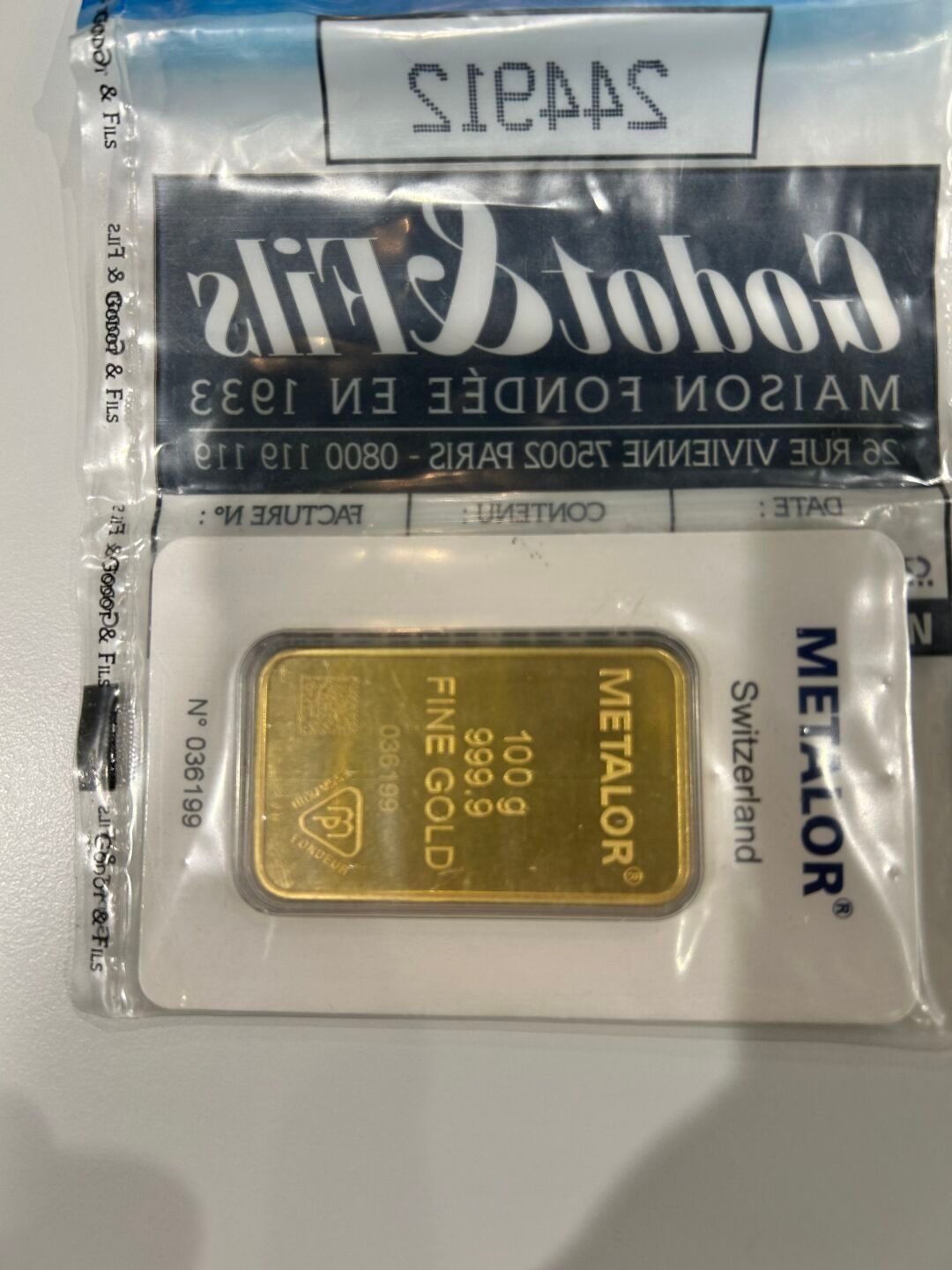 1 LINGOTIN or 100 grammes, n°036199. Sous scellée. Lot vendu en l'état sur désignation, non présent à l'étude. Délivrance sur rendez-vous uniquement. Frais de vente : 14,40 % TTC.