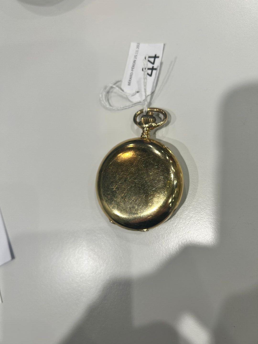 LIP Une MONTRE chronomètre de gousset en or jaune 750 °/°°, avec cadran secondes et cadra jours. Poids brut : 89,6 g. Lot vendu en l'état sur désignation, non présent à l'étude. Délivrance sur rendez-vous uniquement. Frais de vente : 27% TTC.