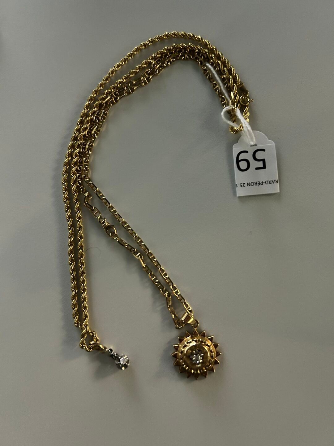 Deux CHAINES en or jaune 750 °/°° maille torsadée, avec breloque en or et diamants. Poids brut : 16,7 g.