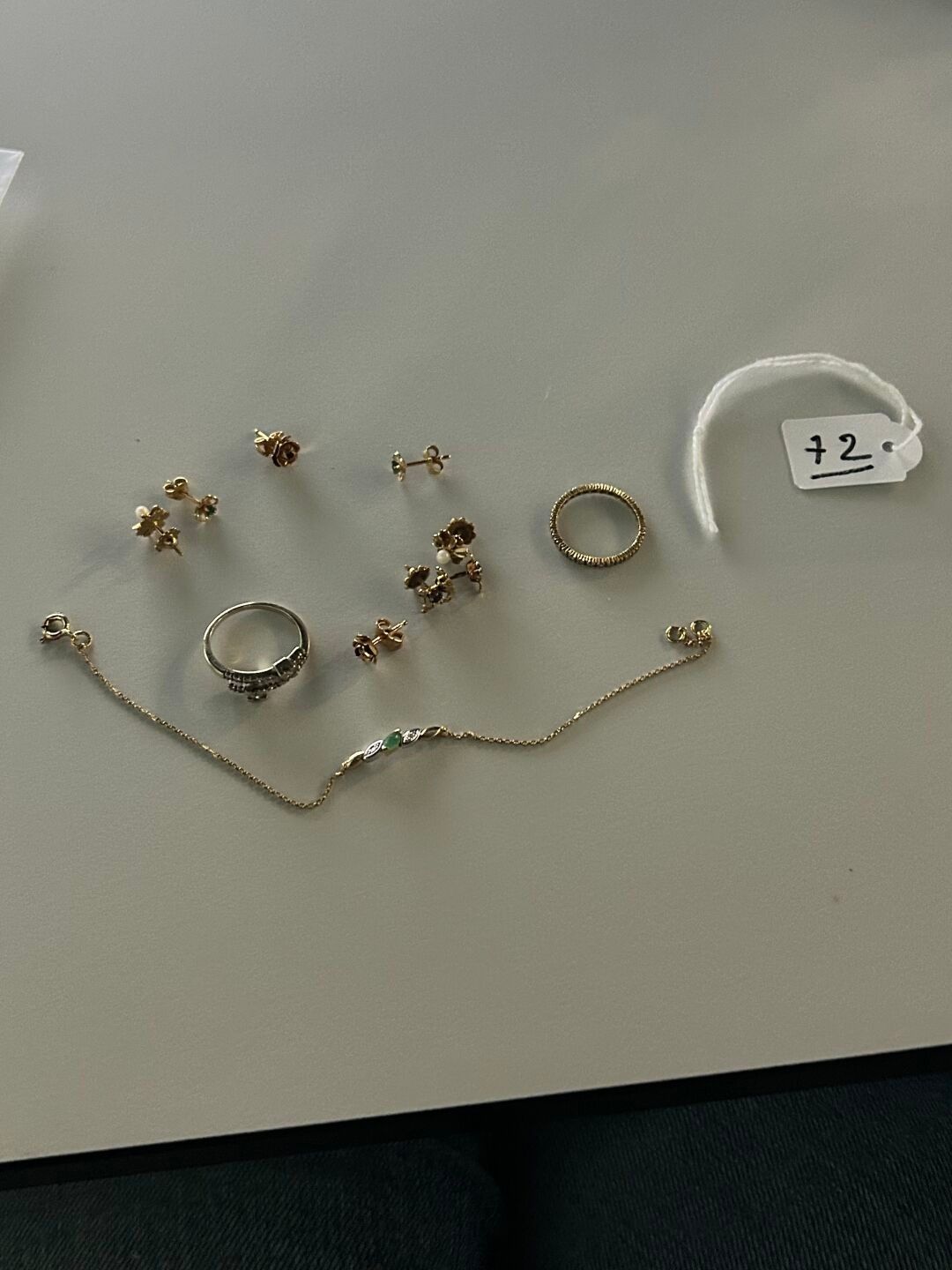 Deux BAGUES, un bracelet, diamants et émeraude. On joint quatre paires de BOUCLES d'OREILLES en or jaune 750 °/°° et pierres. Poids brut : 10,1 g.
