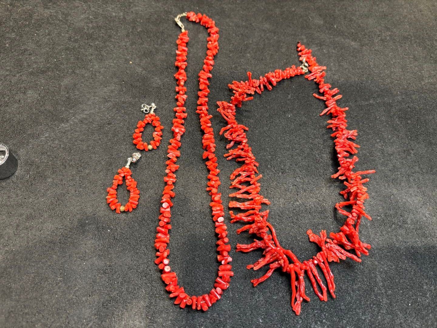 Deux COLLIERS corail et une Paire de BOUCLES d'OREILLES cora…