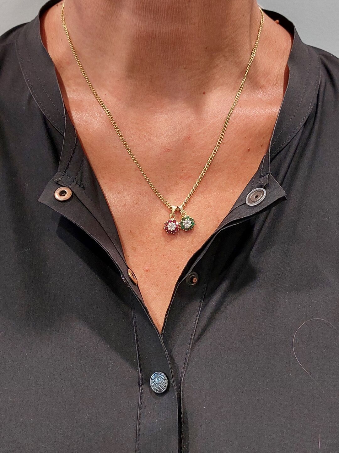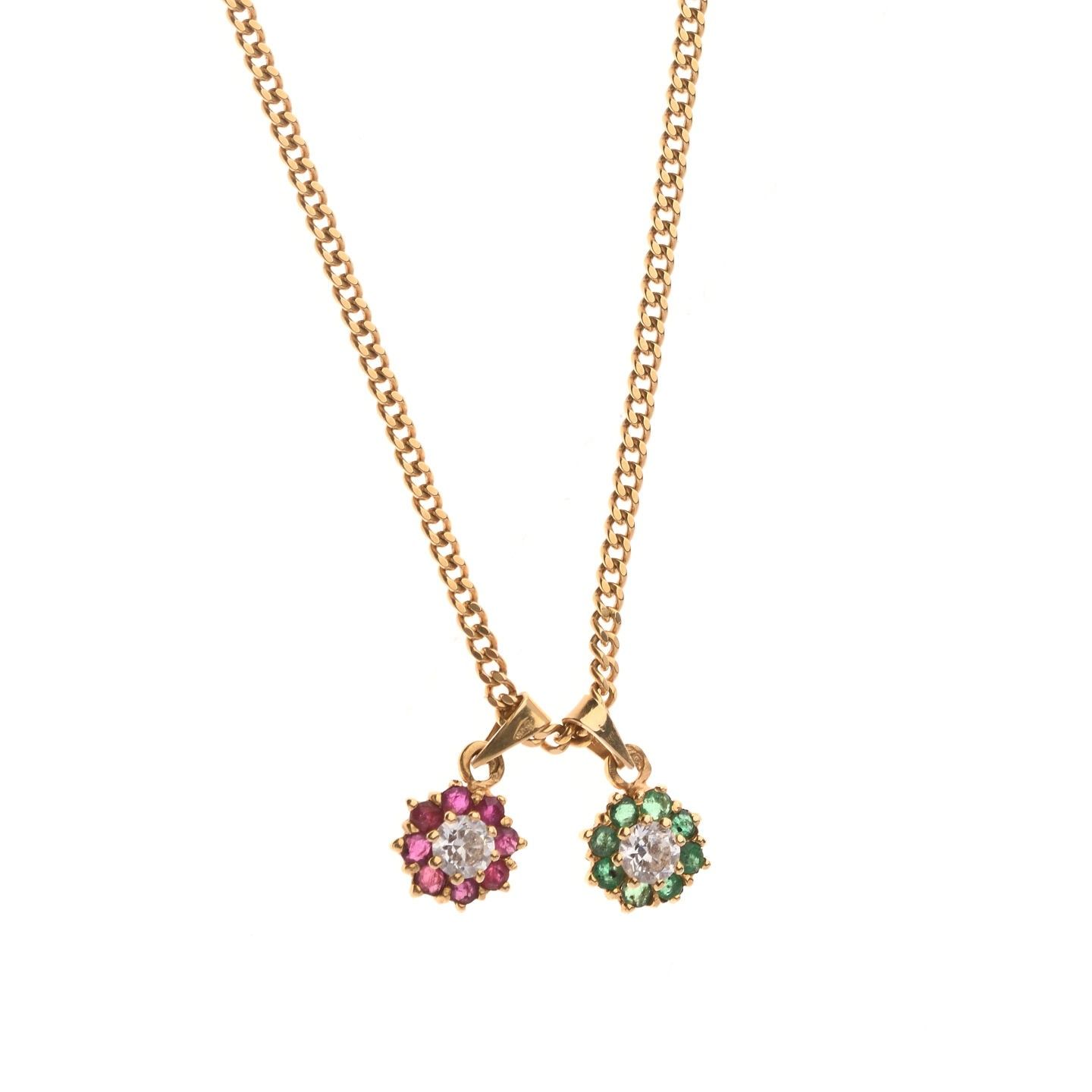 CHAINE avec deux pendentifs en or jaune 750 °/°° ornés de pierres. Poids brut : 11,3 g.