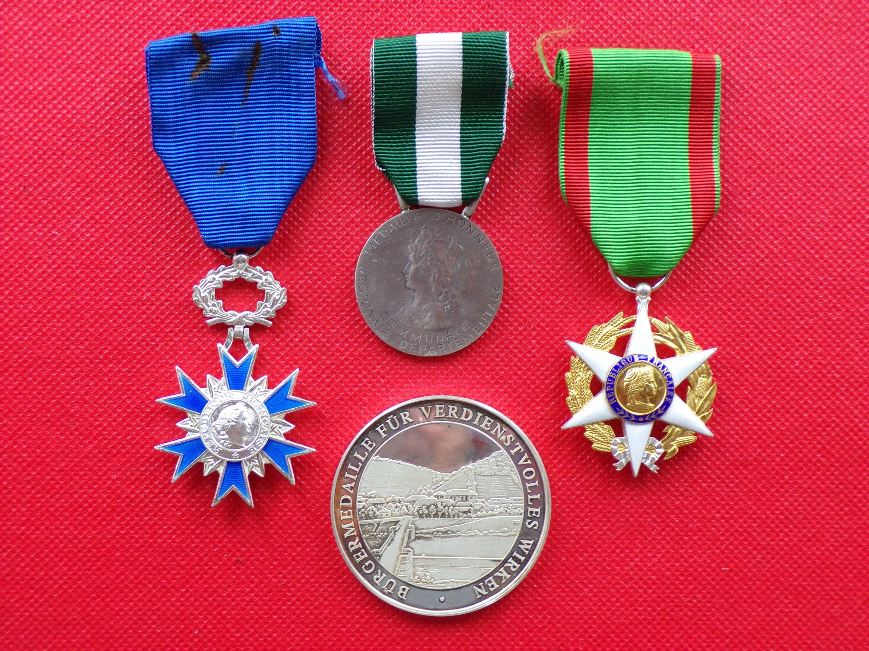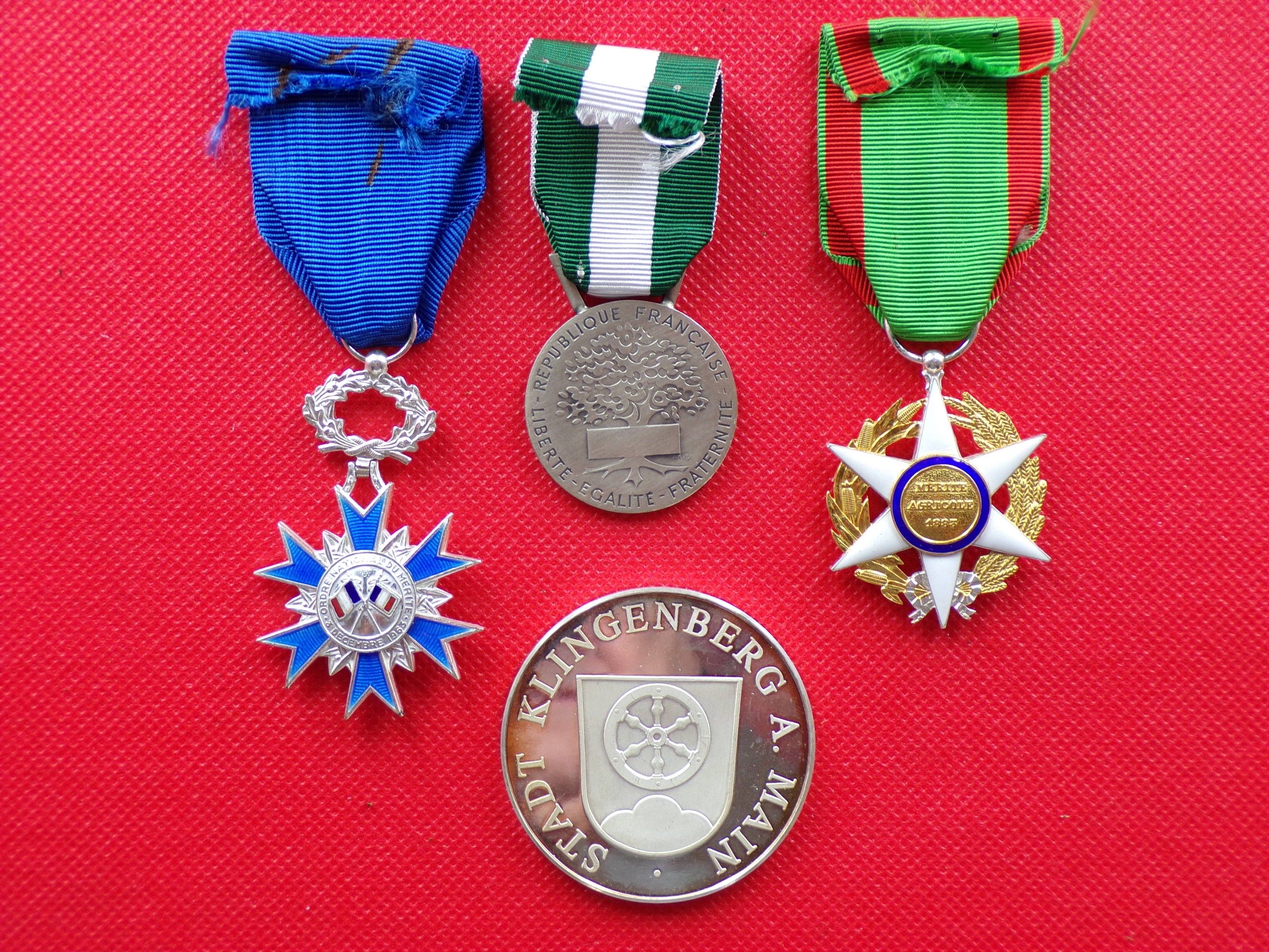 Lot de 4 Décorations et Médailles en argent. Ordre du Mérite Chevalier. Ordre du Mérite Agricole Chevalier. Médaille Communale et Médaille de Klingenberg (Bavière), poids 50g, pour le jumelage avec St-Laurent d'Arce (33 - Gironde). TTB+ et SUP