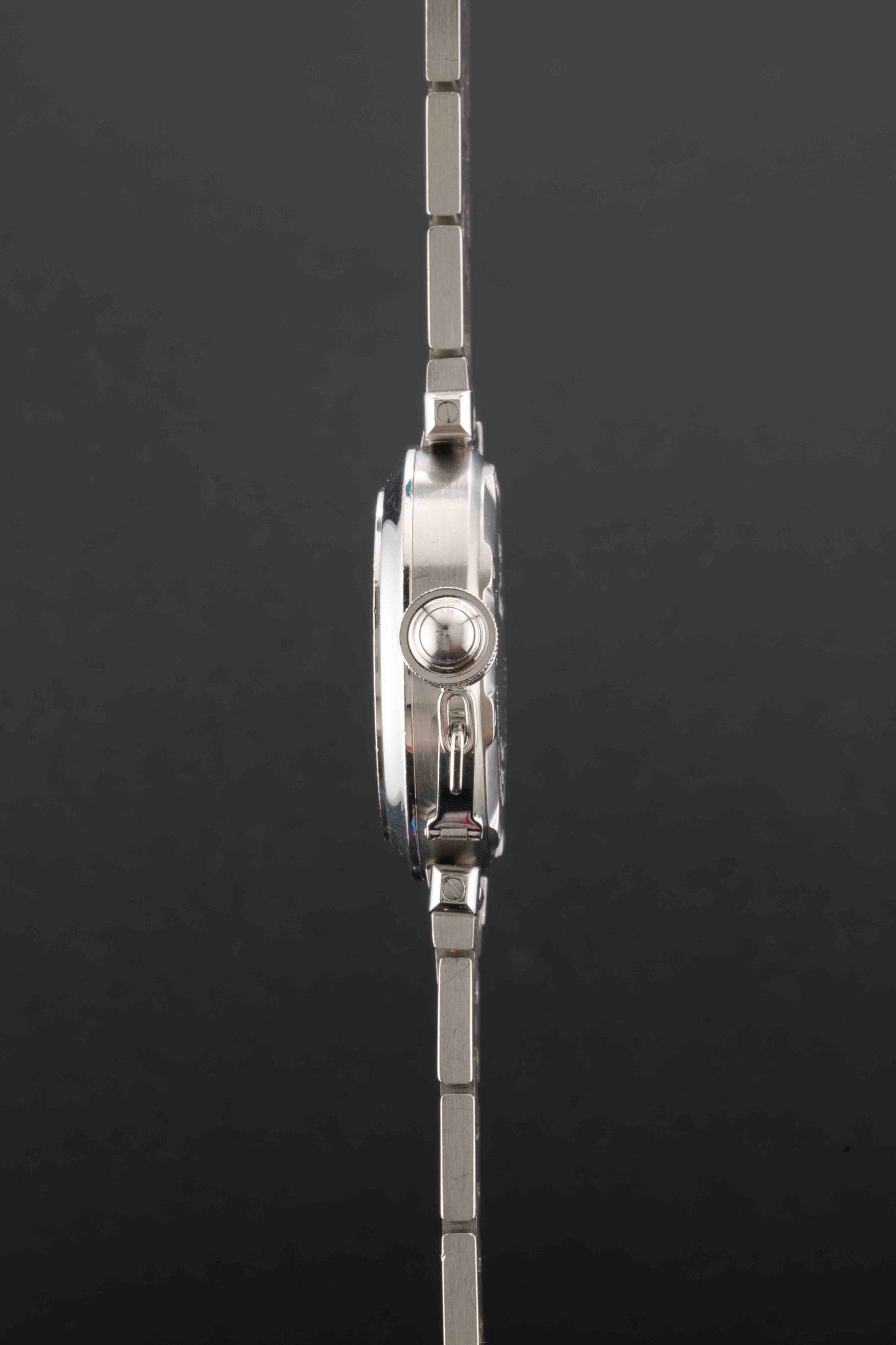 Cadran : blanc signé Cartier, index chiffres arabes peints, chemin de fer, guichet date à 6h.