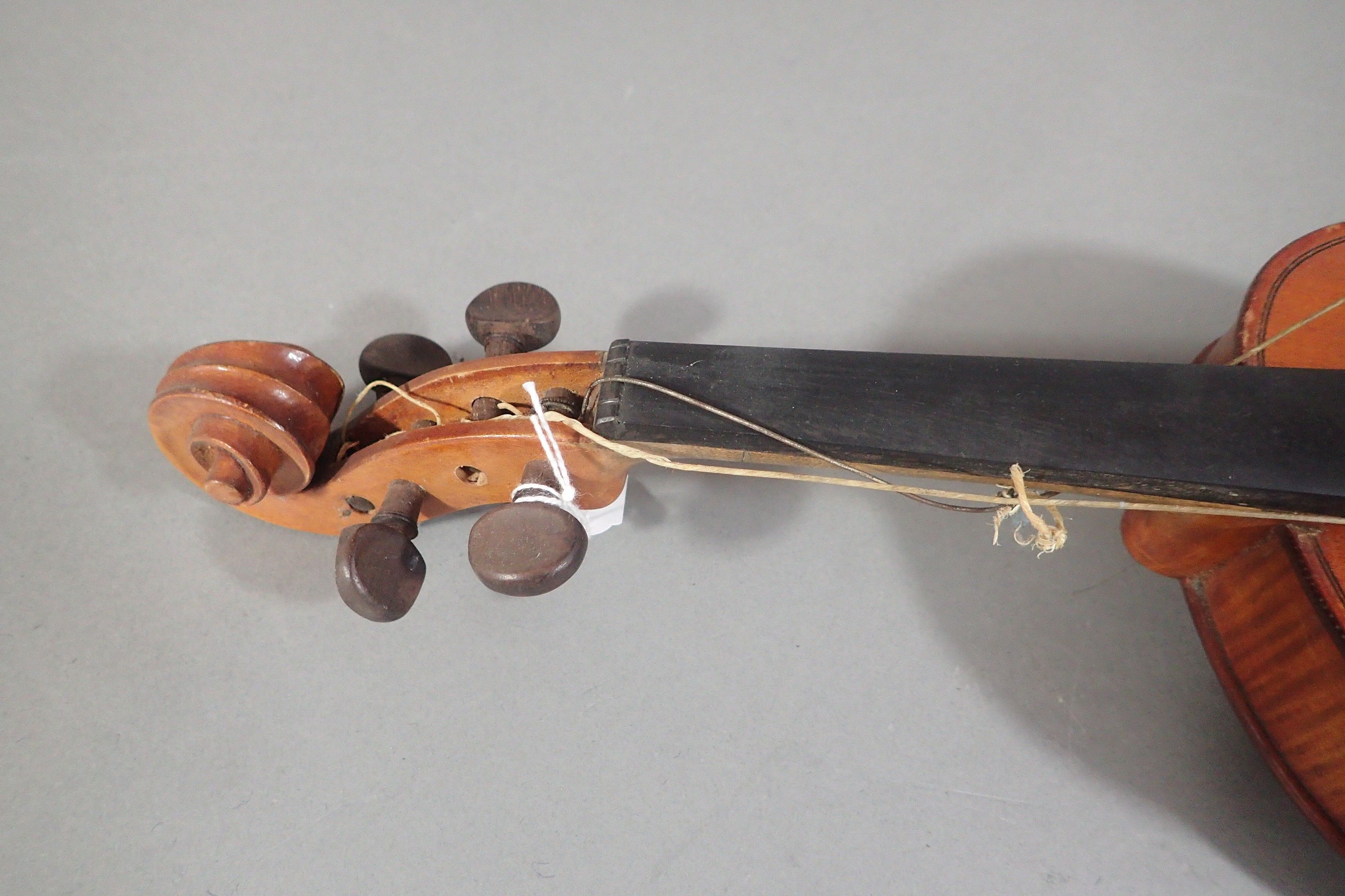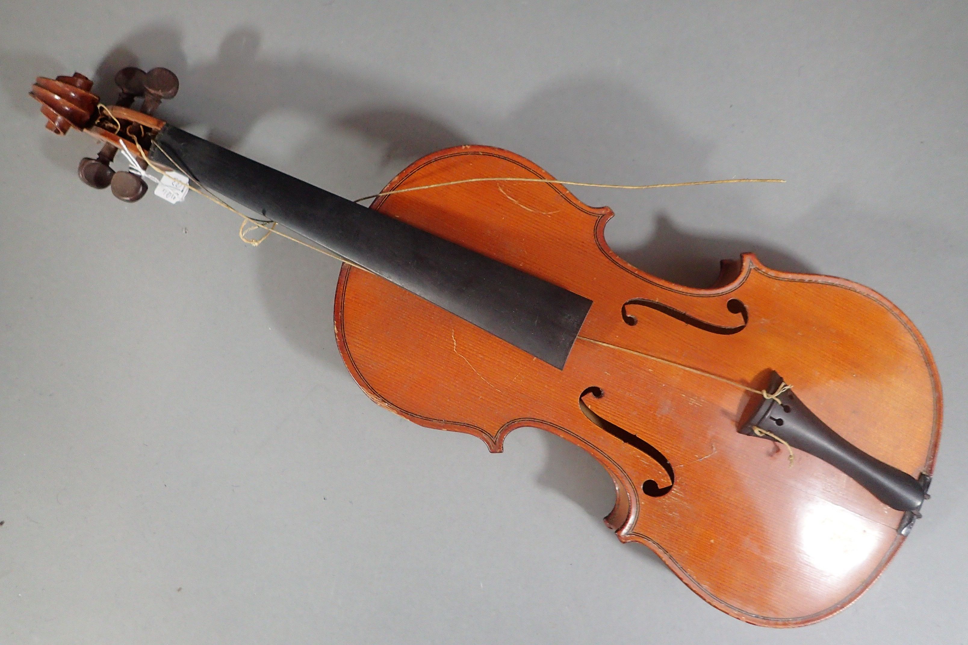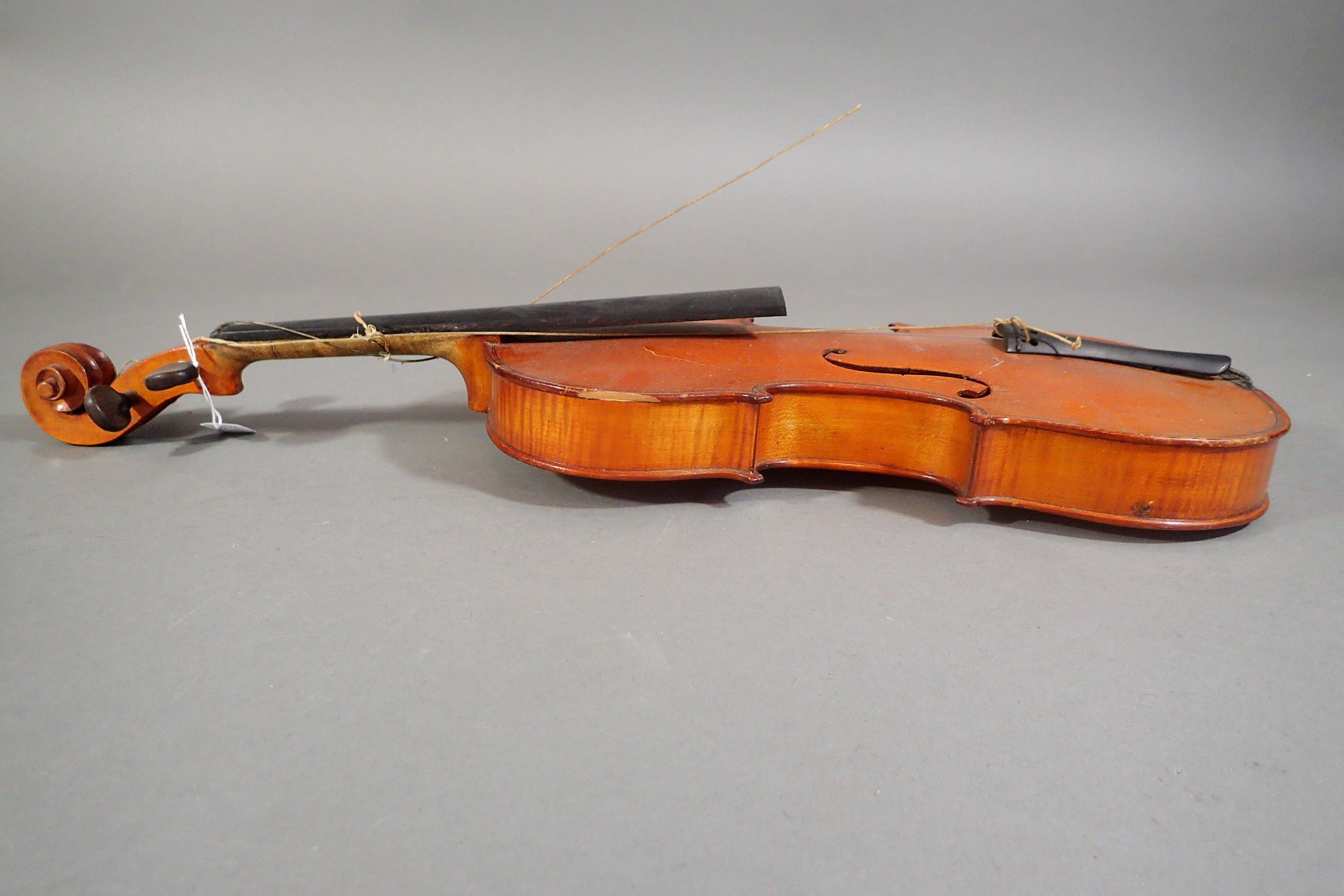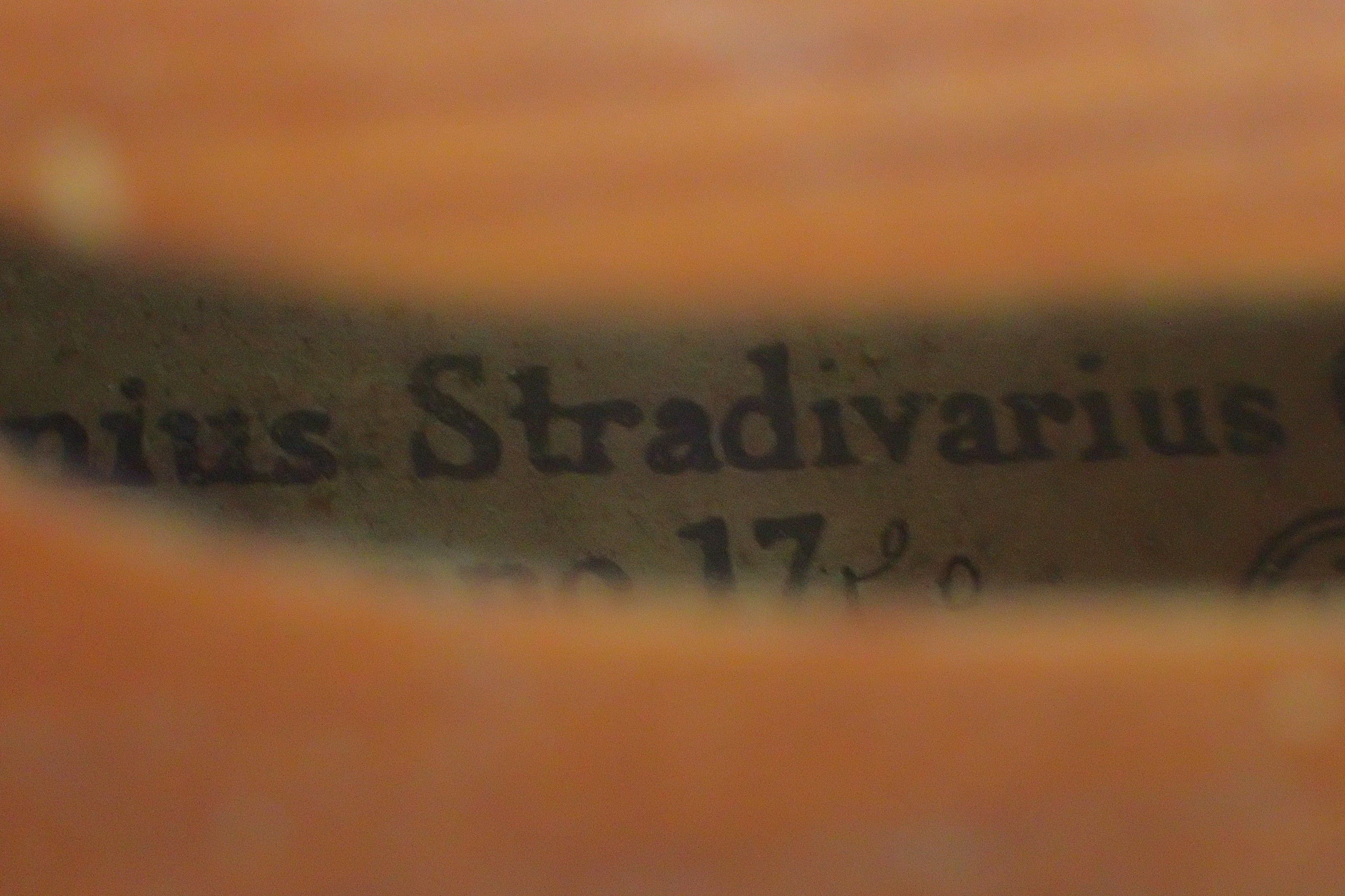 Violon (Long. : 339 mm) Dans son étui avec un archet (67 cm), étiquette "Antonius stradivarius Cremon en sis, faciebat anno 1720" (?). Mauvais état.