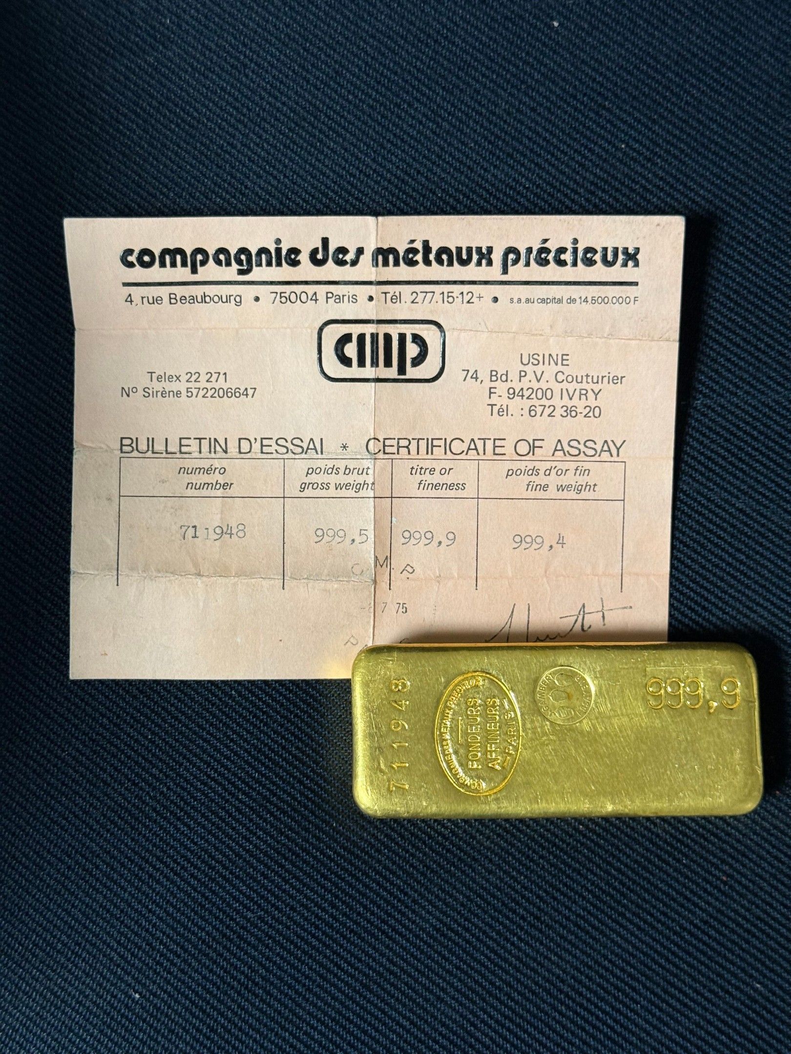 Bulletin d'essai : Compagnie des Métaux Précieux