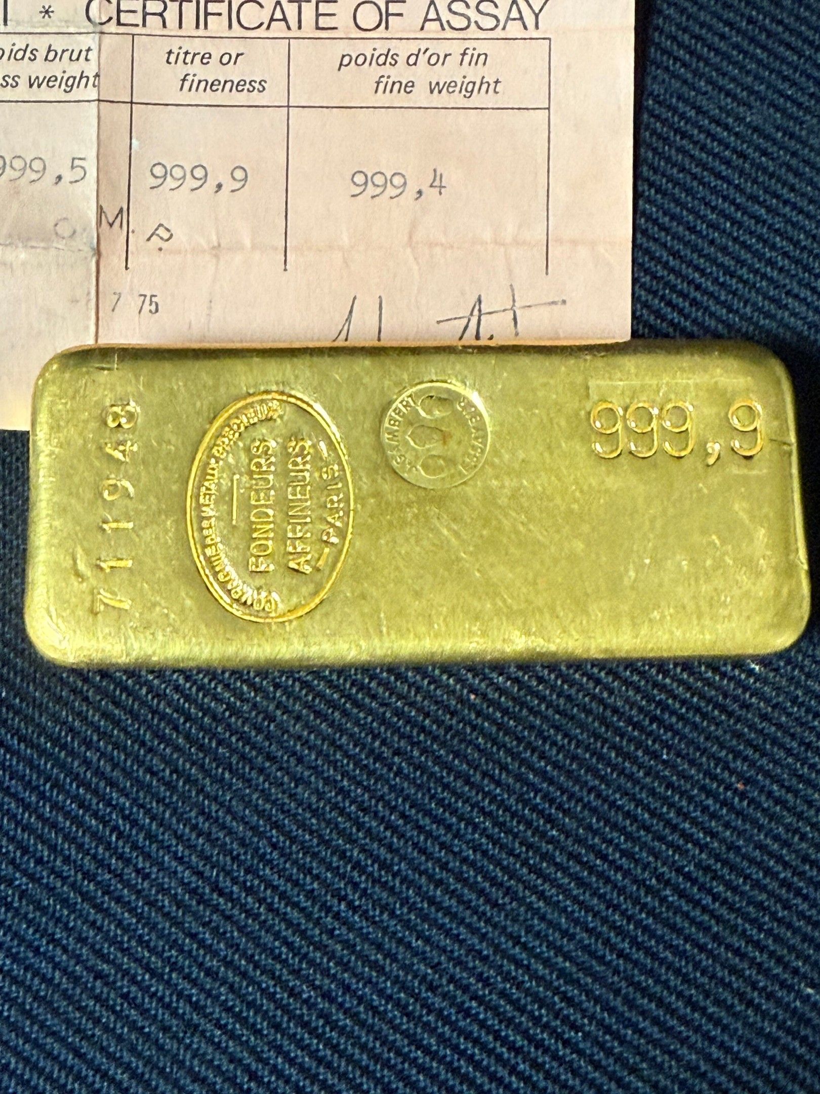 PAS DE LIVE Lingot d'or, numéroté 711948.