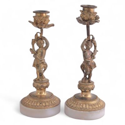 Paire de FLAMBEAUX en bronze doré figurant chacun en putti t…