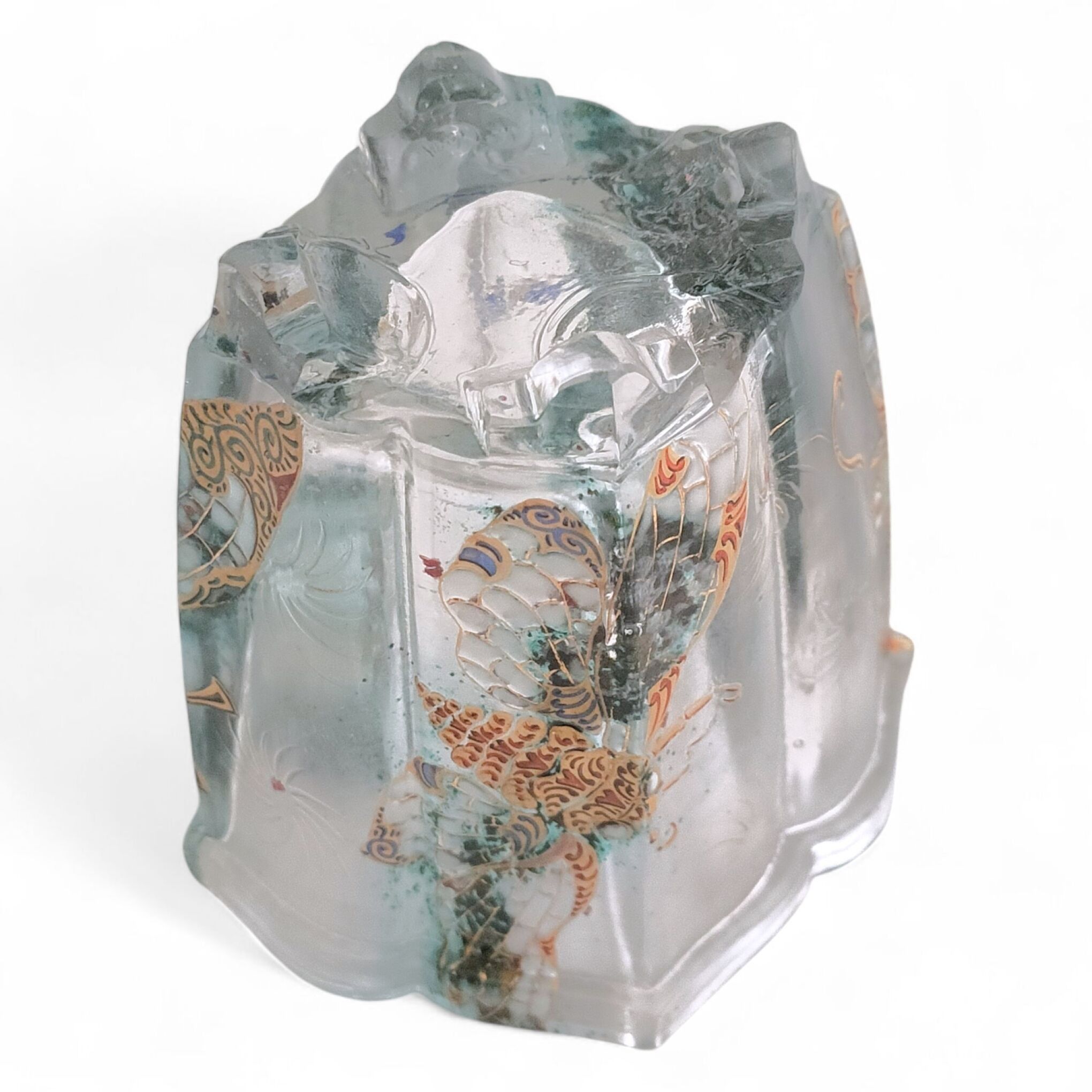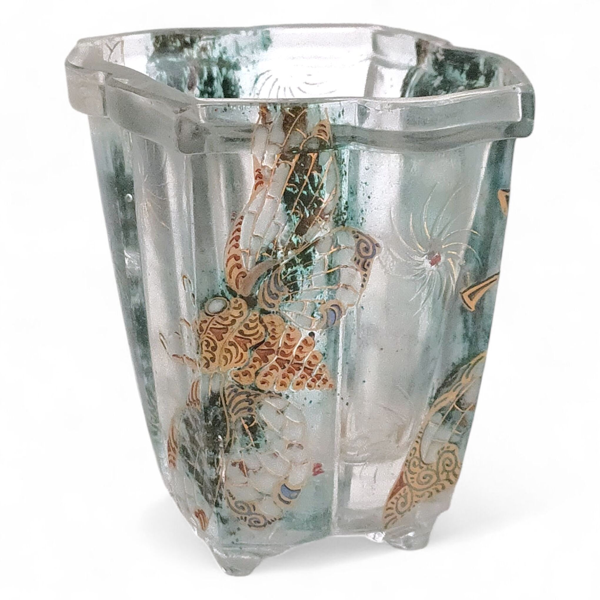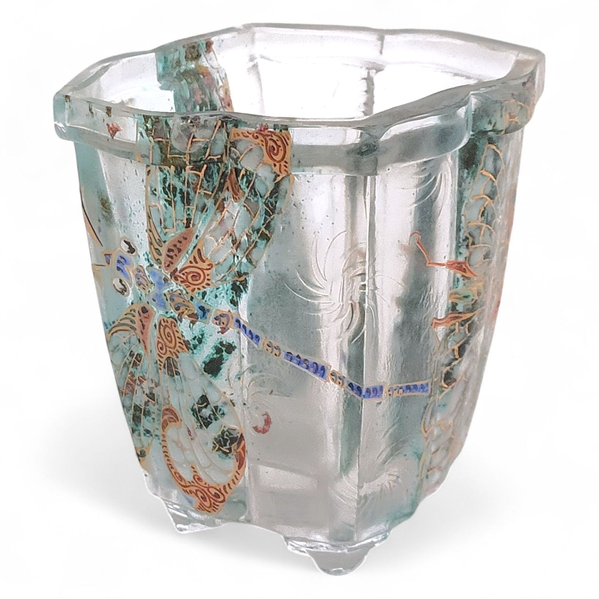 Petit vase polylobé de forme ourlée, à l'imitation du quartz et de ses salissures. D'un côté une libellule et de l'autre une cigale. Le décor émaillé à chaud jouit d'une façon absolue avec les salissures, oxydes et bulles emprisonnées dans le verre.