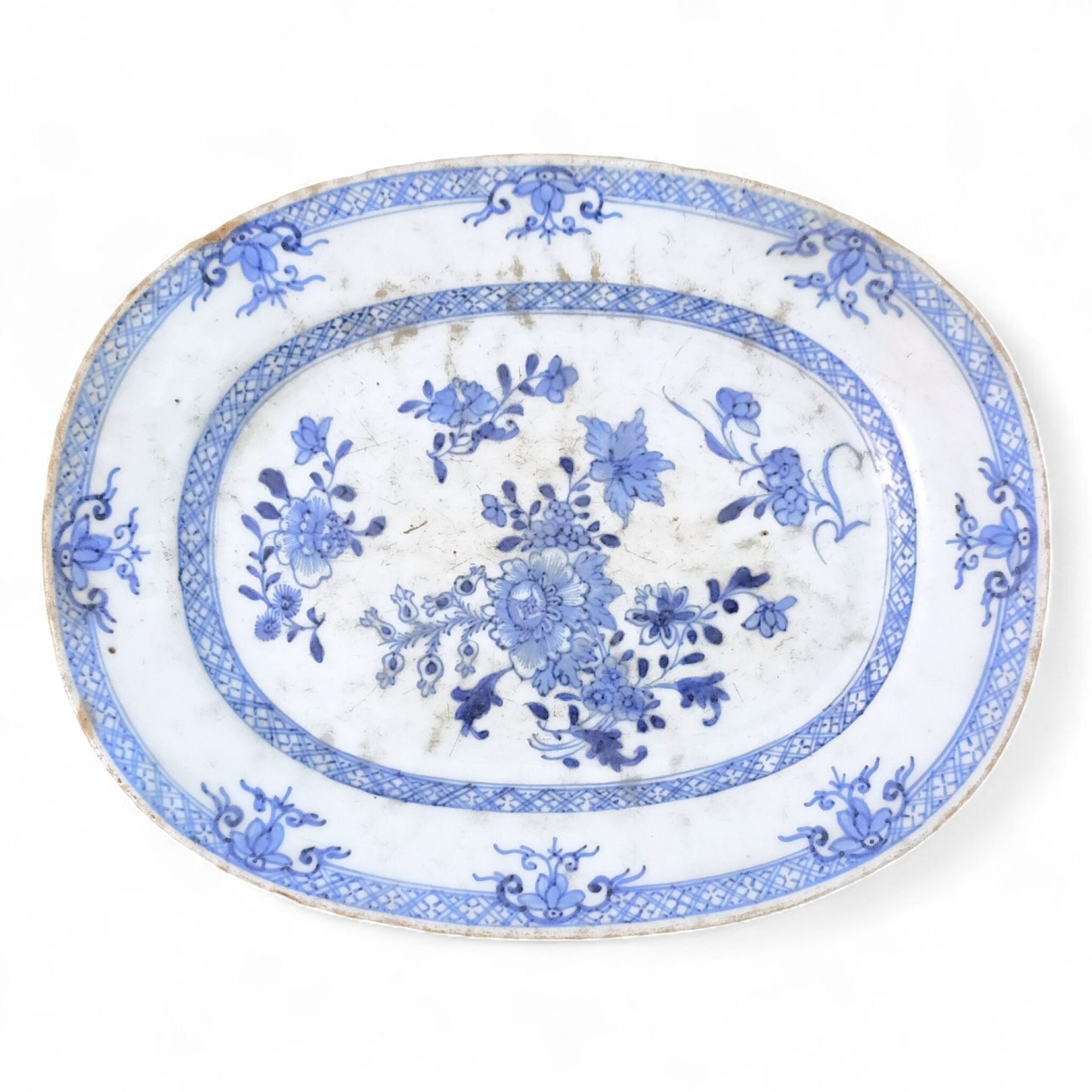 CHINE Plat ovale en porcelaine à décor bleu blanc de fleurs XVIIIème 26.8 x 21 cm (égrenures)