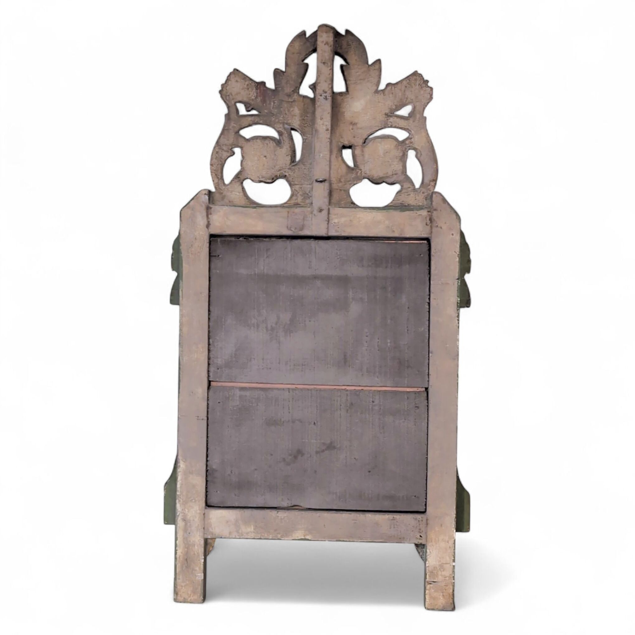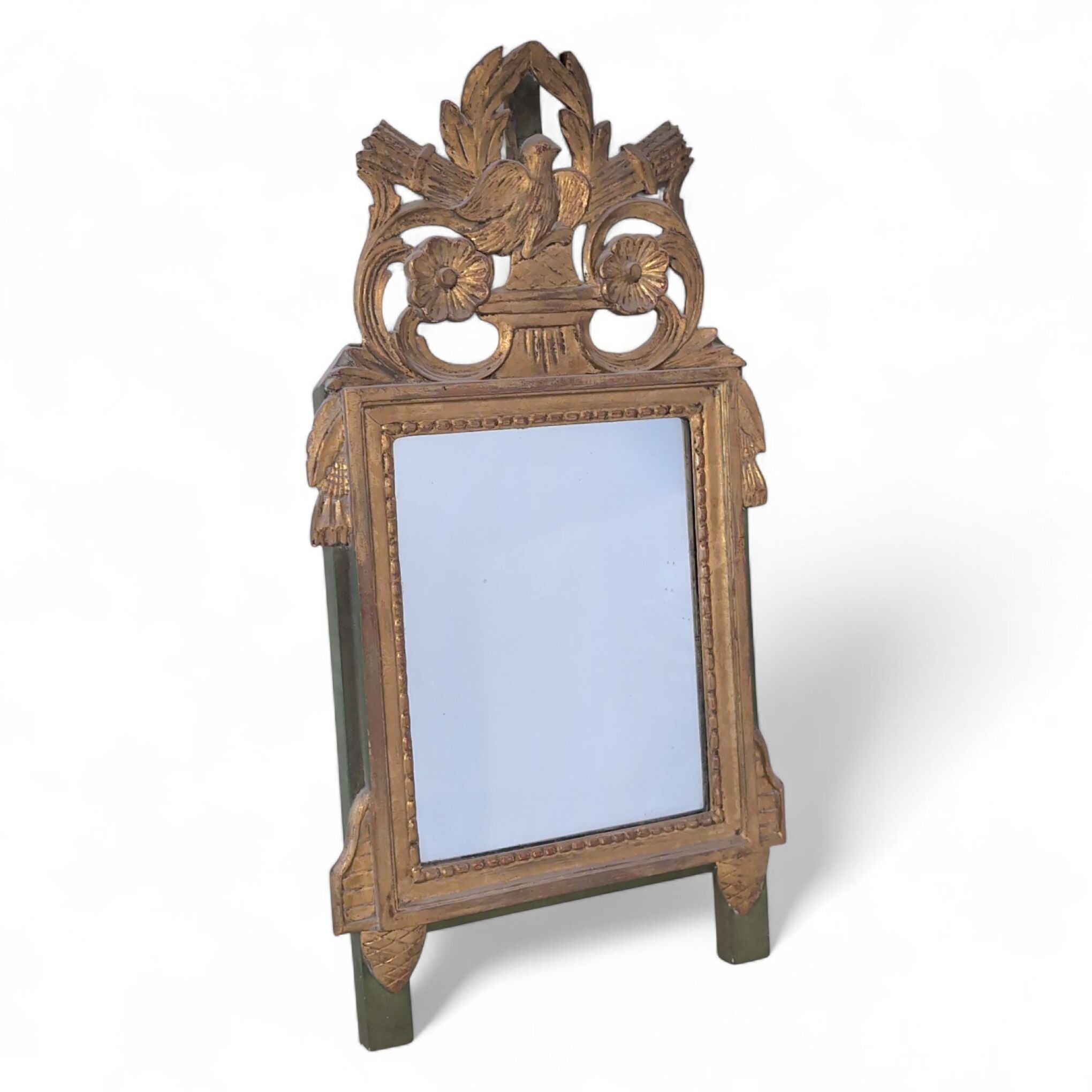 MIROIR à fronton en bois sculpté, mouluré, peint et doré, à décor d'une colombe, carquois, fleurs, couronne de laurier