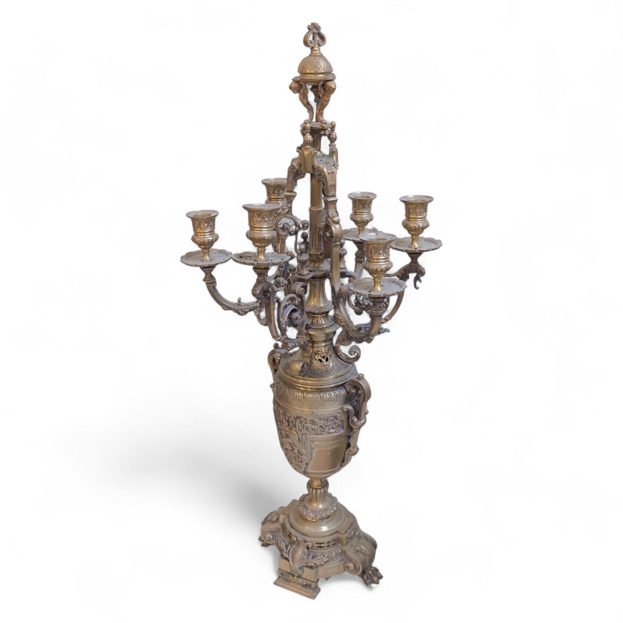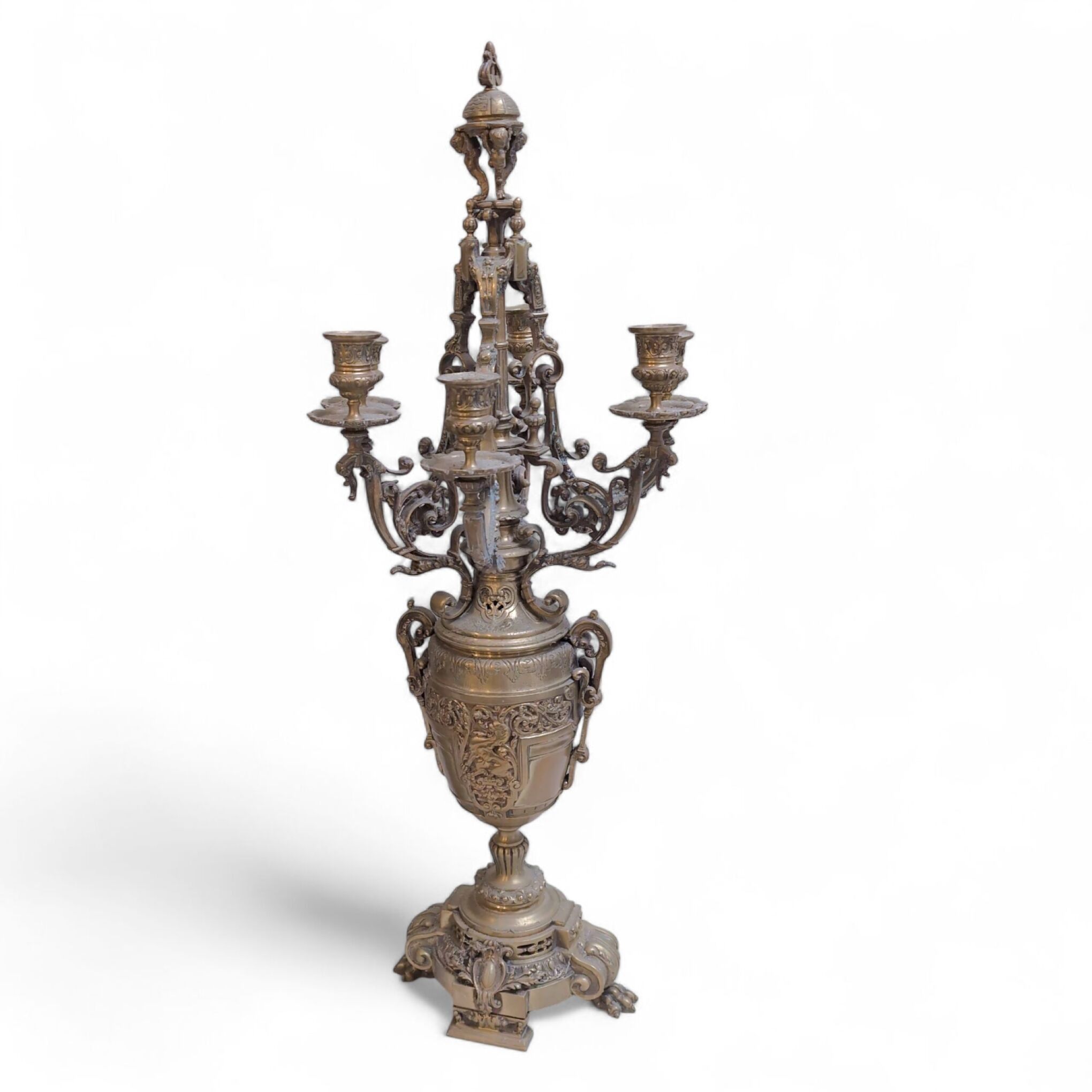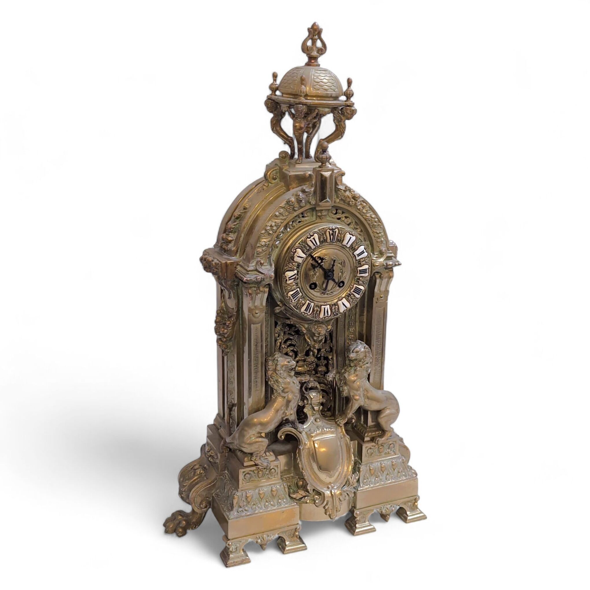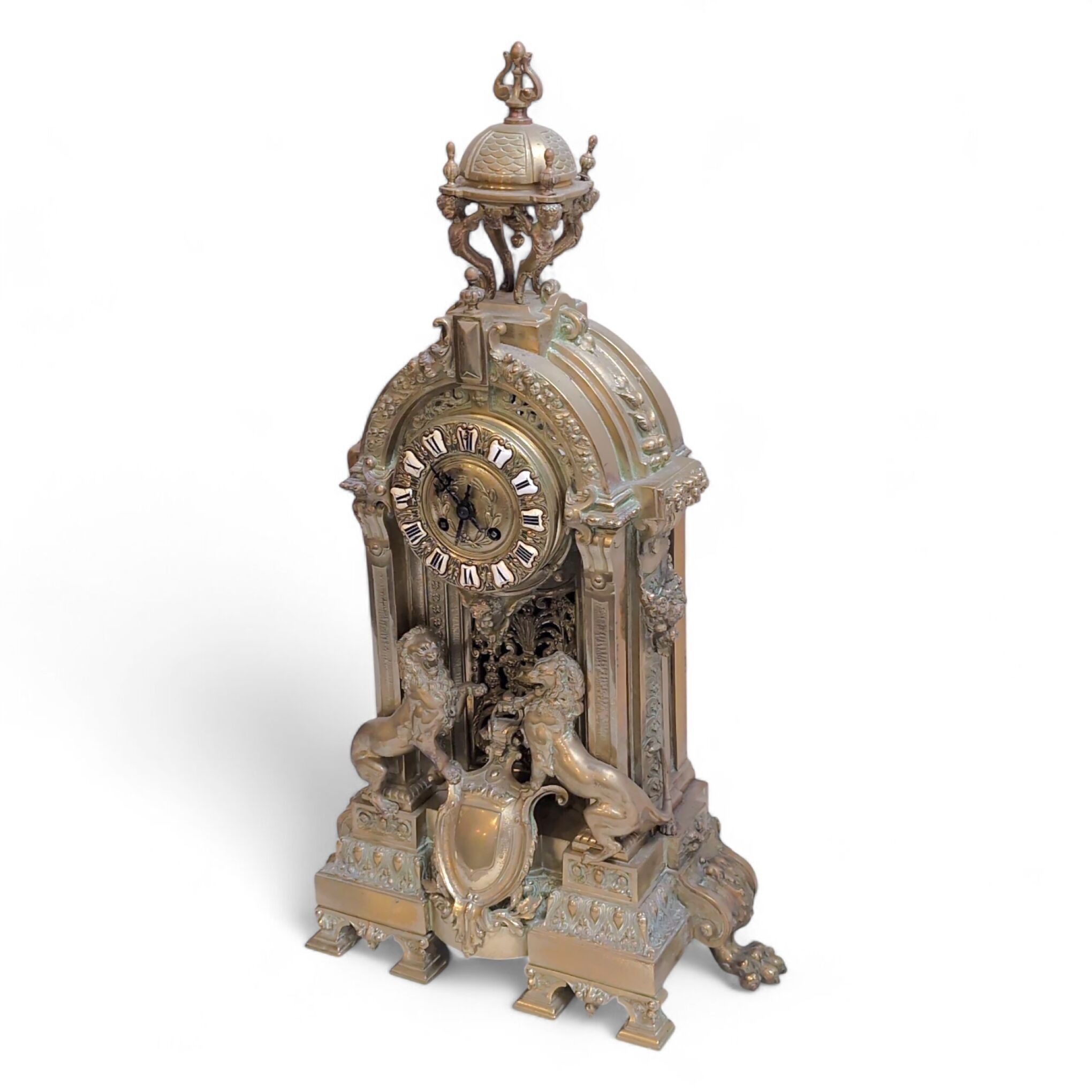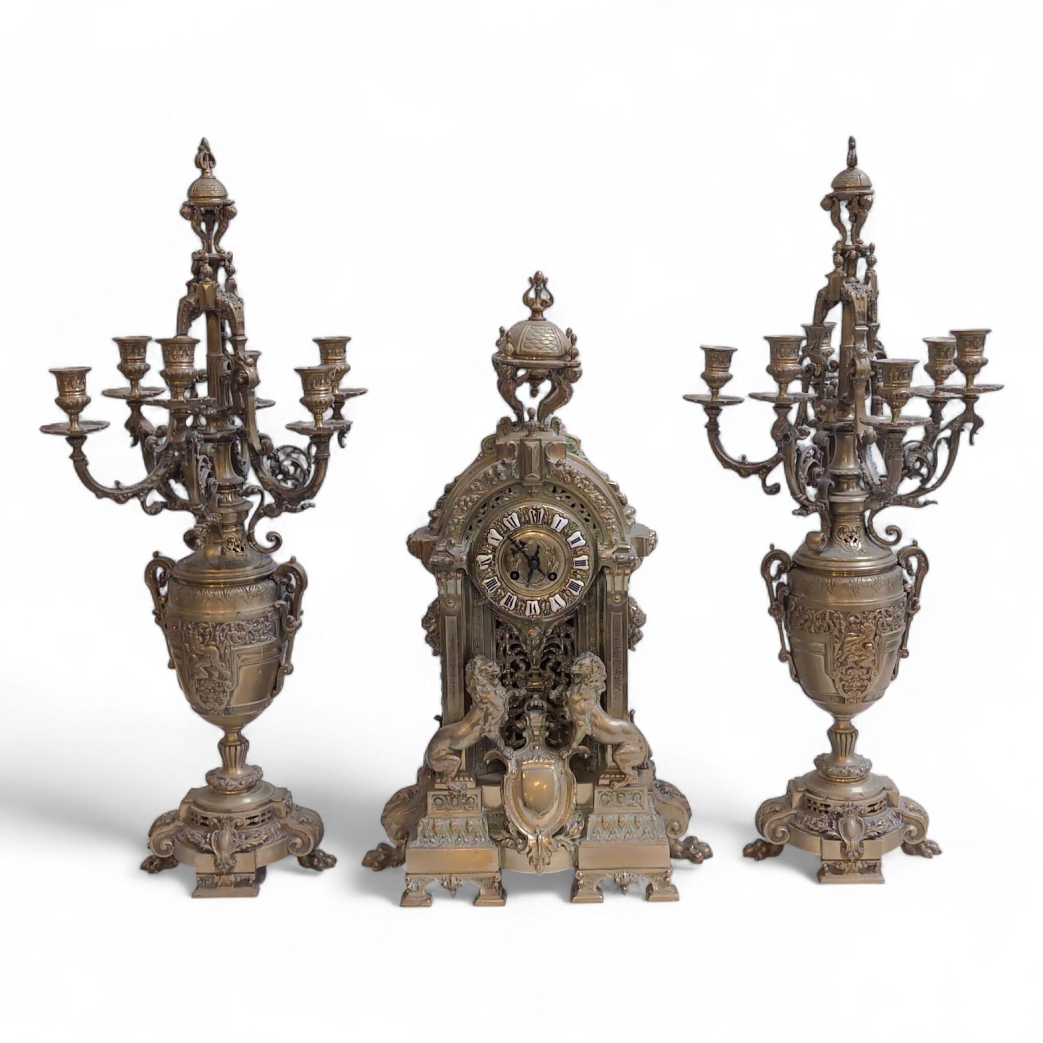 GARNITURE DE CHEMINEE en bronze à décor de deux lions encadrant un blason, feuillage, fleurs, guirlandes, frises, pattes de lion, vases, comprenant une pendule et une paire de candélabres à six bras de lumière