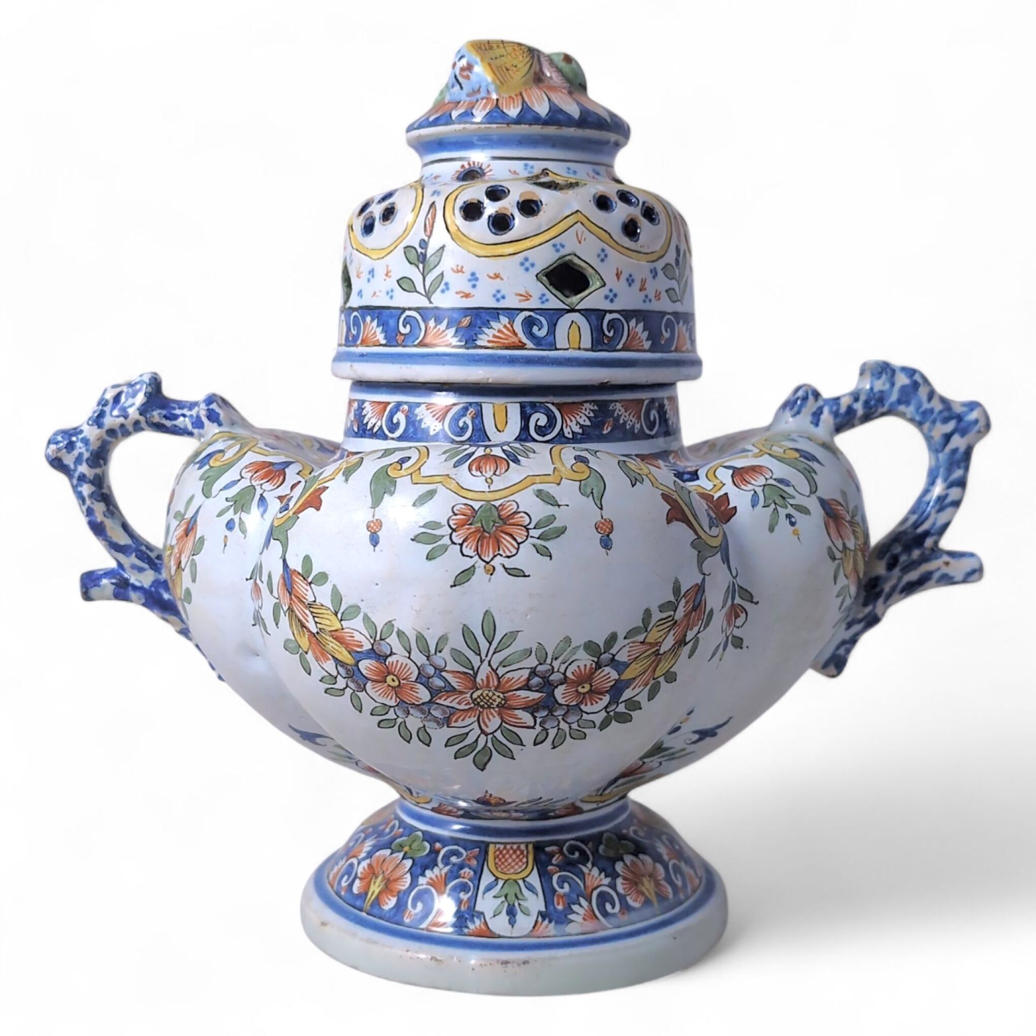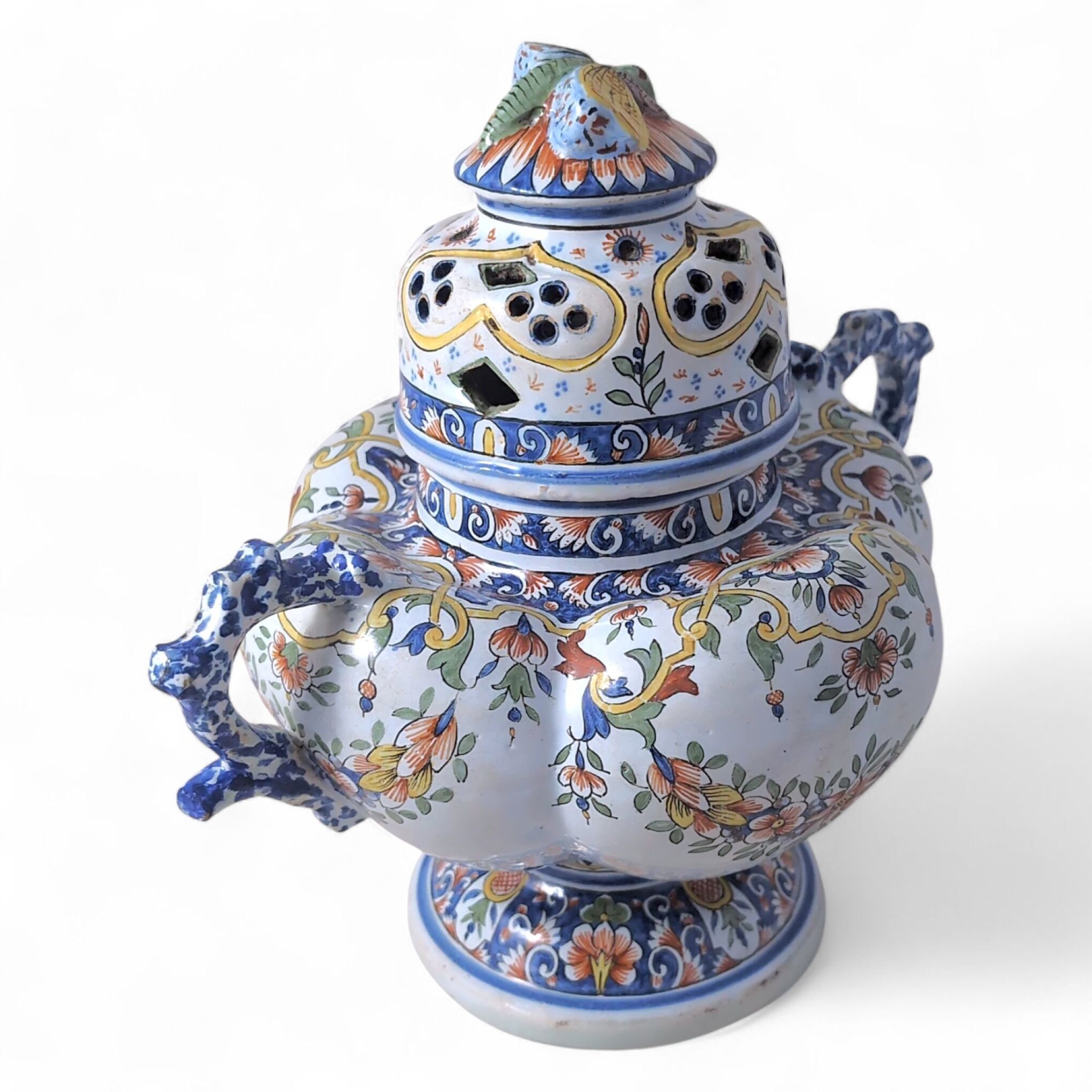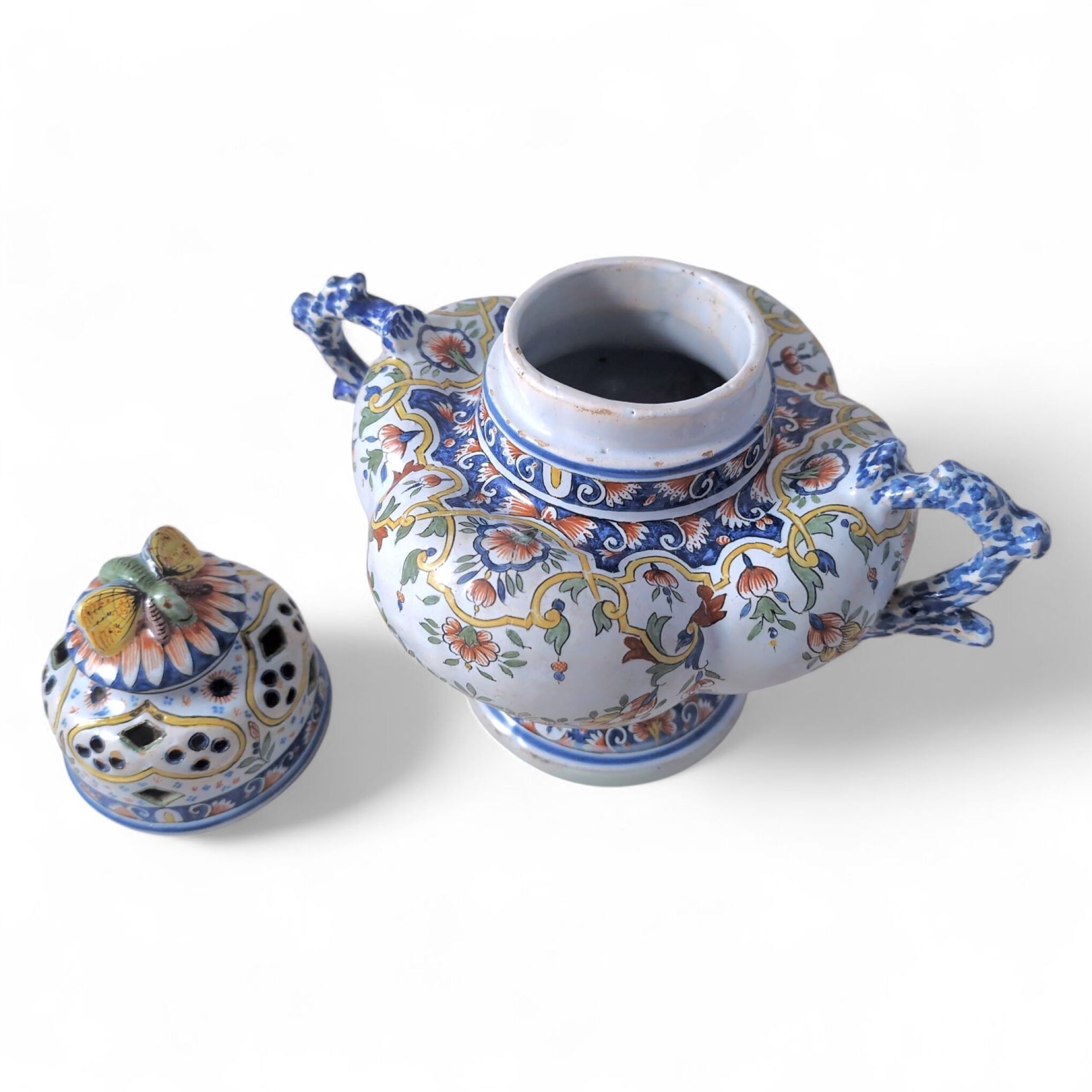 Pot pourri à décor de Rouen couvercle surmonté d'une fleur et d'un insecte, marqué « PB »