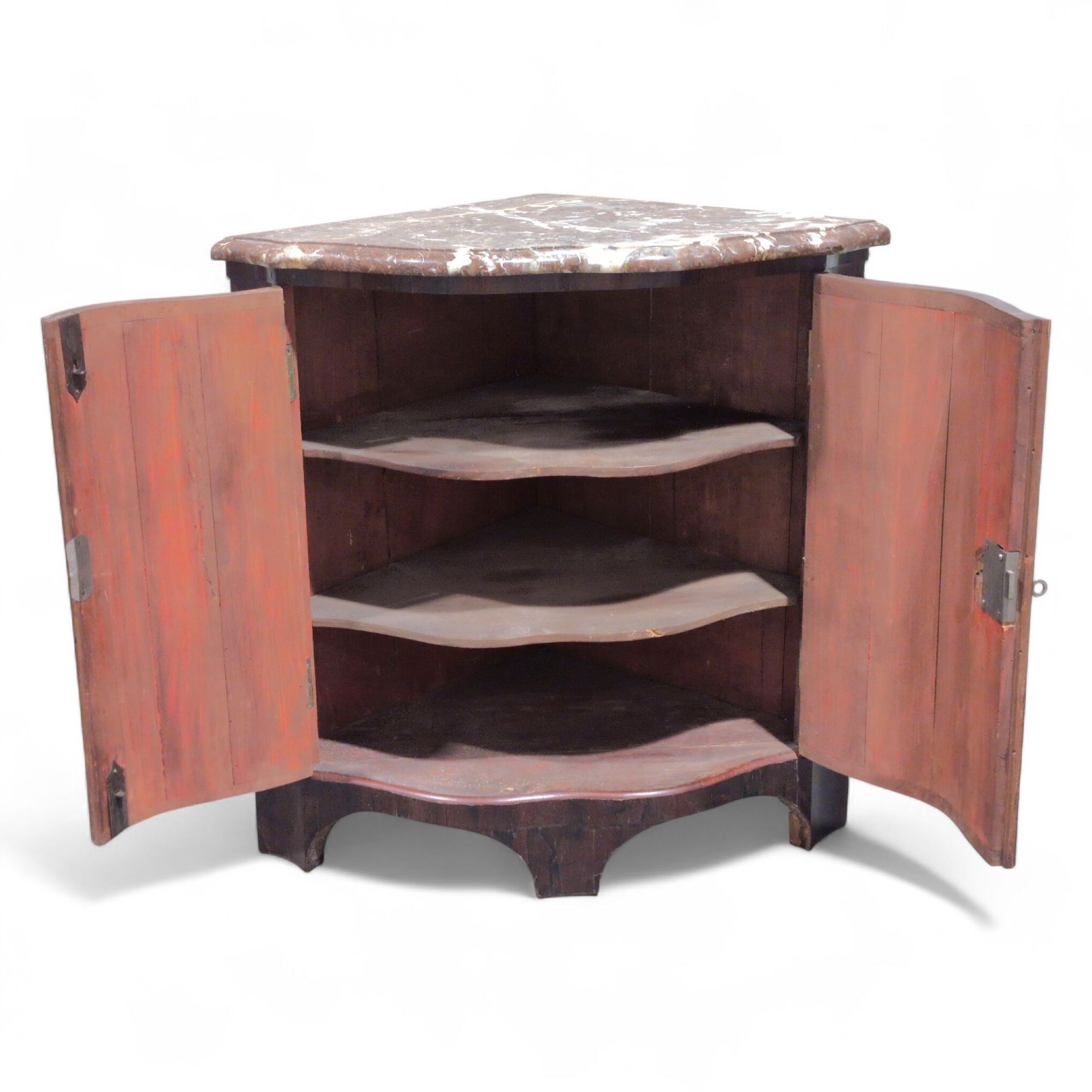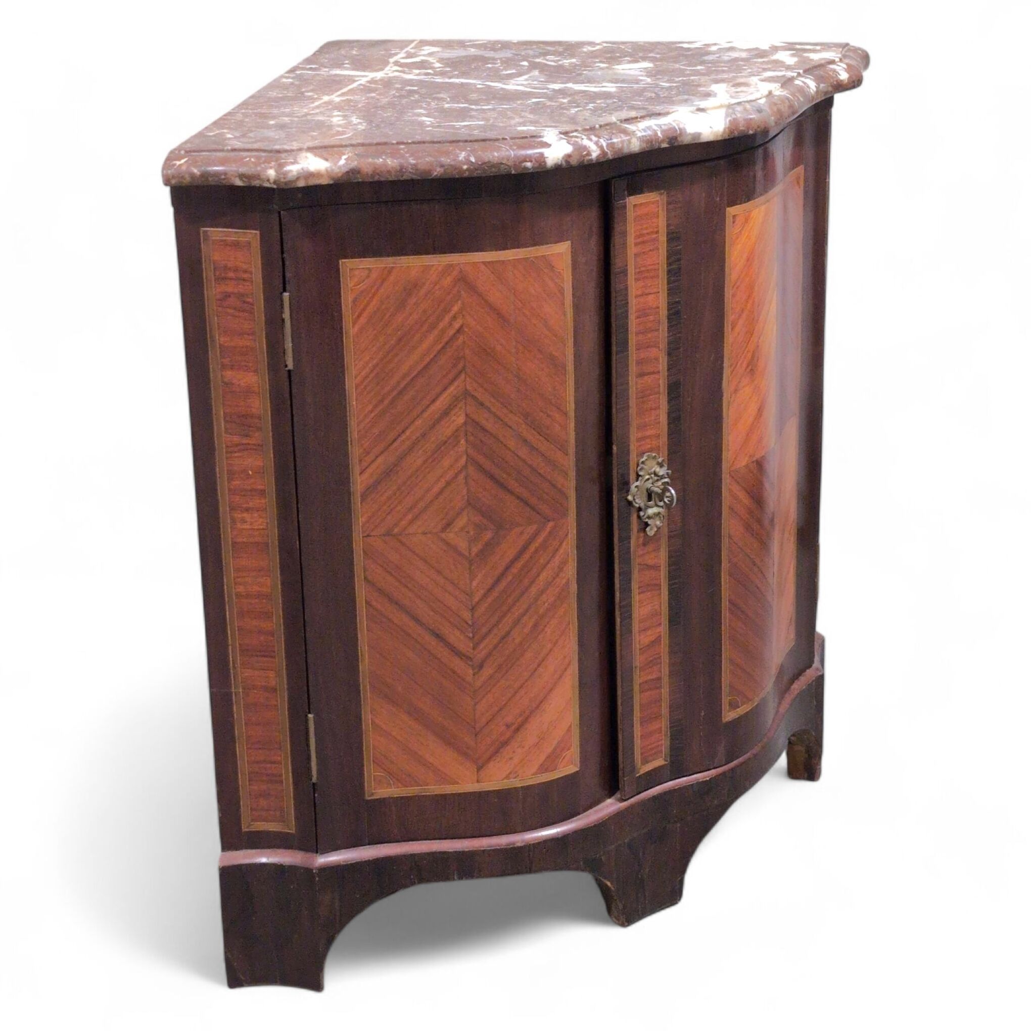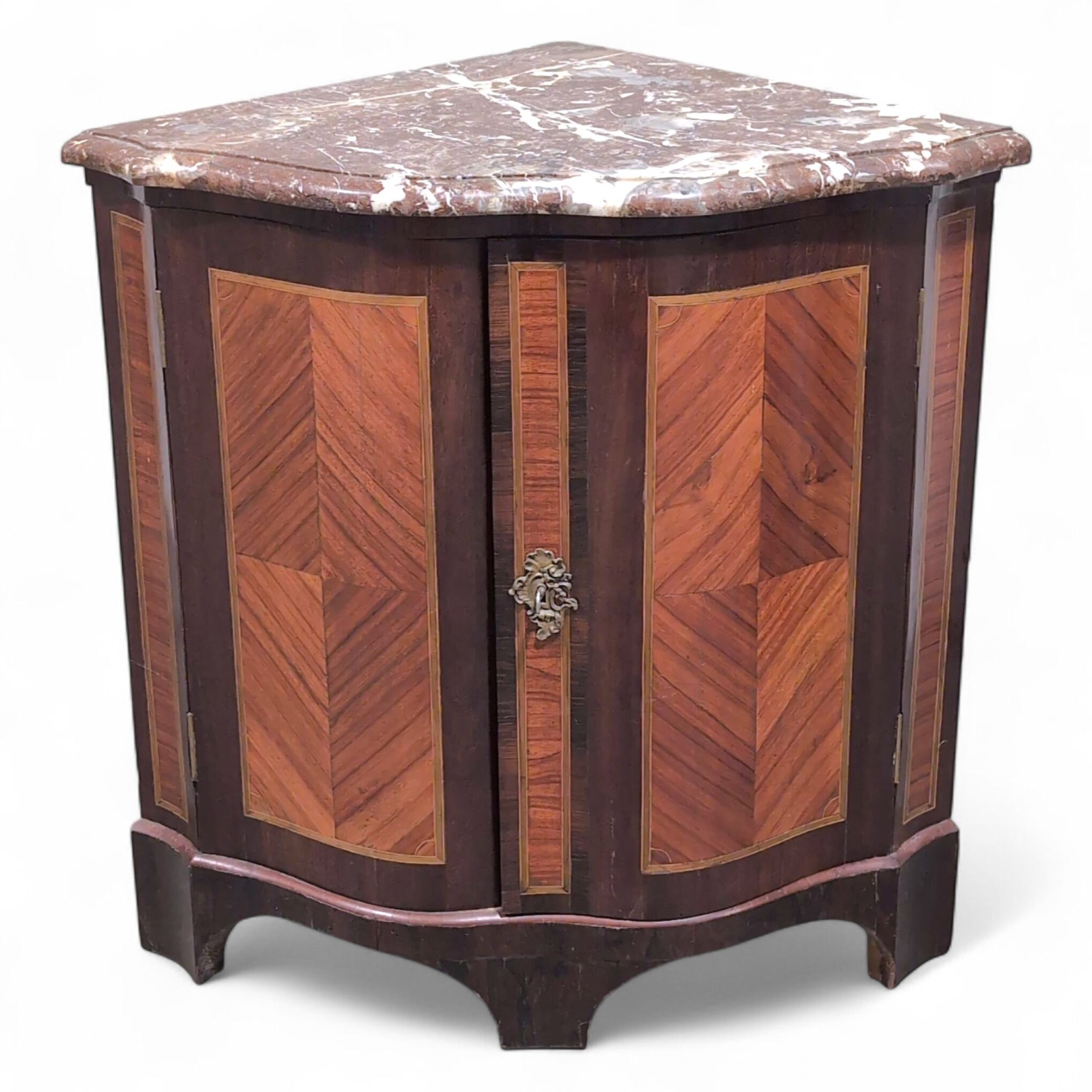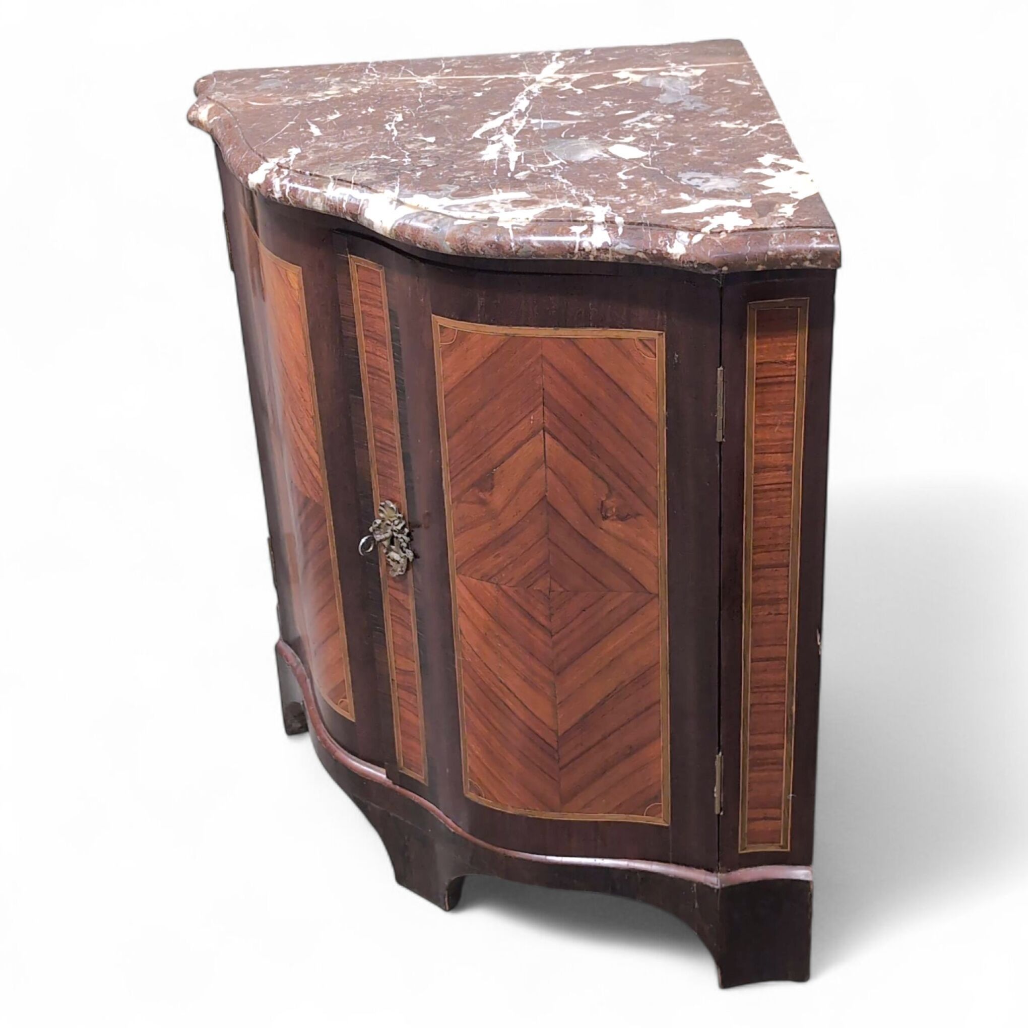 ENCOIGNURE en bois de placage, la façade galbée ouvrant à deux portes, dessus de marbre XVIIIème H.: 83 cm P.: 60 cm