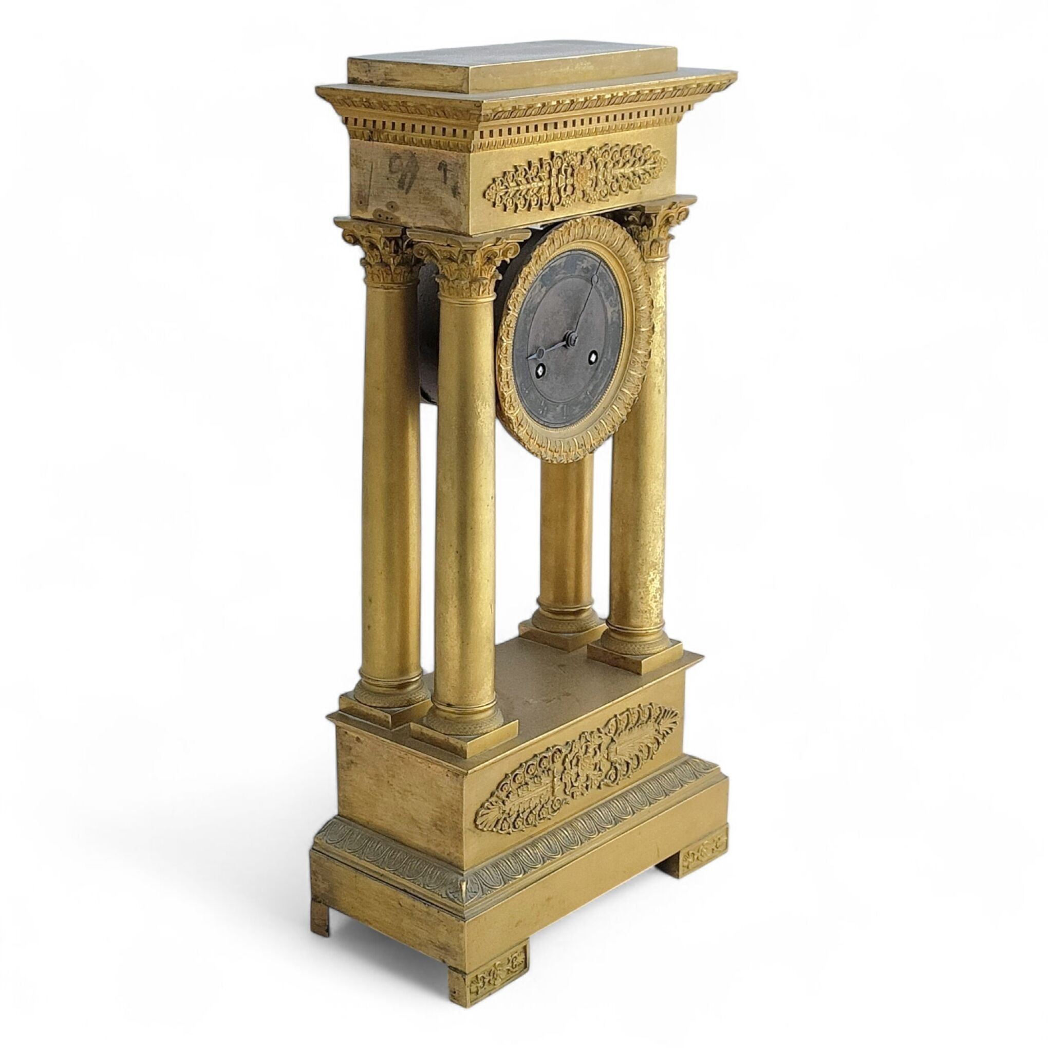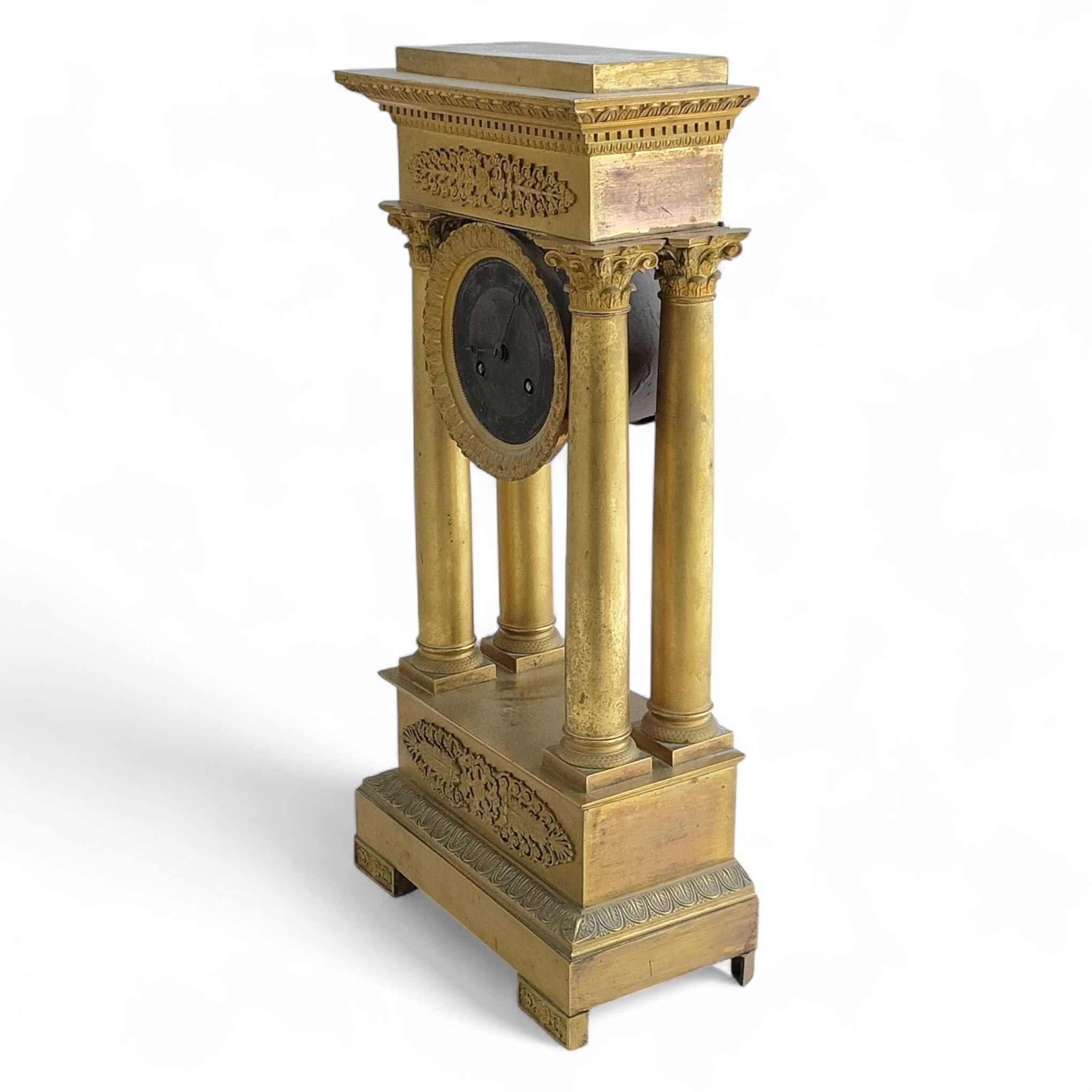 PENDULE A COLONNES en bronze doré à décor de chapiteaux corinthiens, frises, palmettes, le cadran signé Badier Hger à Paris