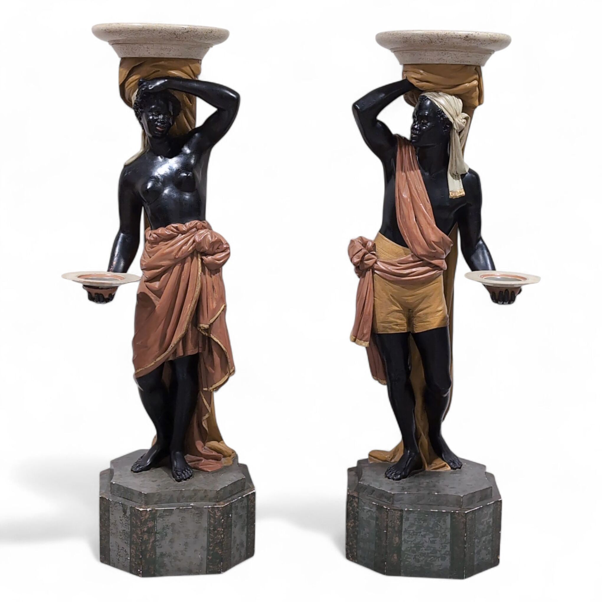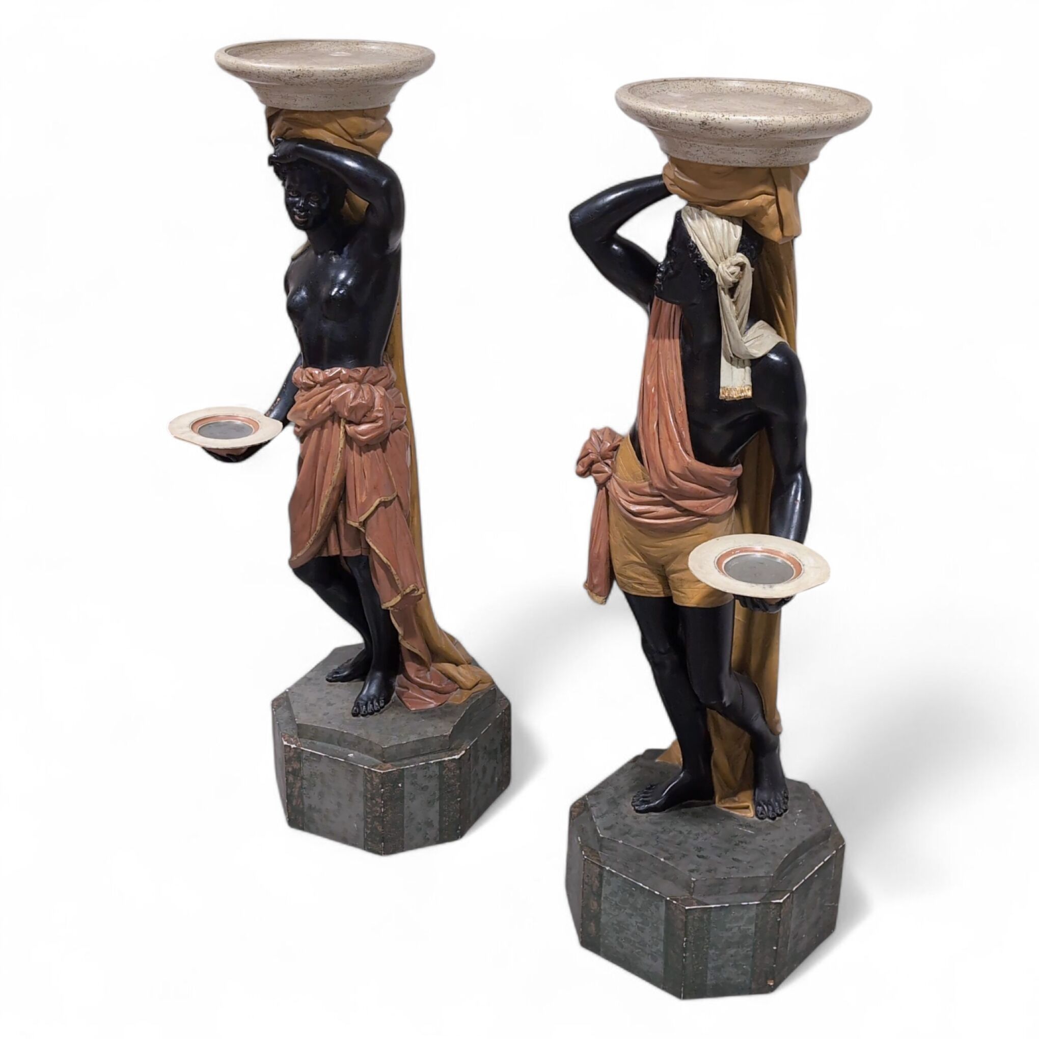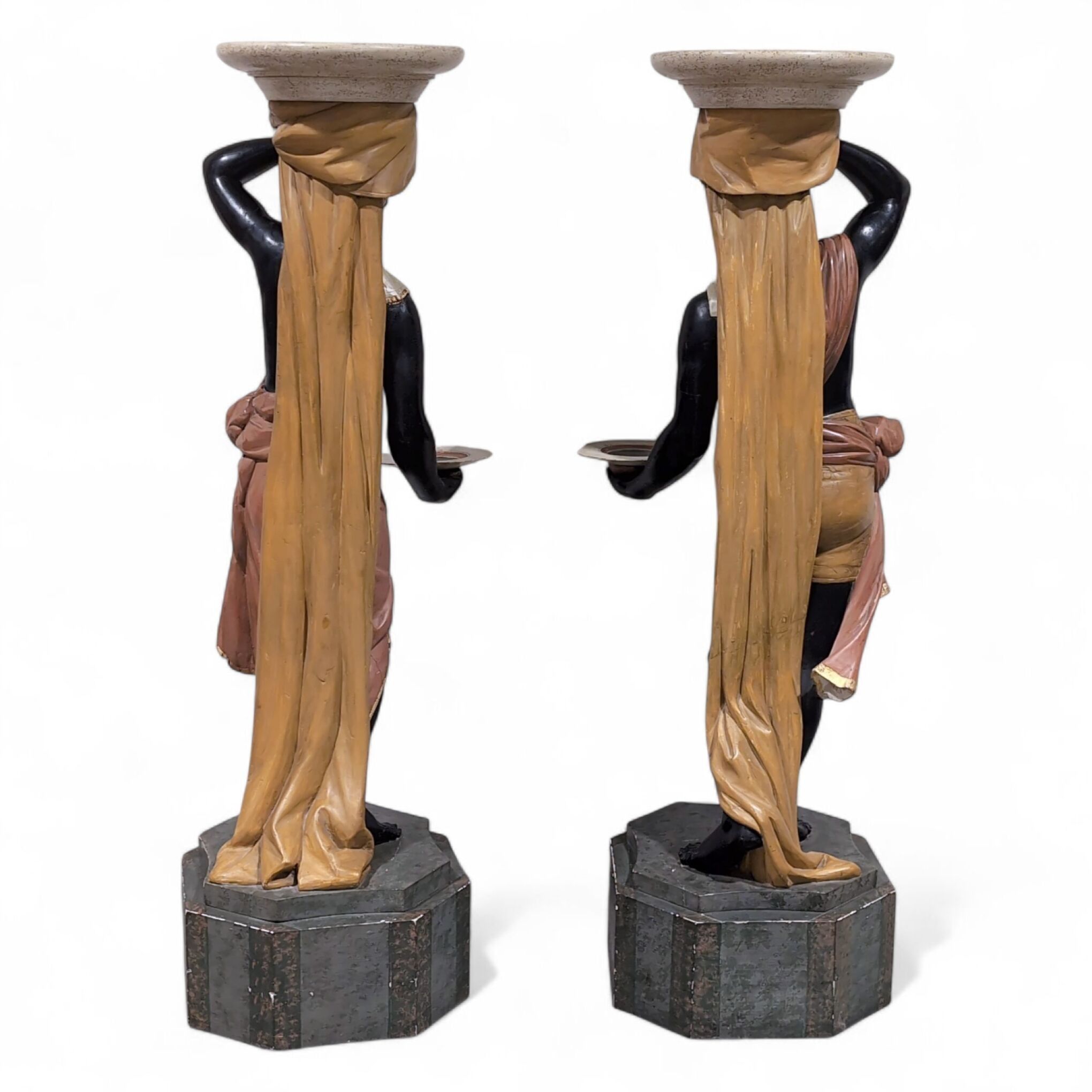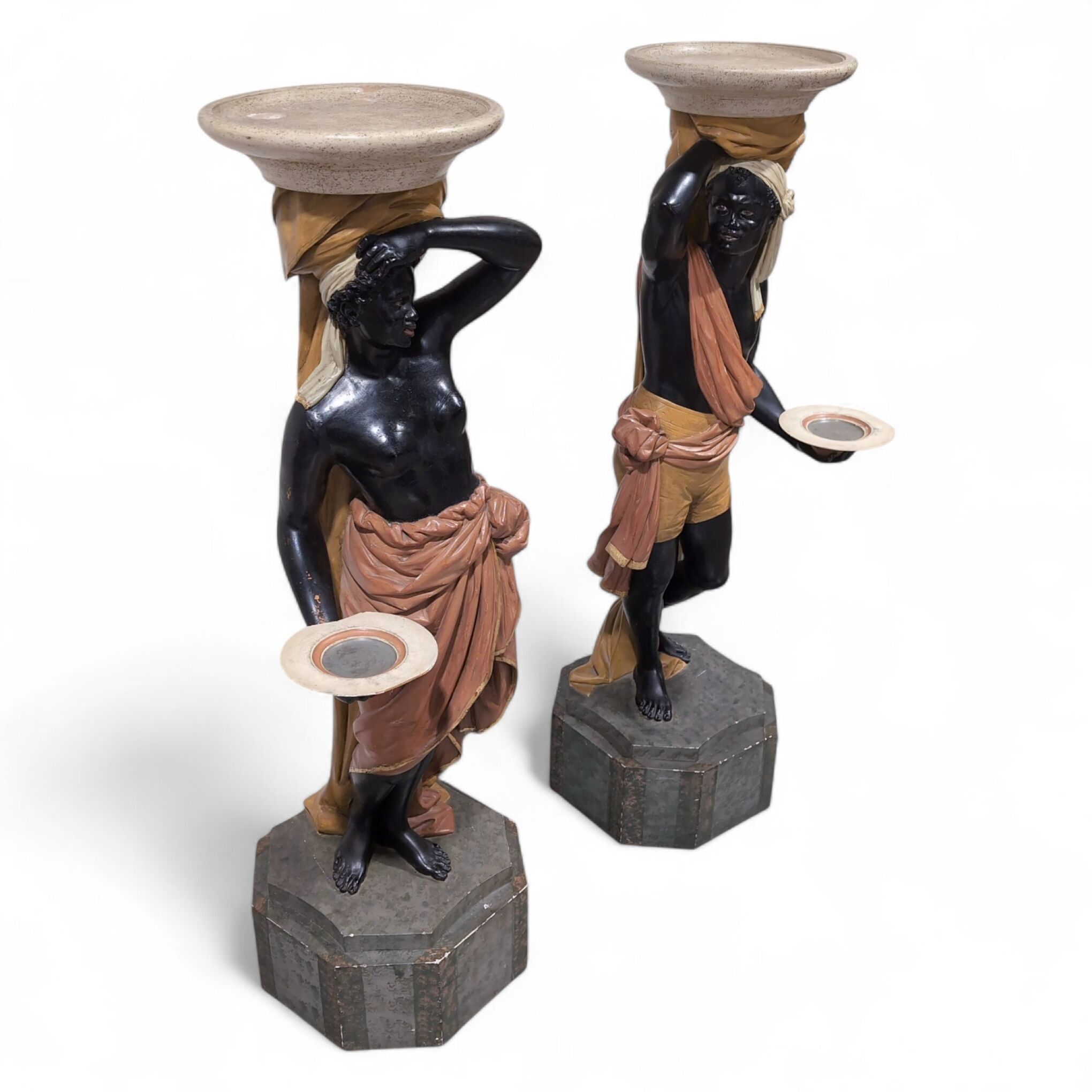 Paire de PRESENTOIRS en bois sculpté et peint figurant des nubiens drapés