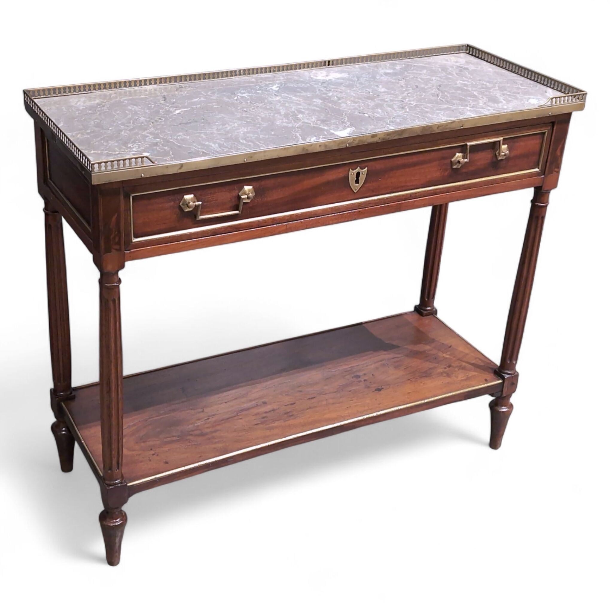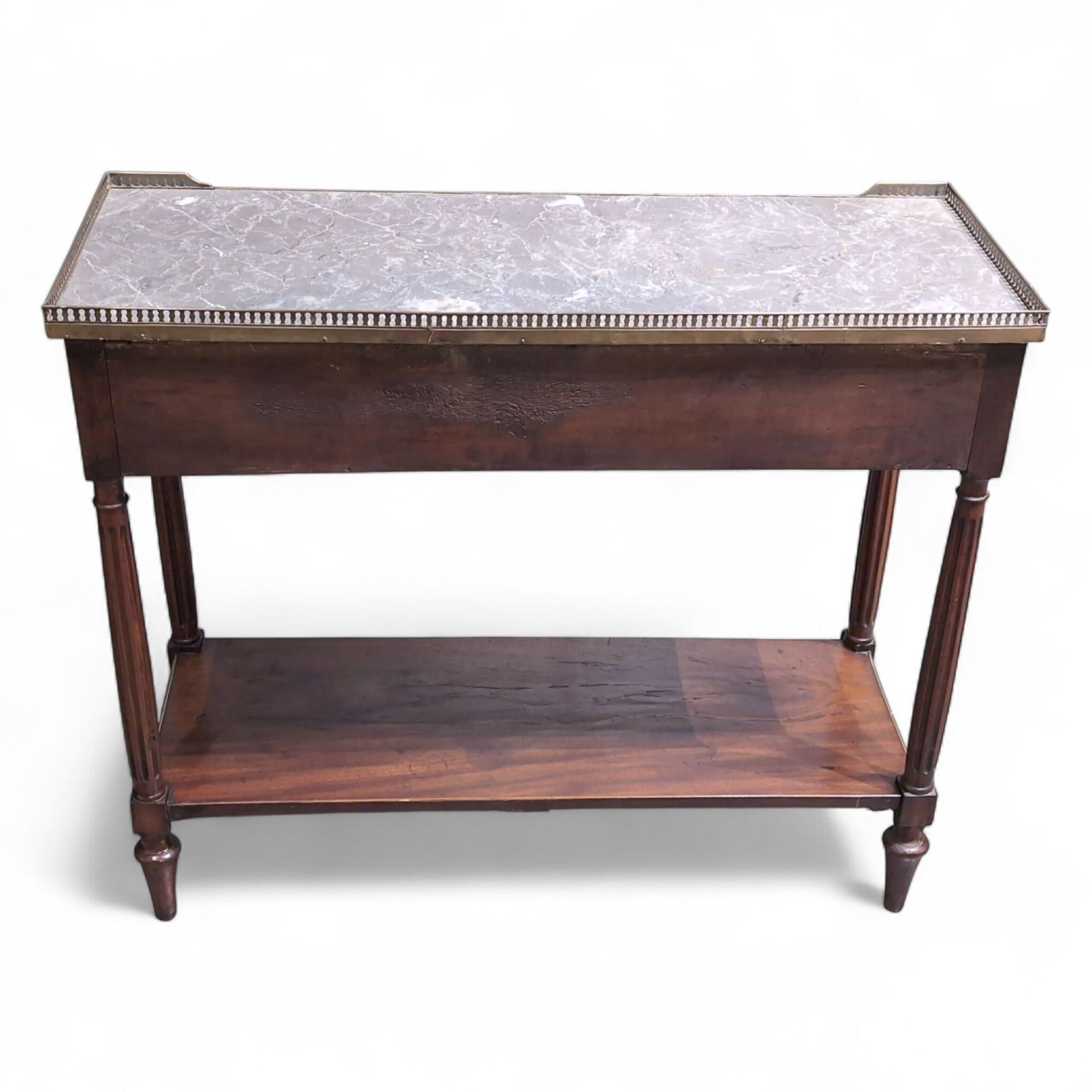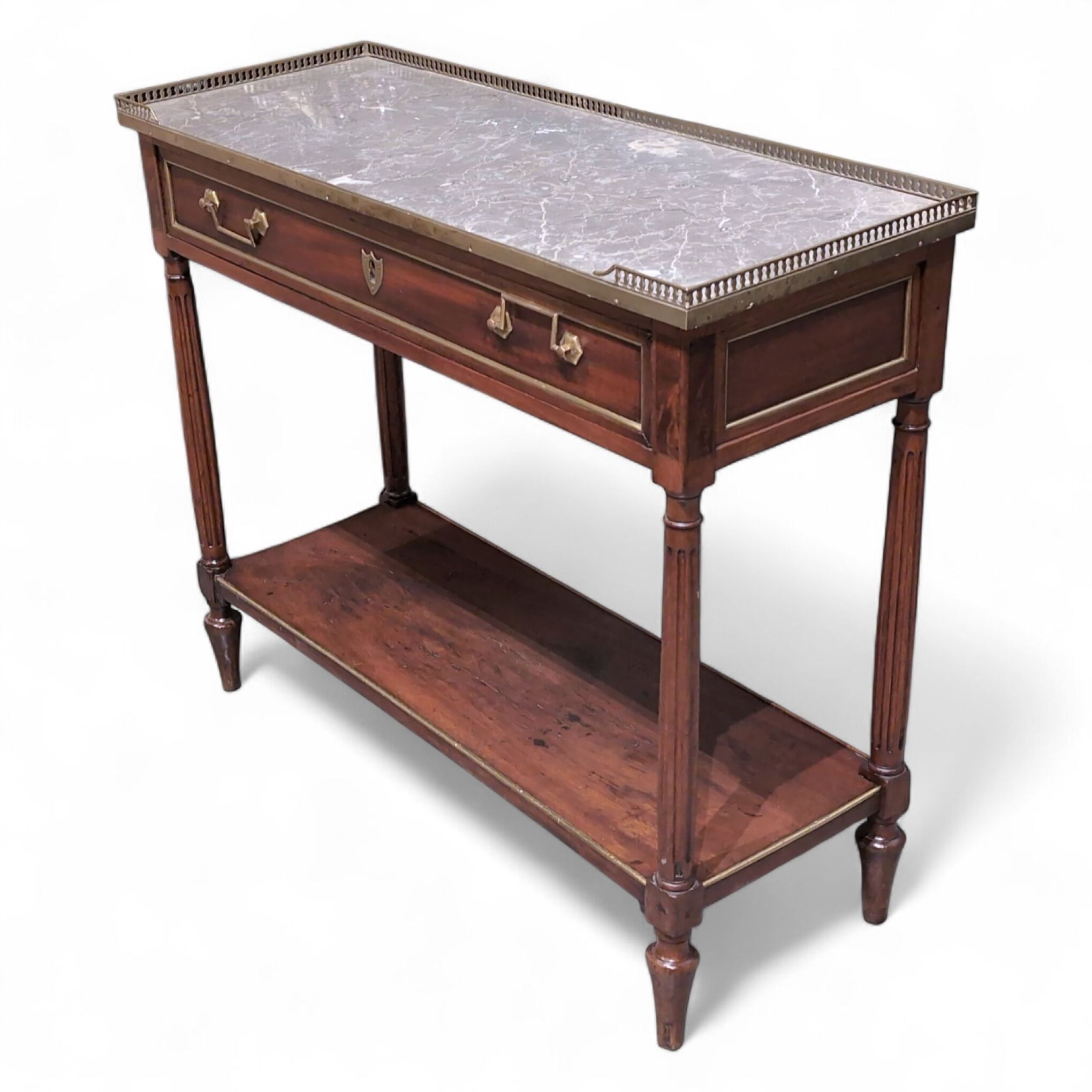 CONSOLE en acajou sculpté et mouluré, ouvrant à un tiroir en ceinture, les montants à colonnes cannelés, dessus de marbre à galerie