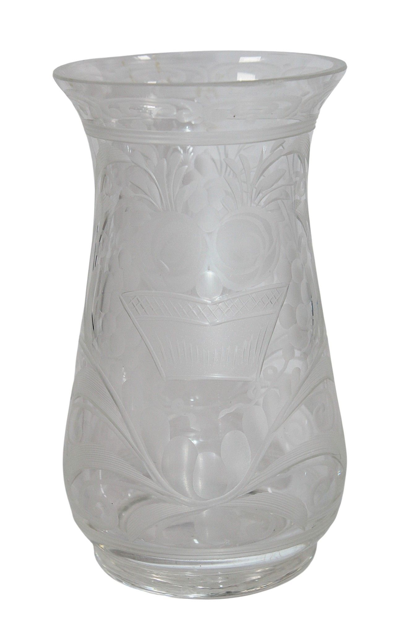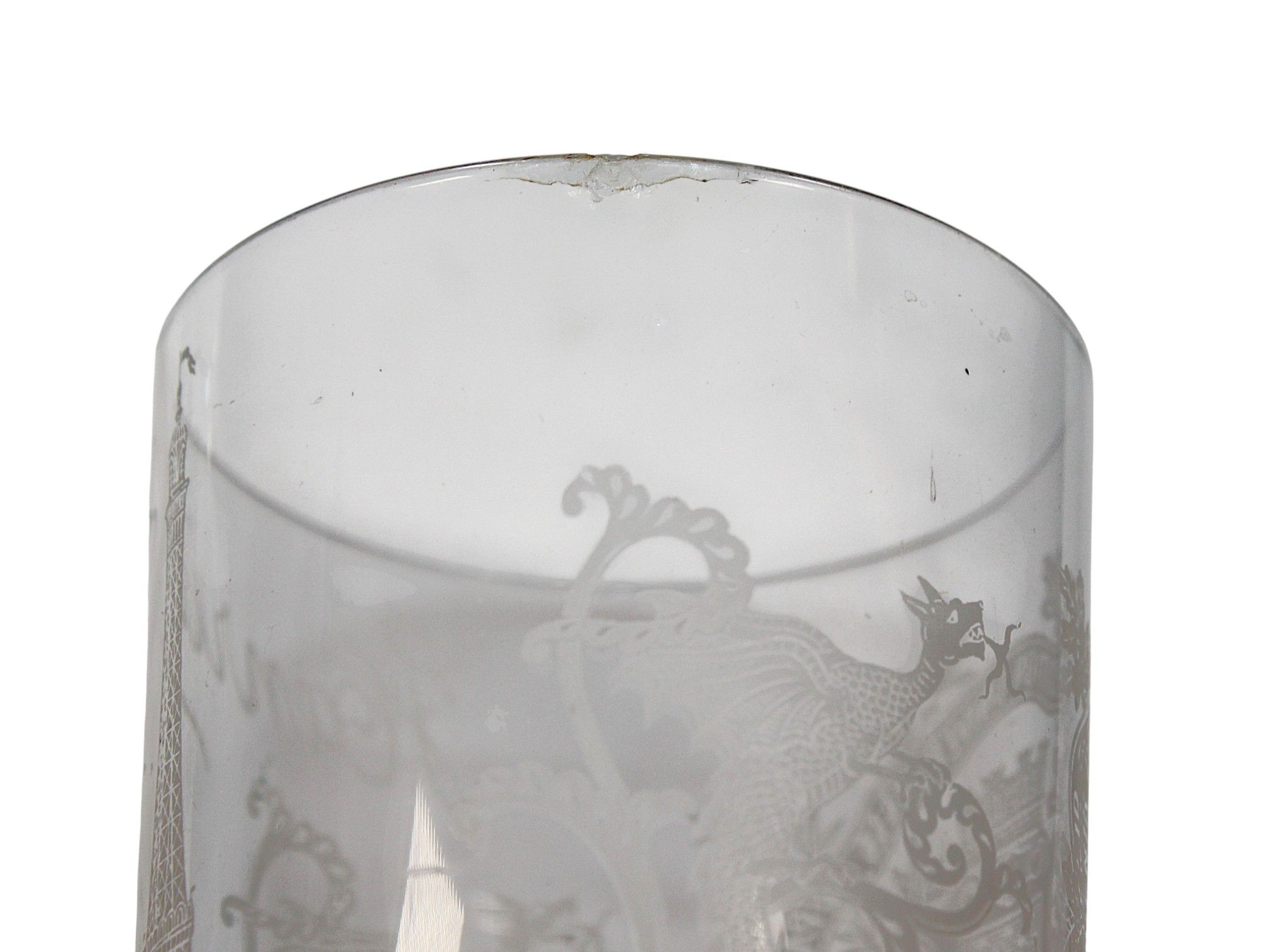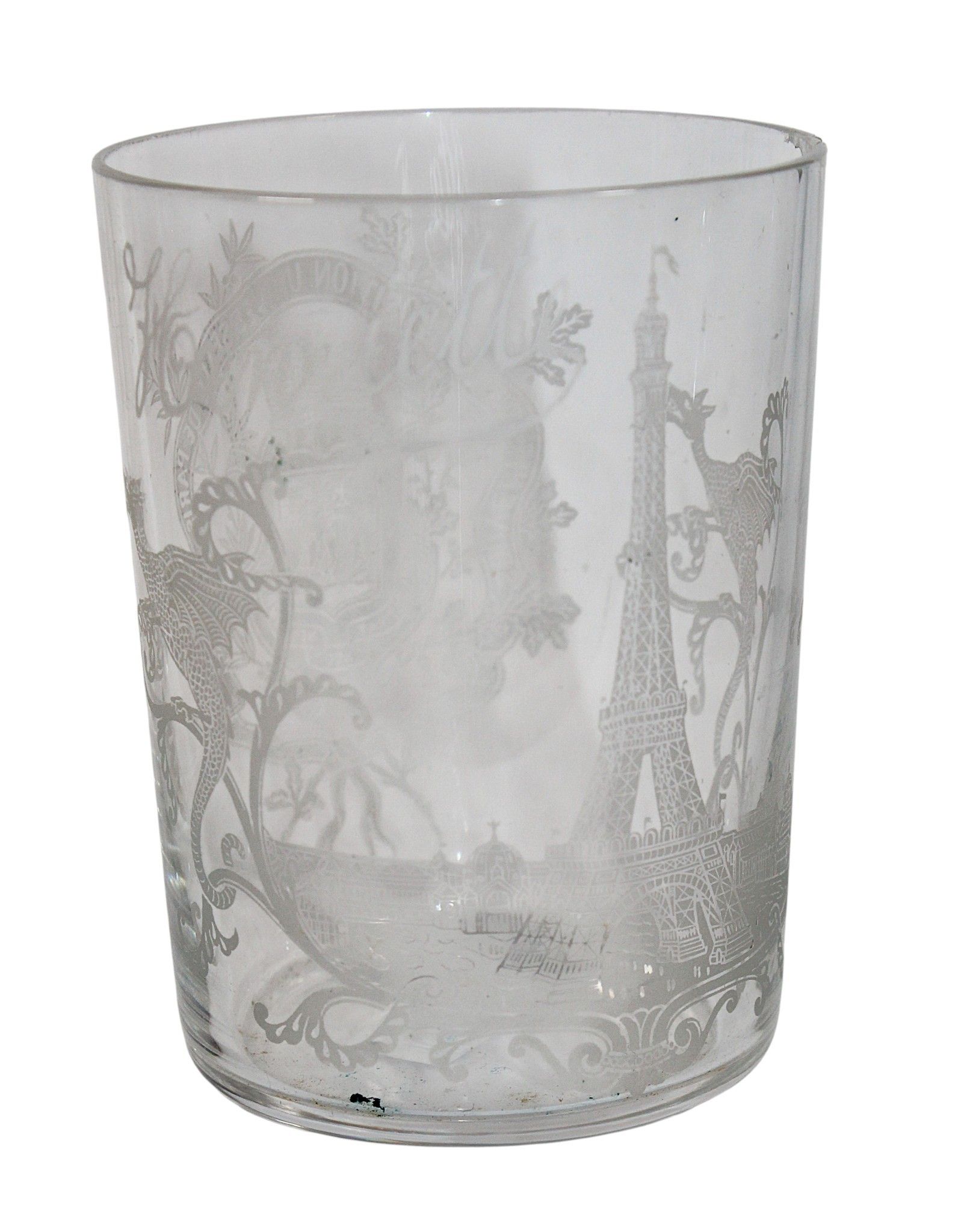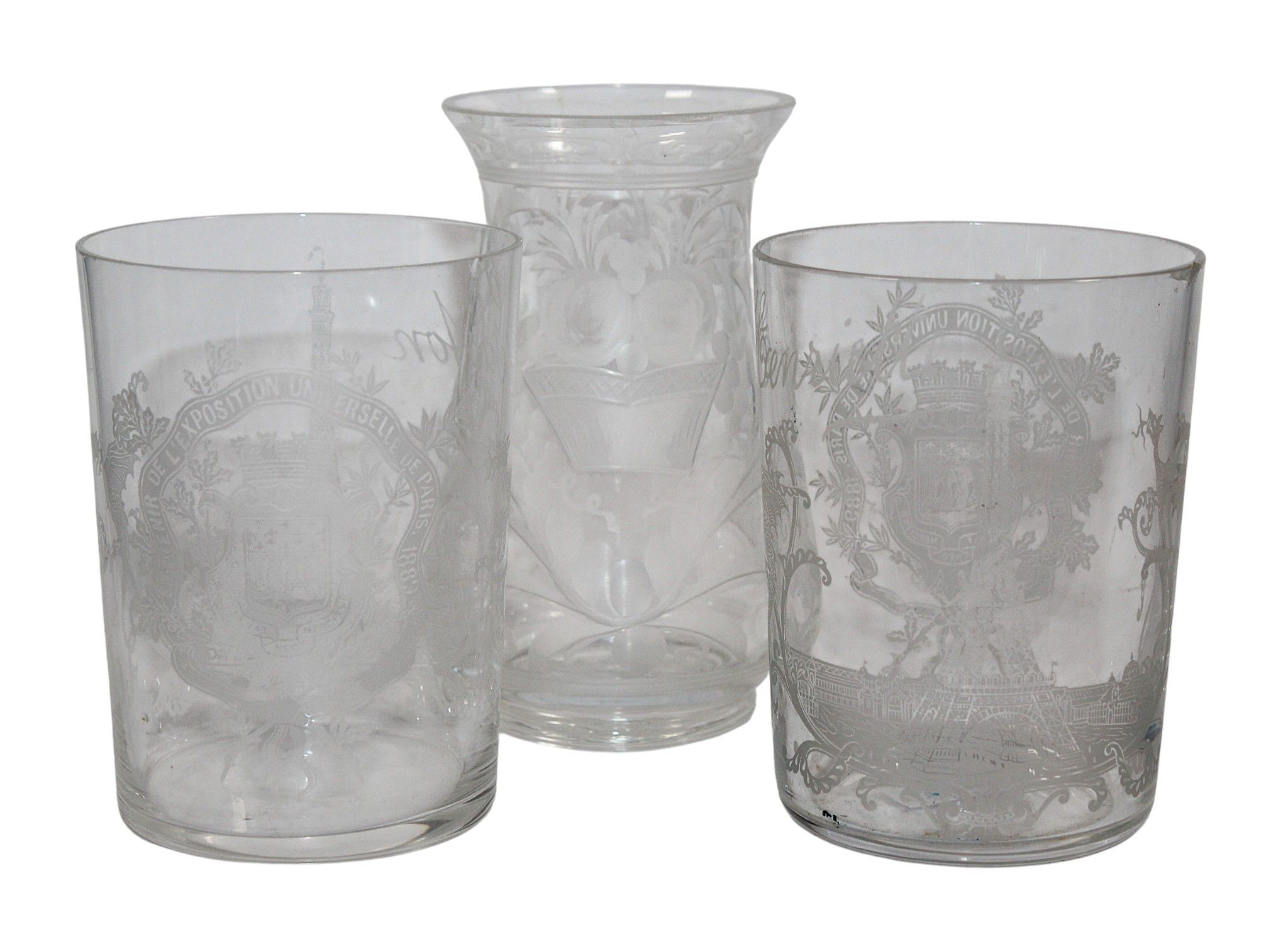 EXPOSITION UNIVERSELLE DE PARIS, 1889 - Suite de 2 GOBELETS en cristal à décor dépoli figurant la tour Eiffel (Egrenure sur un col). Joint VASE soliflore en cristal de Bohème, gravé d'une corbeille de fruits, hauteur : 11 cm.