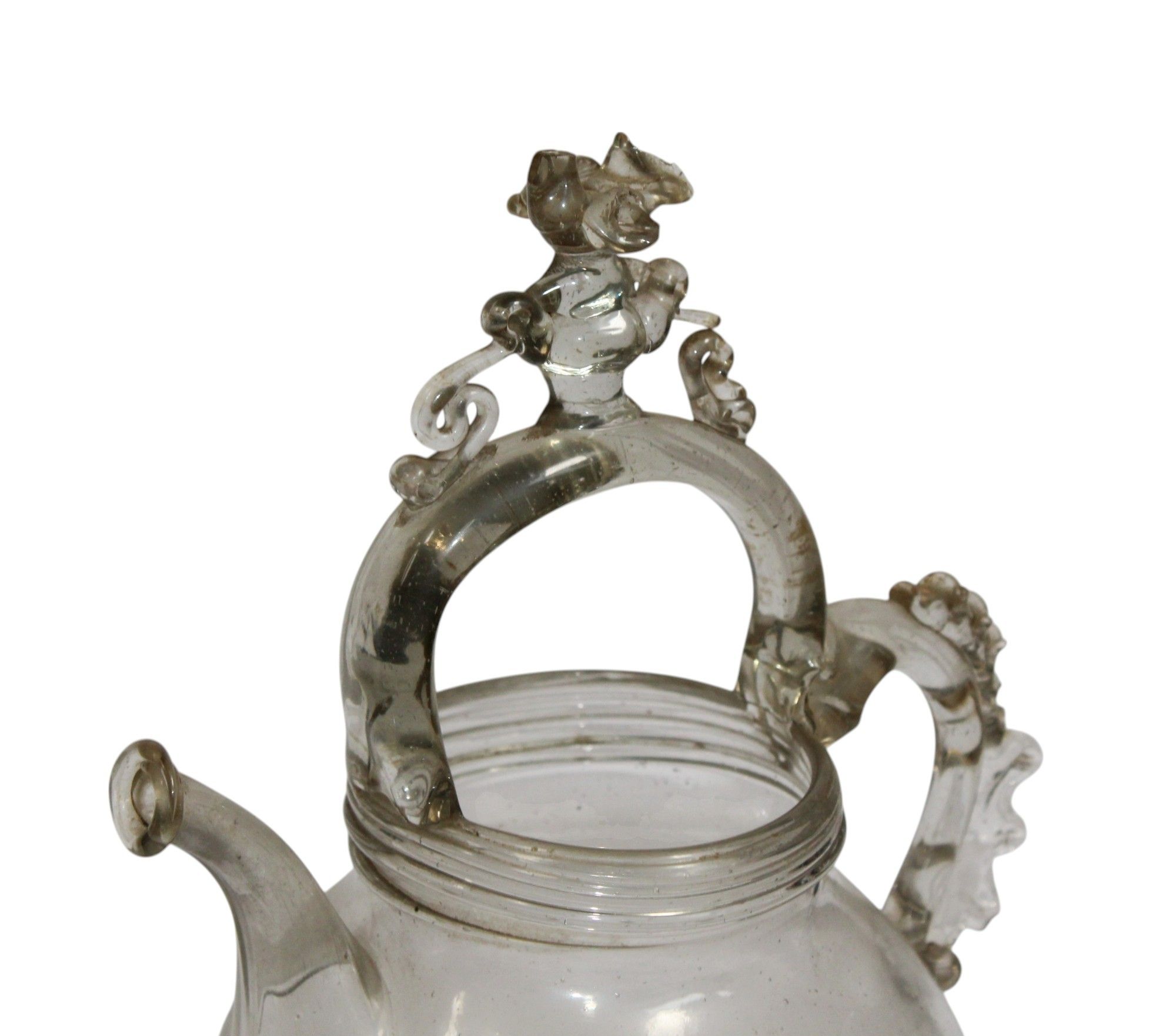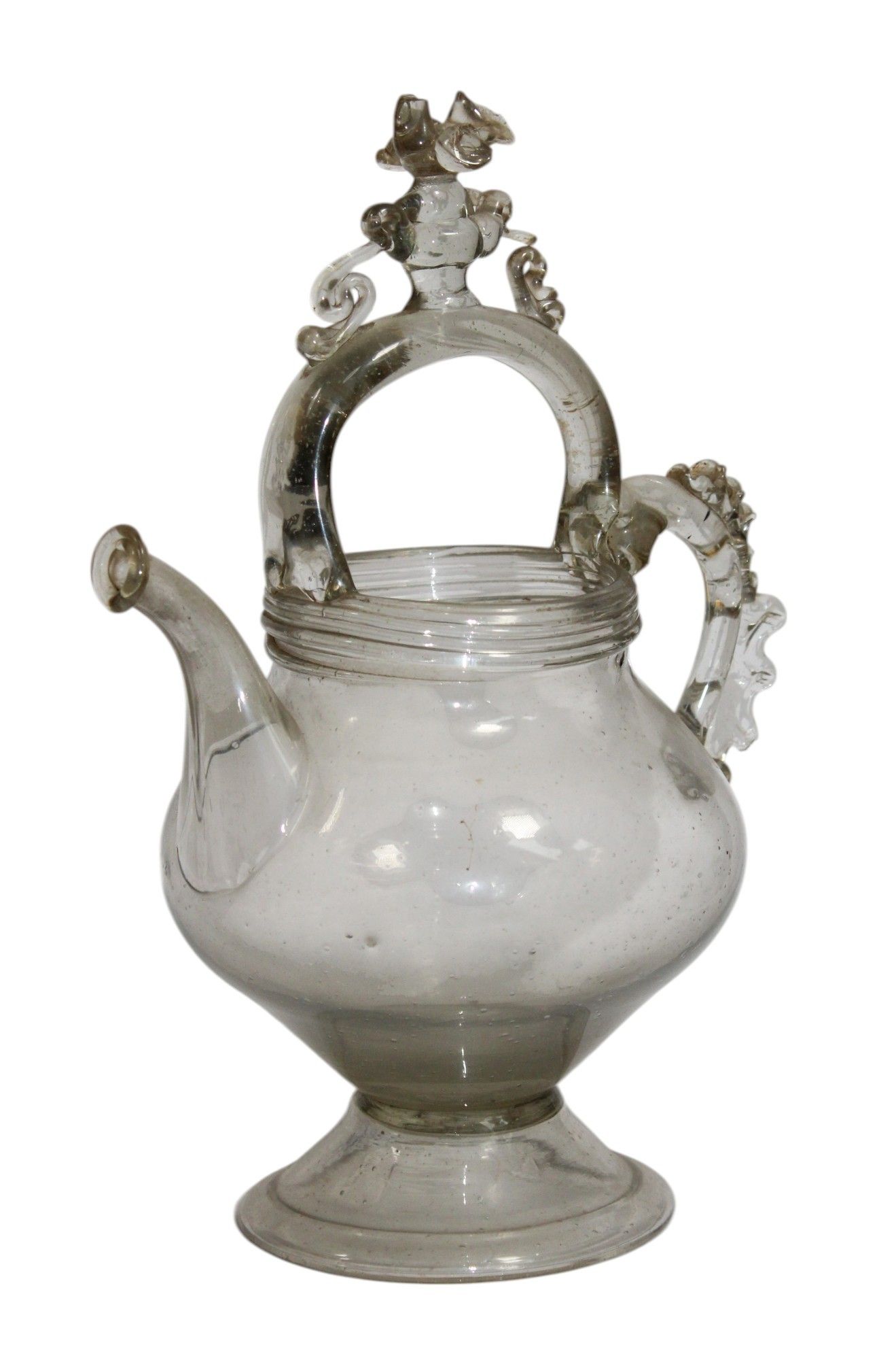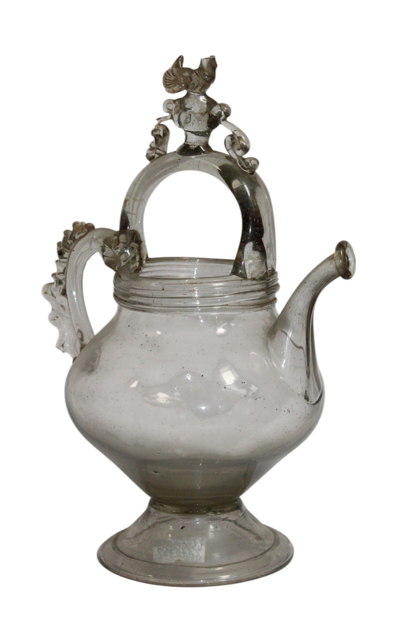 Petite CHEVERETTE en verre soufflé, et décor pincé évoquant un oiseau, repose sur piédouche, pourvue de 2 petites anses, et d'un bec verseur courbe, fin XVIIIème, début XIXème, hauteur : 20 cm. Petits éclats.